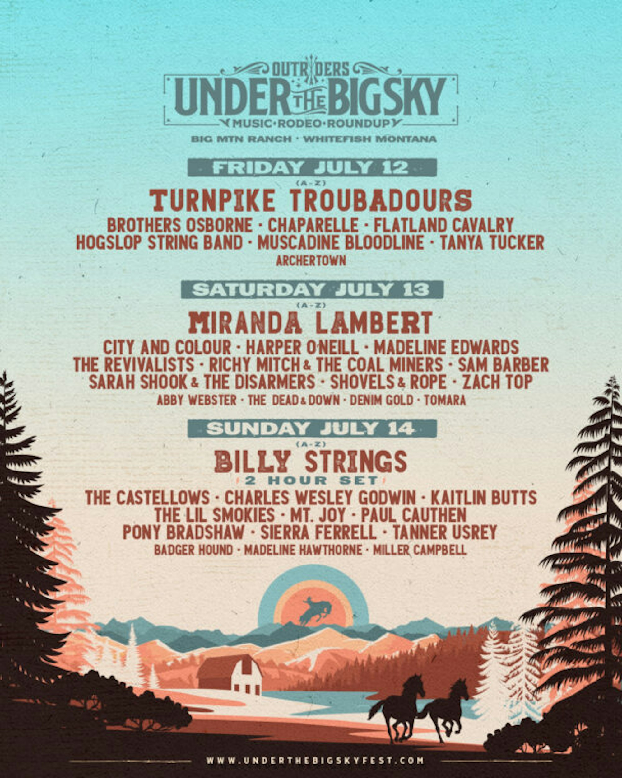 Montana; A state that remains largely untamed by humans. Winding crystal clear rivers lead to picturesque lakes, all towered over by majestic mountains standing tall and powerful. An untouched landscape like this is a rarity in our ever-growing world, drawing many to its expanses to ski, hunt, and fish. This adventurer’s paradise, with its expansive landscapes, provides an ideal experience for those who enjoy the waves of sound. In such a sound-desolate land, music becomes more authentic, unobstructed by the underlying hum of more populous areas. Under the Big Sky takes advantage of this unique setting, inviting attendees to a stunning 350-acre ranch to camp and enjoy classic Americana stylings from Billy Strings, Turnpike Troubadours, Miranda Lambert, and more.