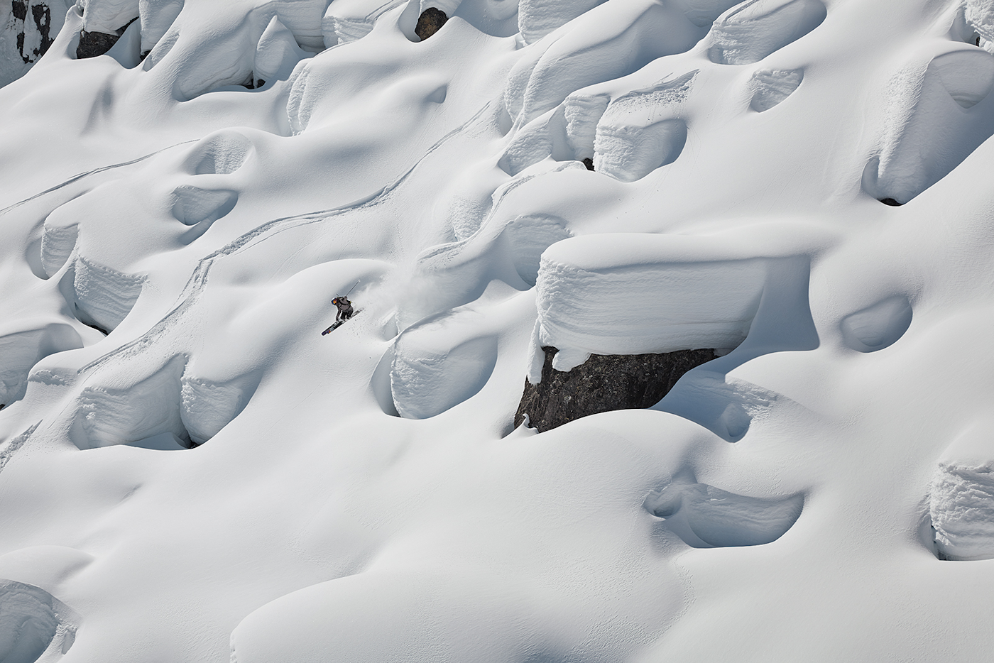 Monod drops in first. She surfs the couloir from side to side—cold smoke snow swelling over her head with each transition—before speeding through the chasm like a bullet leaving the barrel of a gun. She cleans the run from top to bottom.