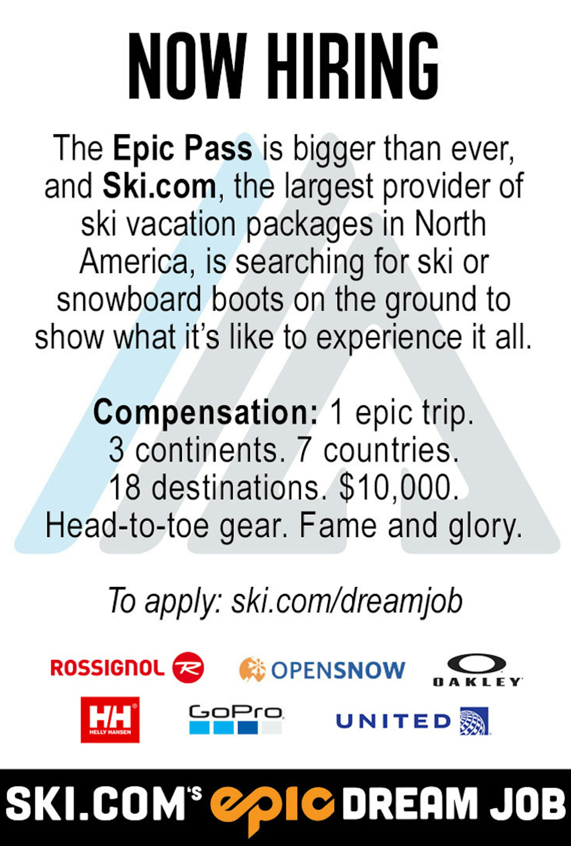 North America’s largest ski vacation provider, Ski.com, has partnered up with the Epic Pass to develop what might possibly be the most epic of dream jobs to celebrate the pass’ 10-year anniversary and its 65 destinations around the world.