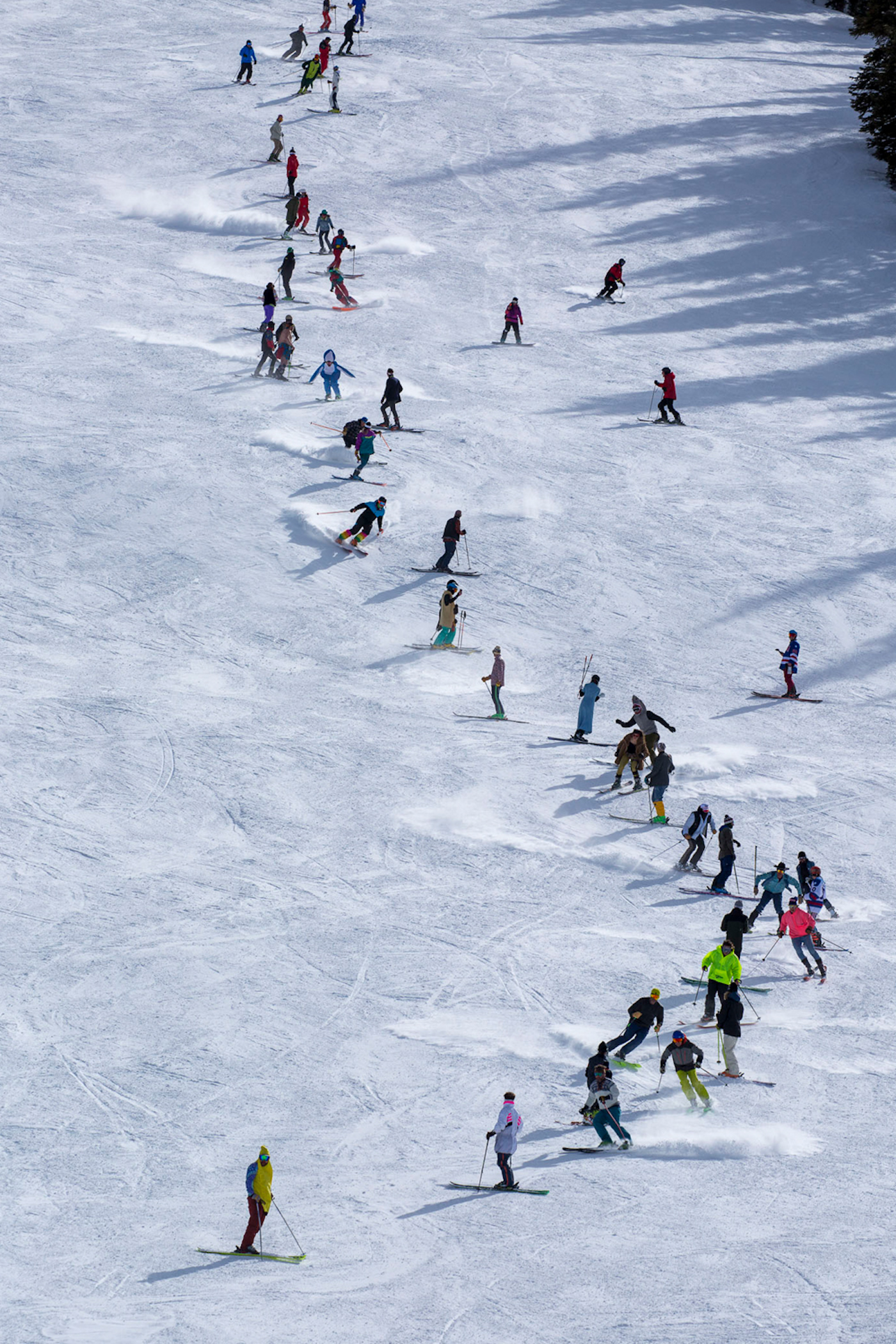Alas, the highlight of the week came on Wednesday. Nothing can beat the beautiful, organized chaos that occurs amidst a ceremonious human slalom. Hundreds joined our swarm down Snowmass’ Wineskin trail, where humans stood as slalom gates and the shrill hooting and clanking of ski poles by its participants struck terror into the hearts of civilians across the entirety of the mountain. Bystanders watched in awe from the chairlift above as skiers navigated within inches of one another down the slope. It was a truly self-aware display of skiing’s essential and non-essential dichotomy; its true nature.