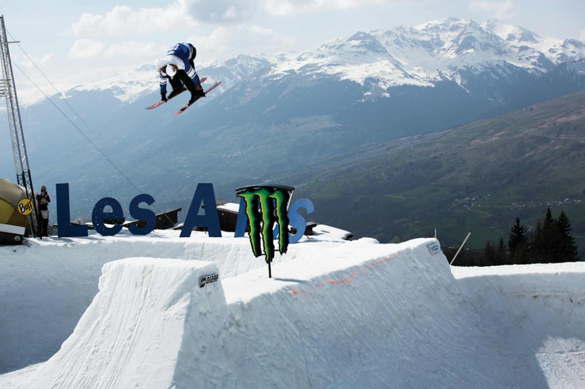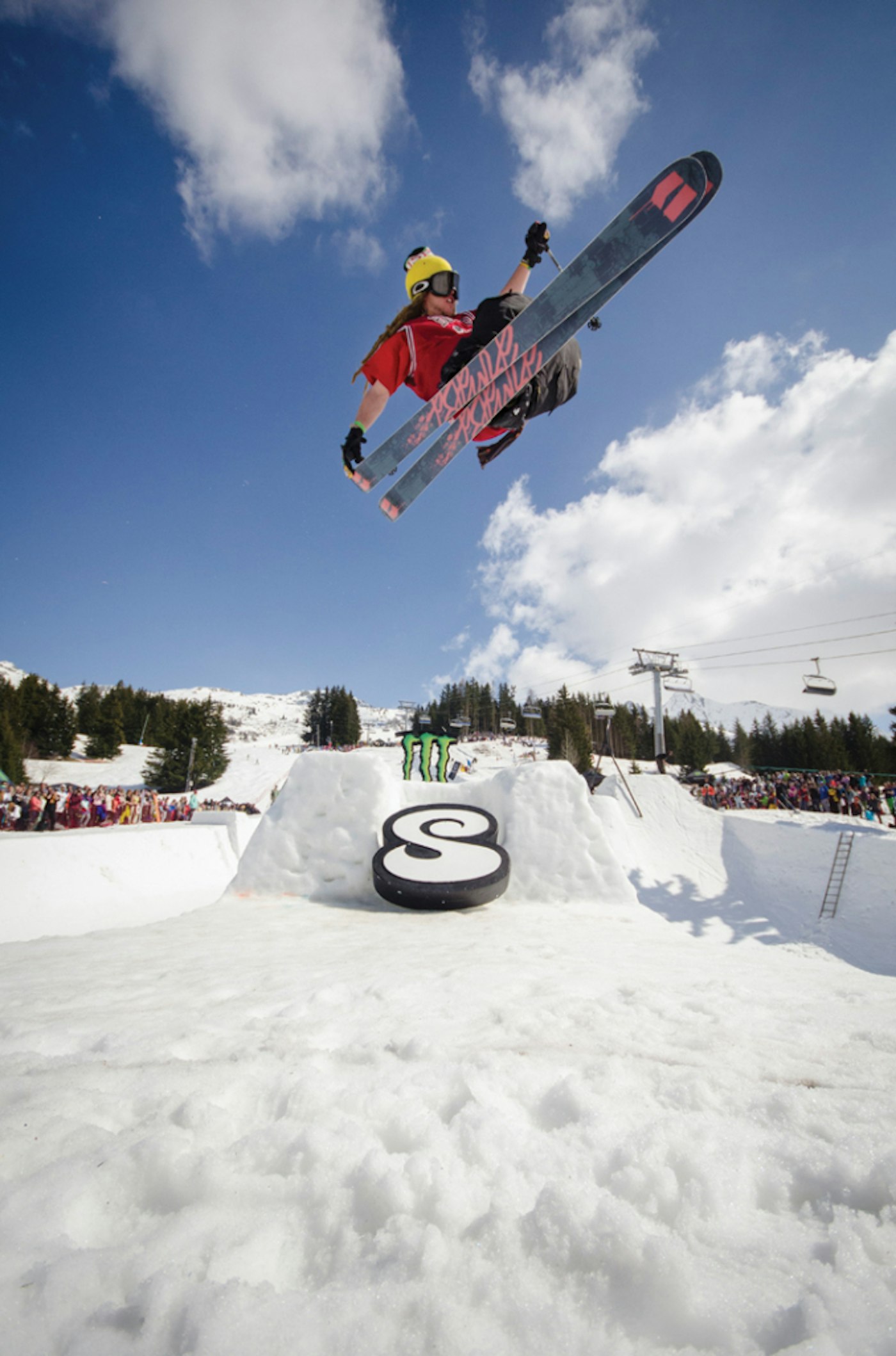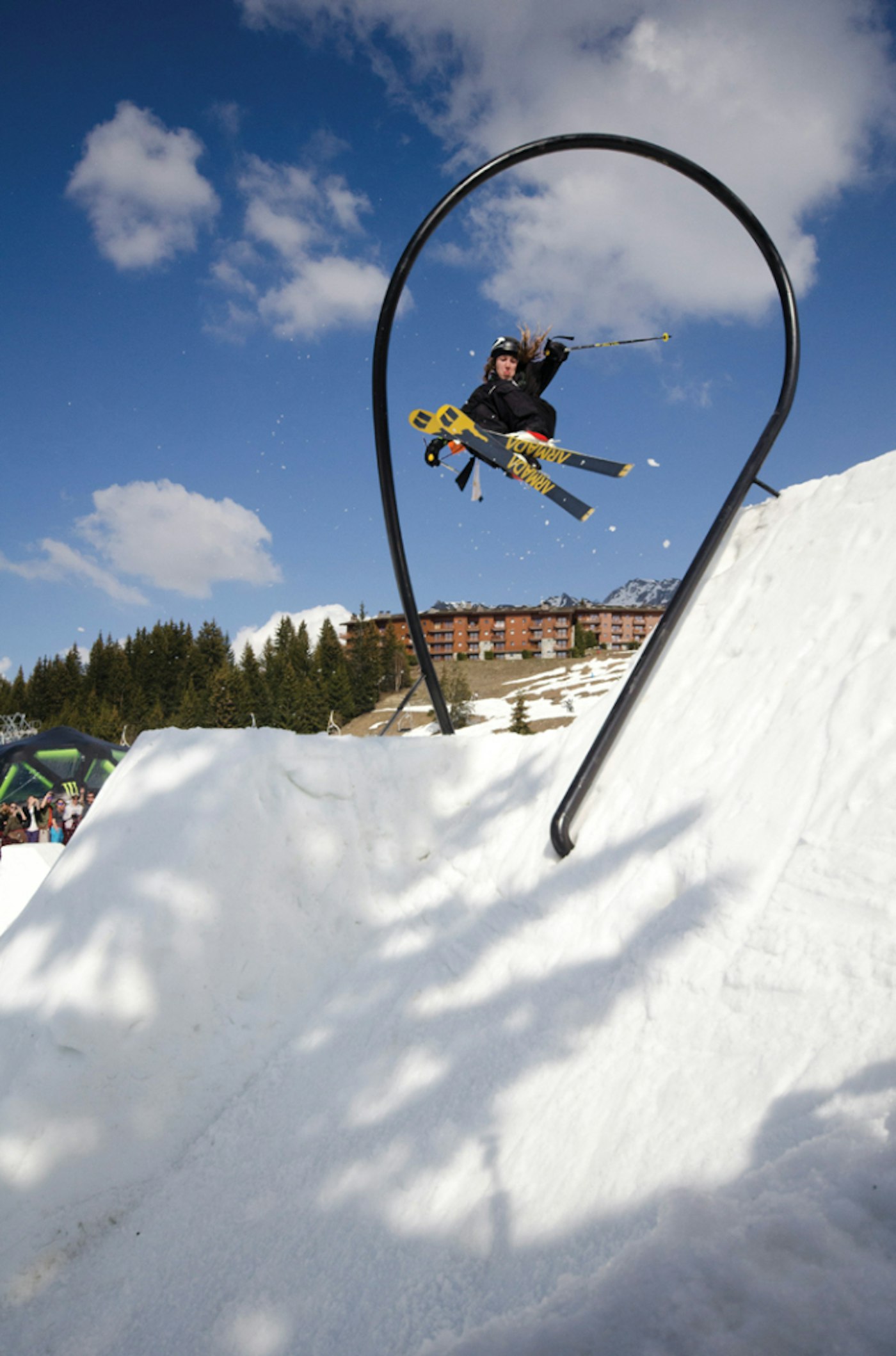 After practice, we caught a bus to another part of Les Arcs for a private hors d’oeuvres function at an après-ski bar with vaulted ceilings stanchioned by old-growth pine. It wasn’t long before a bottle-cap snapping fight broke out between the loft and the dining room floor, serrated projectiles whizzing over the heads of local dignitaries and a pair of well-endowed Monster girls whose English glossary seemed limited to one phrase: “You wish to take picture with me?” On the bus ride home, P-White nearly lost a tooth when the driver maliciously slammed the brakes during Parker’s grab rail pull-up exhibition.
