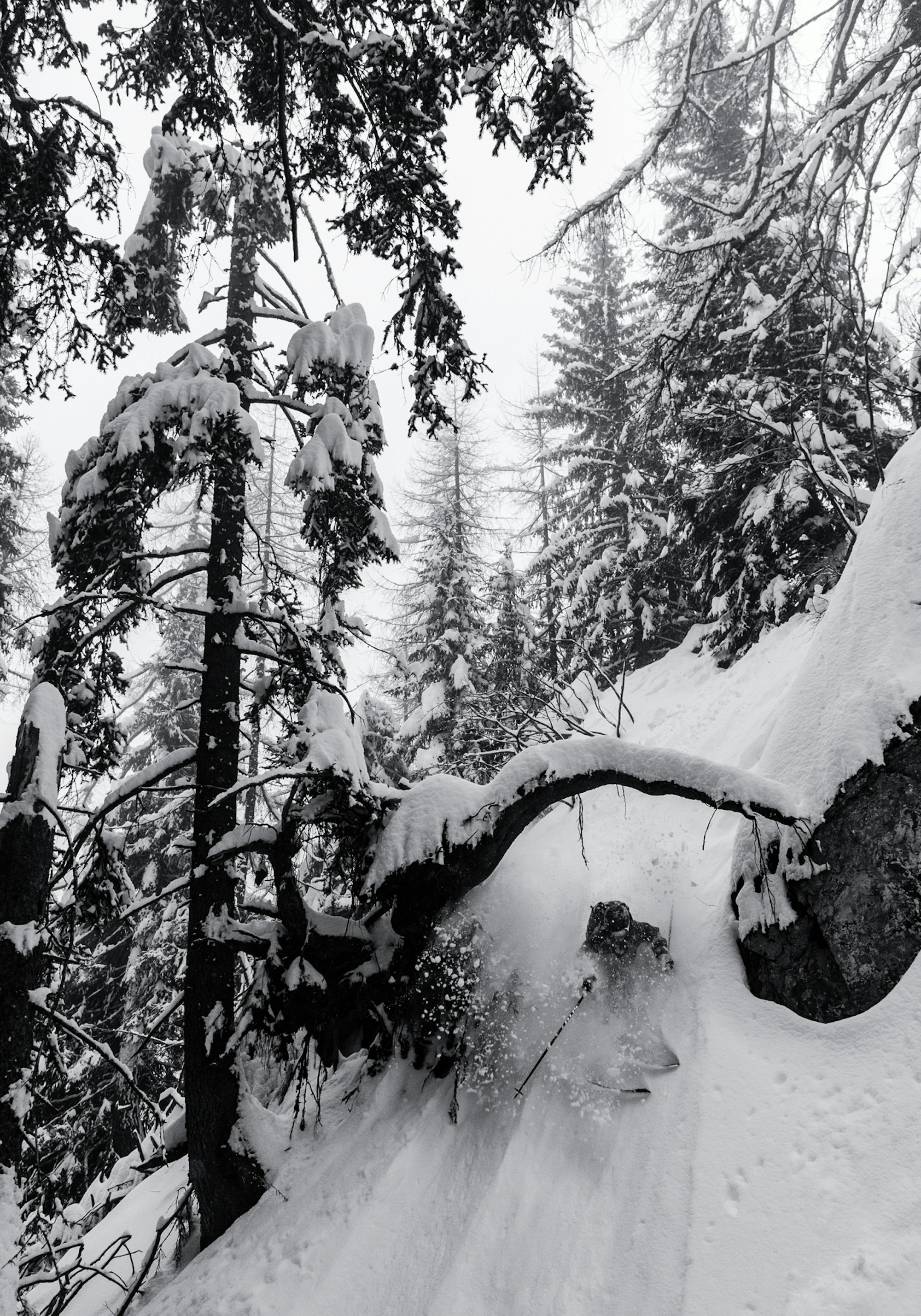 Hitting treeline as you descend from the alpine is an interesting introduction to the forest, zigzagging around a welcome mat of krumholtz and other tightly packed manifestations. But as you move downslope and larger trees prevail, things open up… though never enough to make the next move completely obvious. And this is where the “game” takes over. Even where you can see around them, tree skiing is still all decisions, discovery and endless permutation. You make a turn around one, a new line comes into view and suddenly everything looks different; your next turn repeats the trick; then it happens again, much like a high-speed video game testing both your reflexes and processing powers. All the while the slope uncoils over the natural contours of the mountain, connected by lines that follow the logic of topography and water—a logic, you learn, that trees follow as well.