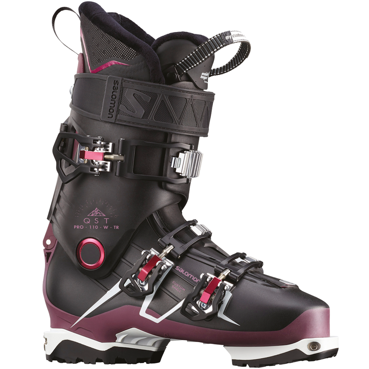 Sleek, sexy and chock full of innovative design features, the QST Pro 110 TR W is here to take your skiing to new heights. Salomon’s EndoFit tongue is the biggest highlight of this boot. Inspired by Salomon running shoes, the plastic tongue attaches directly to the liner, and overlapping plastic in the cuff cinches down across the tongue via a single buckle-powerstrap combination. This provides better wrapping of the foot, an easier step-in process and a smoother flex when charging down the mountain. In addition, the boot’s liner and shell are both fully moldable, yielding a truly magnificent fit. Its hike mode with a 40-degree range of motion and tech inserts make the QST Pro 110 TR W a dependable backcountry or sidecountry boot, too. Note: It comes with Alpine soles in the box for inbounds days.