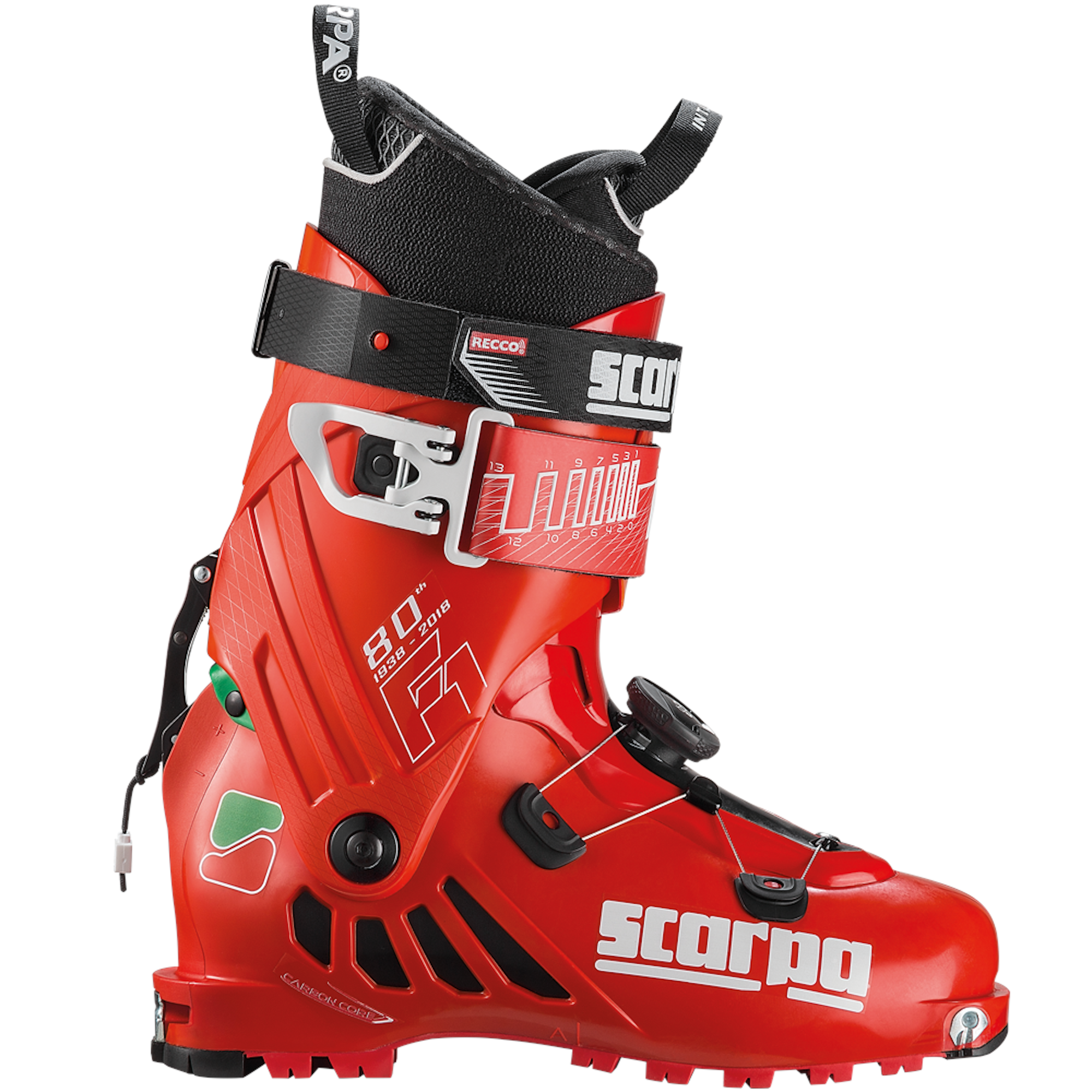 One look at the spicy 80th Anniversary paint job on the Scarpa F1, and you’re bound to start shouting in Italian and book a ticket to the Dolomites. Seriously, dayum those look fast. In terms of purpose, the F1 is an aggressive yet weight-conscious backcountry skier’s dream. The boot weighs in at 1,219 grams while maintaining a 95 flex rating, which is rare for such a light boot. Scarpa achieves this with a carbon fiber frame that goes under and around the sides of the boot, running the length of the foot and providing stiffness without bulk. A BOA closure on the lower boot and dual power straps help cinch the boot tightly, too. On the ascent, a 62-degree range of motion in walk mode makes even the longest slogs a breeze. Note: The regular gray colorway is available for $699.