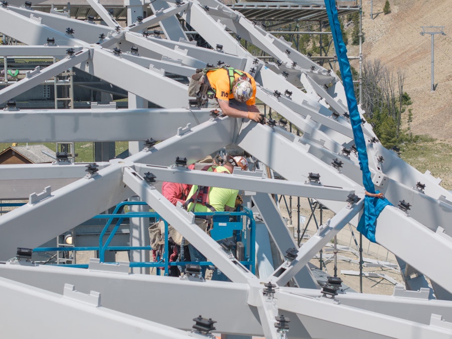 Crew members work to secure steel beams on the new Lone Peak Tram lower terminal enclosure.