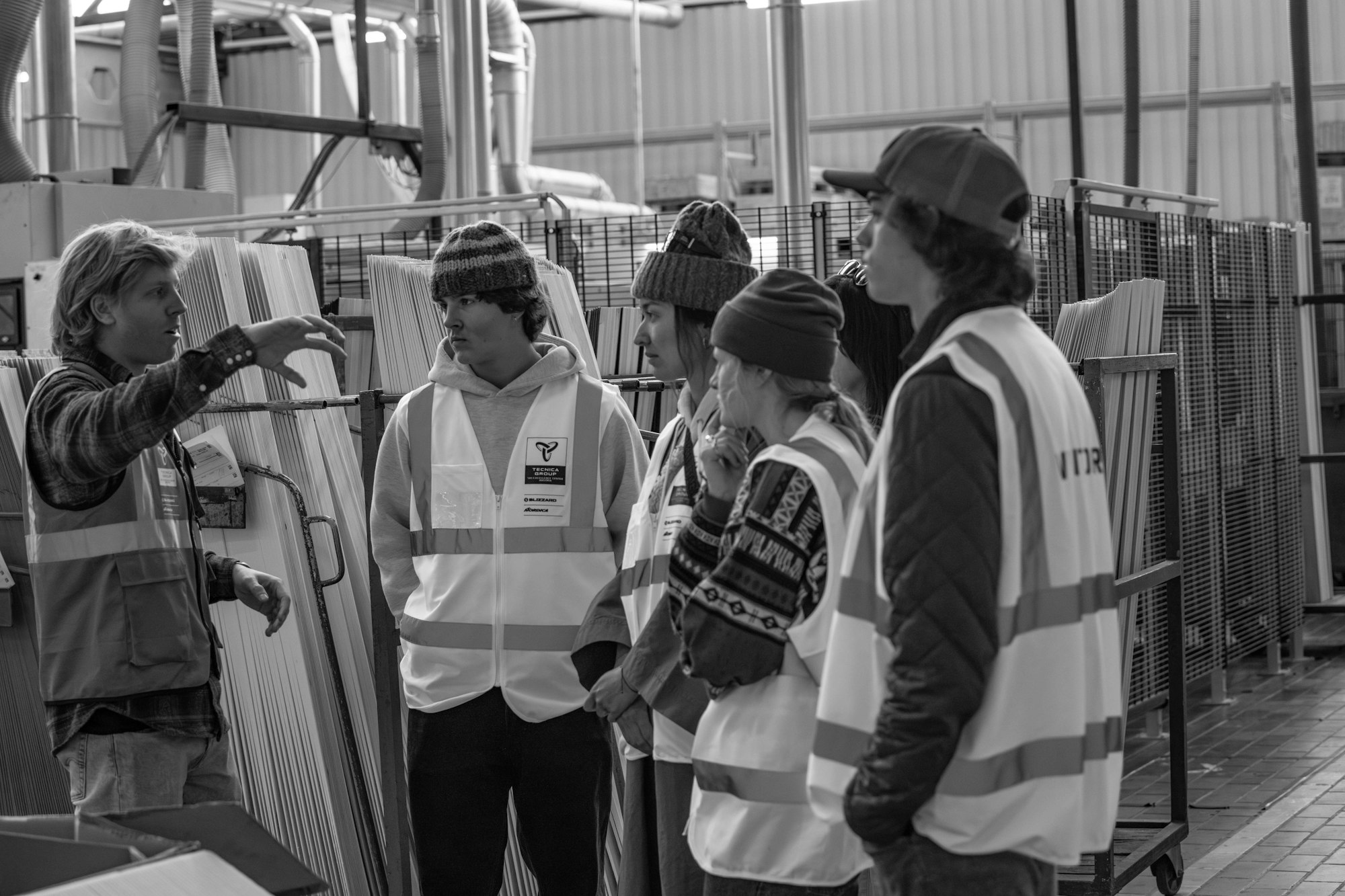 Blizz freeride athletes Zeb Schreiber, Piper Kunst and Noah Gaffney tour the iconic Blizzard factory | Photo: Frank Shine