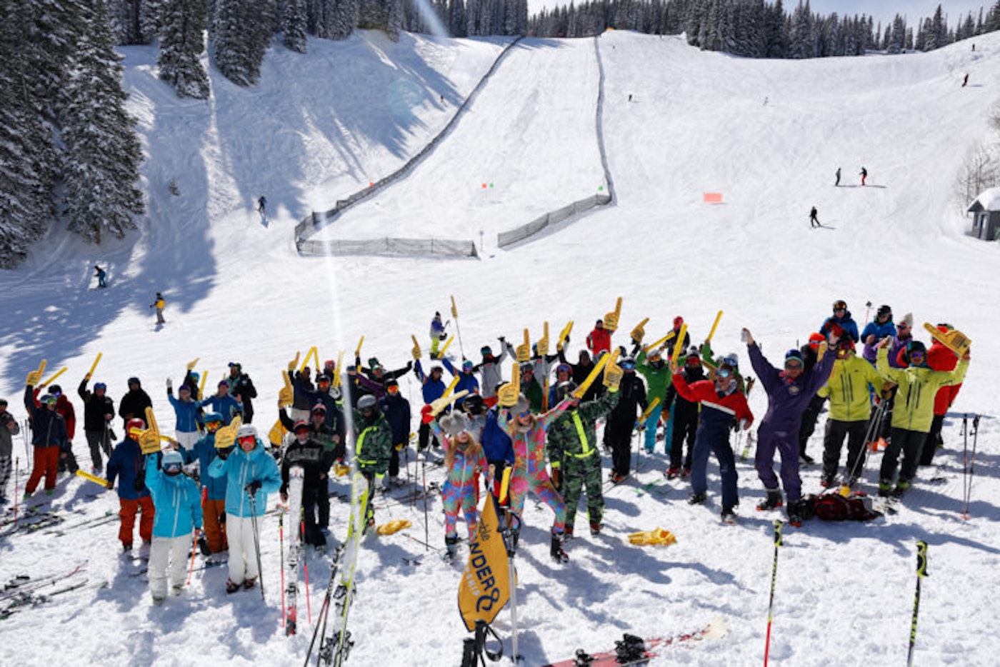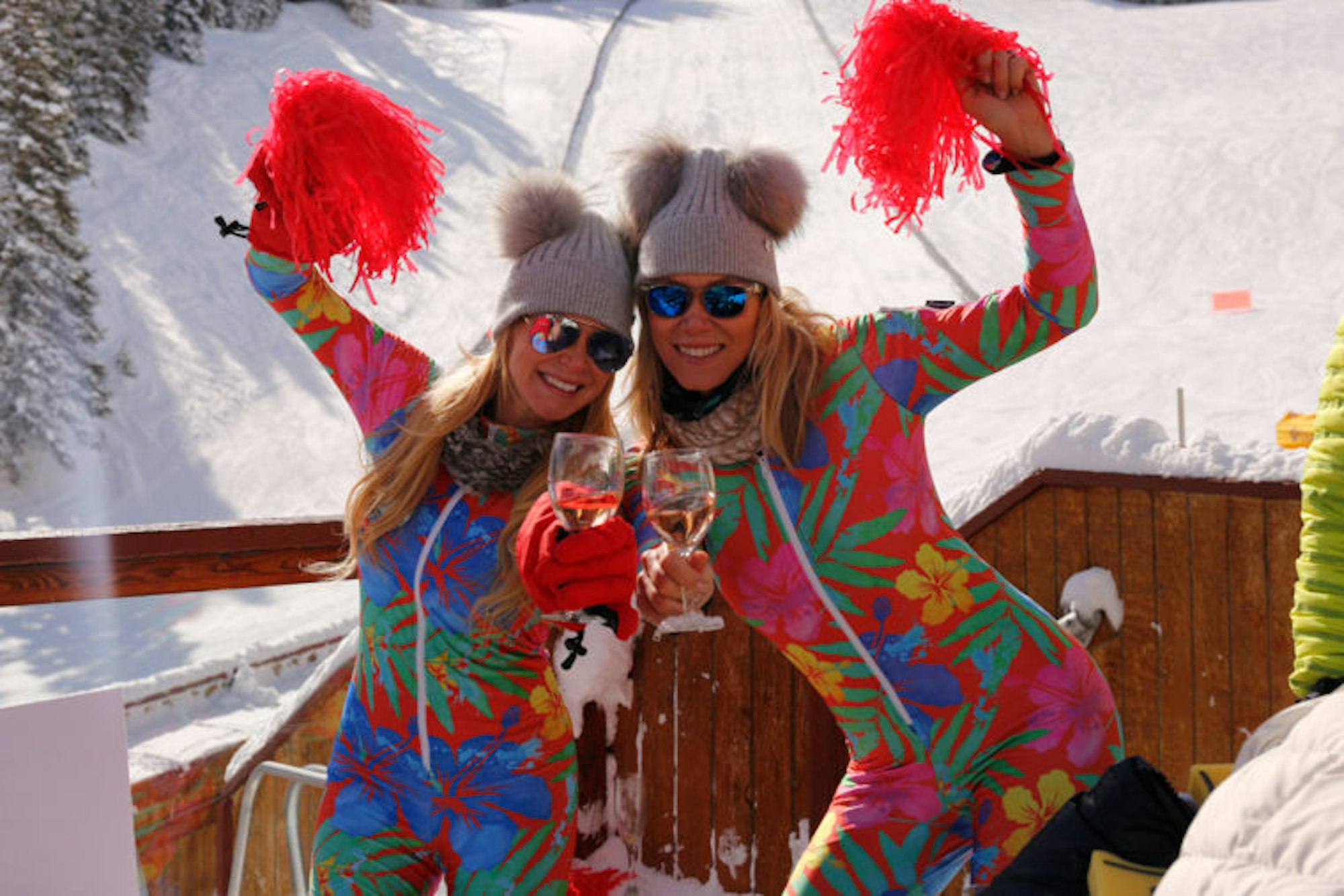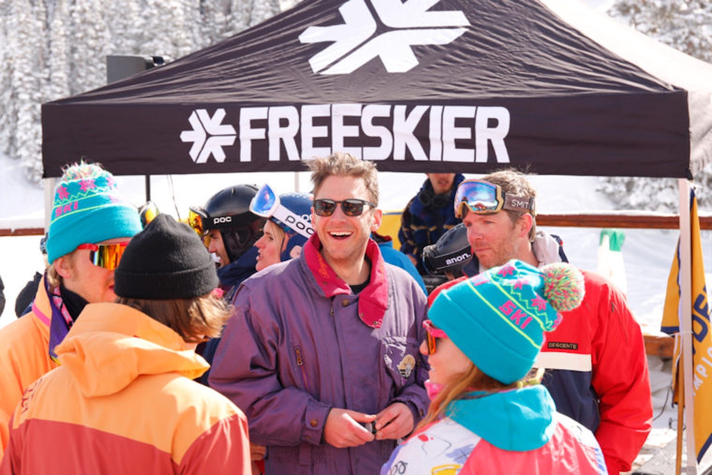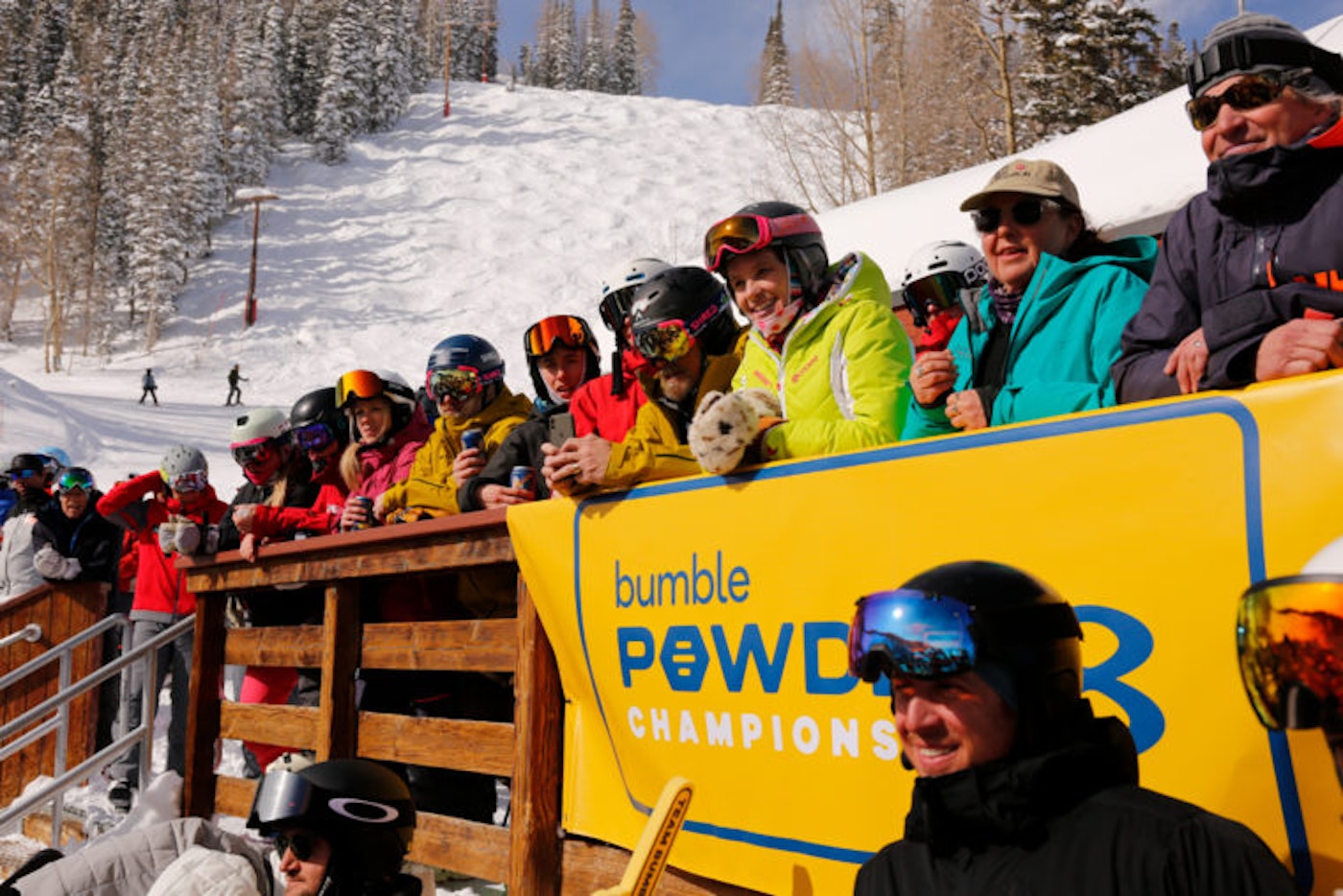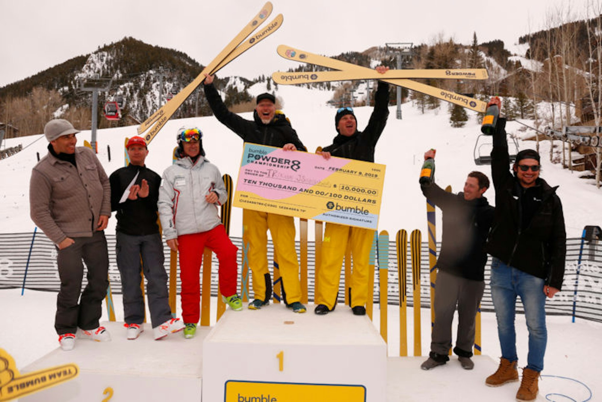 Come Saturday morning, overcast skies clouded Aspen but our spirits stayed high as we were about to witness one of the greatest things in skiing: Powder 8s. Finalists were transported to the backside of Aspen Mountain via snowcat and teams once again battled head-to-head in single-elimination runs judged on fluidity and perfection. At Aspen’s base area Gondola Plaza, a viewing tent with food, drinks and music kept the crowd movin’ and groovin’ while a large jumbotron broadcasted the event in real-time. The inaugural Bumble Powder 8s culminated in a final run that left the winning pair on top by only a single point , and, needless to say, the crowd went wild with every turn of the ski.