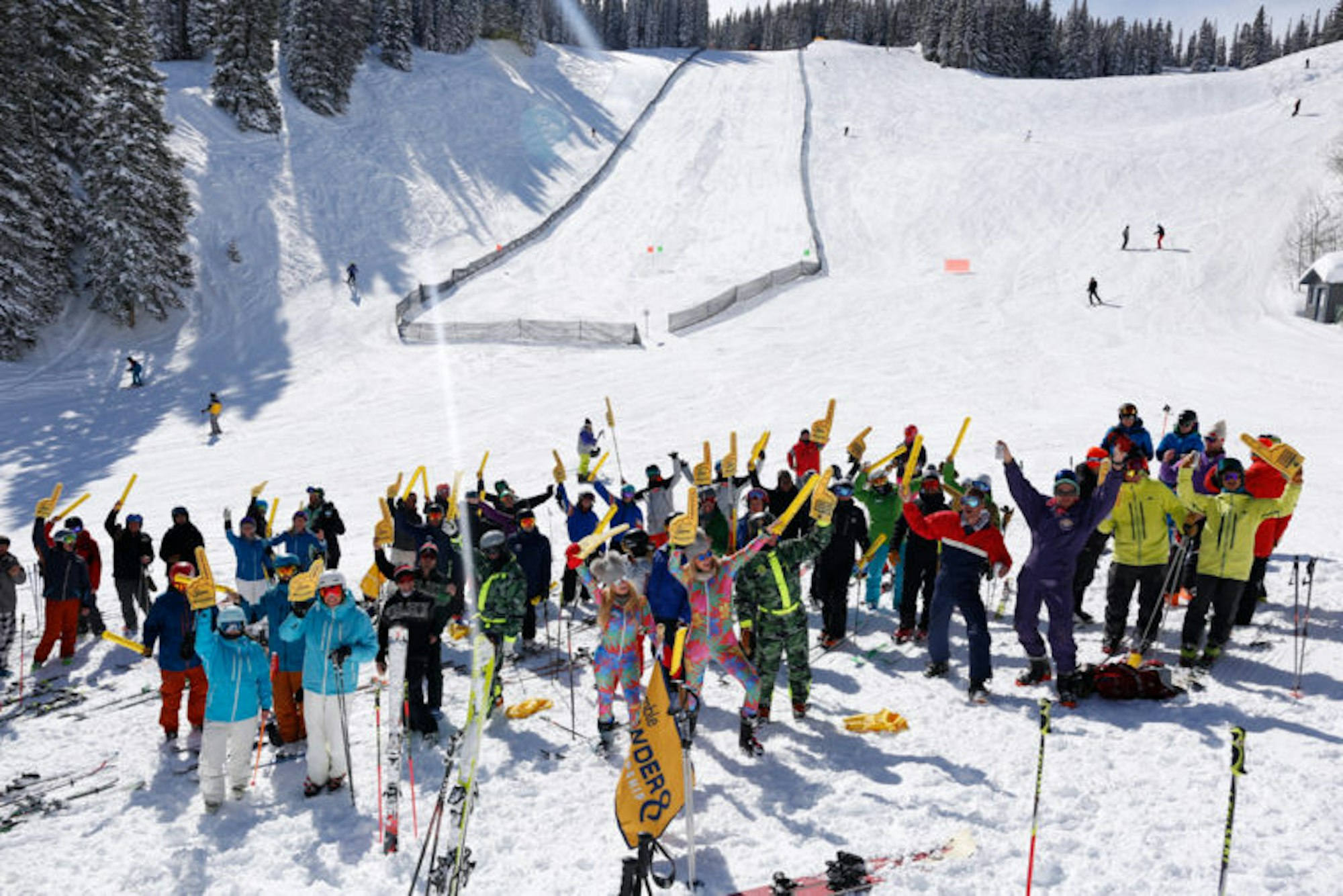 Friday’s event also called for competitors to dress their best for their chance to be awarded hand-painted denim vests from FREESKIER’s Art Director, Gunter Jones. Teams came out swingin’ with matching outfits that made the FREESKIER team proud. Pit Viper’s Spencer Harkins and Mali Noyes had their retro neon on-point; twins George and Bart Flynn from Jackson Hole, Wyoming, went for a matchy-matchy red Gore-Tex getup; and Aspen locals JF Houle and Whit Boucher rocked matching kits from local brand Strafe Outerwear. But “Best Dressed” ended up with two ladies, Amanda Vanderpool and Julianne Murphy, who called themselves Team Haute Sauce and donned bright pink speed suits.