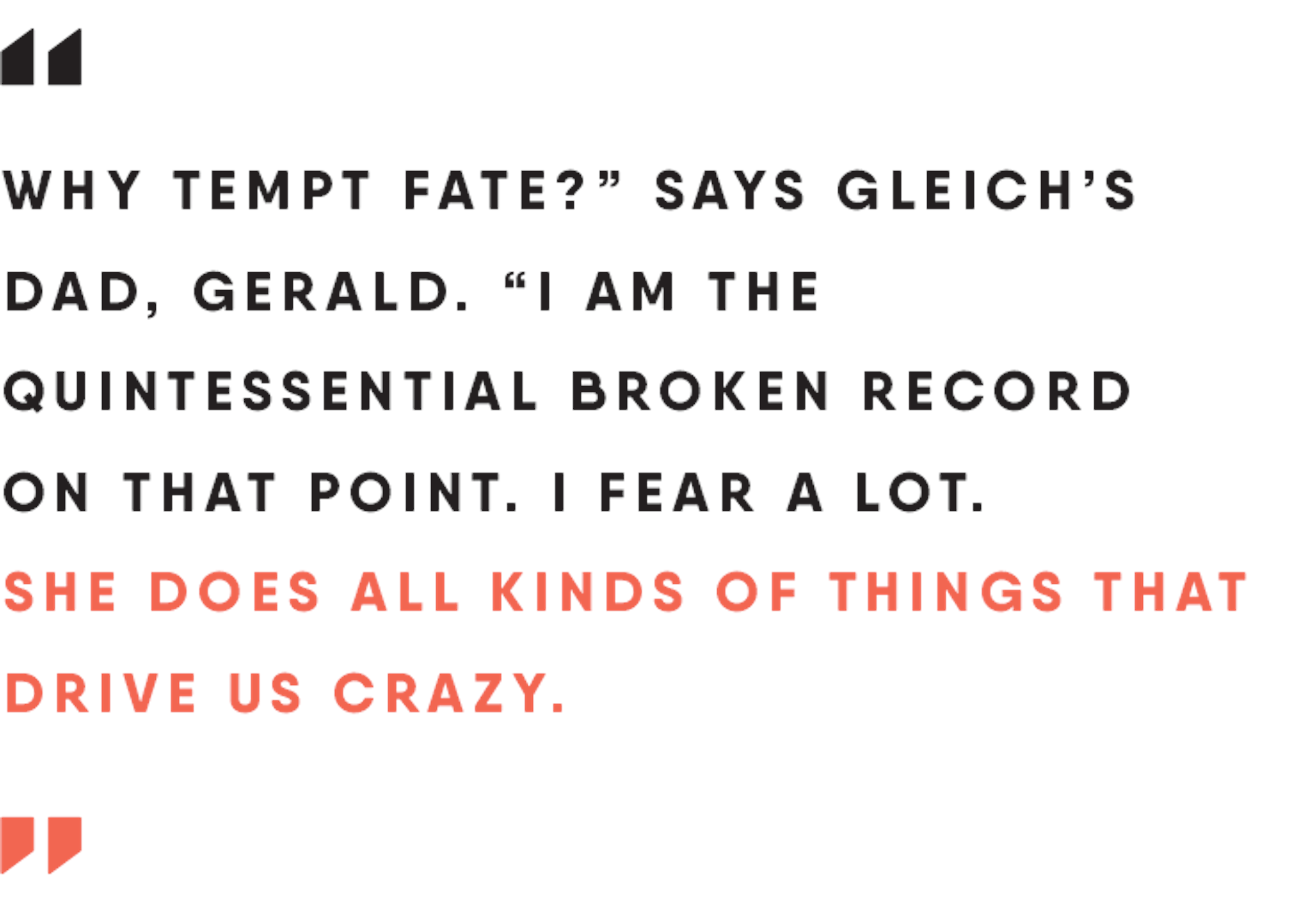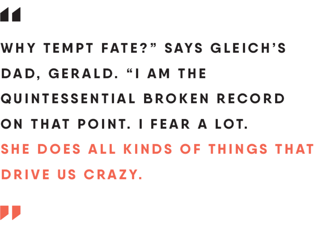 By the winter of 2016, Gleich was back in a good headspace and continuing to check off lines in The Chuting Gallery. That March, she decided the time was right for another emotional challenge. She had to ski the very chute where her brother Martin was killed. “Stairs Gulch isn’t the steepest or scariest line, but it carried all this emotional weight,” she says. She skinned up from Big Cottonwood Canyon in the dark, leaving the trailhead at 5 a.m. alongside her boyfriend and two friends. She summited the peak at sunrise, took a moment to gather herself, then dropped into the funnel-shaped chute. “I felt more at peace about the place and the mountain, but I didn’t feel closure. If anything, it made me relive the loss,” she said afterward. Her parents weren’t thrilled with the idea. “Why tempt fate?” says Gleich’s dad, Gerald. “I am the quintessential broken record on that point. I fear a lot. She does all kinds of things that drive us crazy.” Gleich, of course, knows how her parents feel and that adds to the pressure to stay safe when she’s out in the mountains. “Losing my brother at a young age, I saw what it did to my family, so not coming home or having an accident out there simply isn’t an option,” she says.