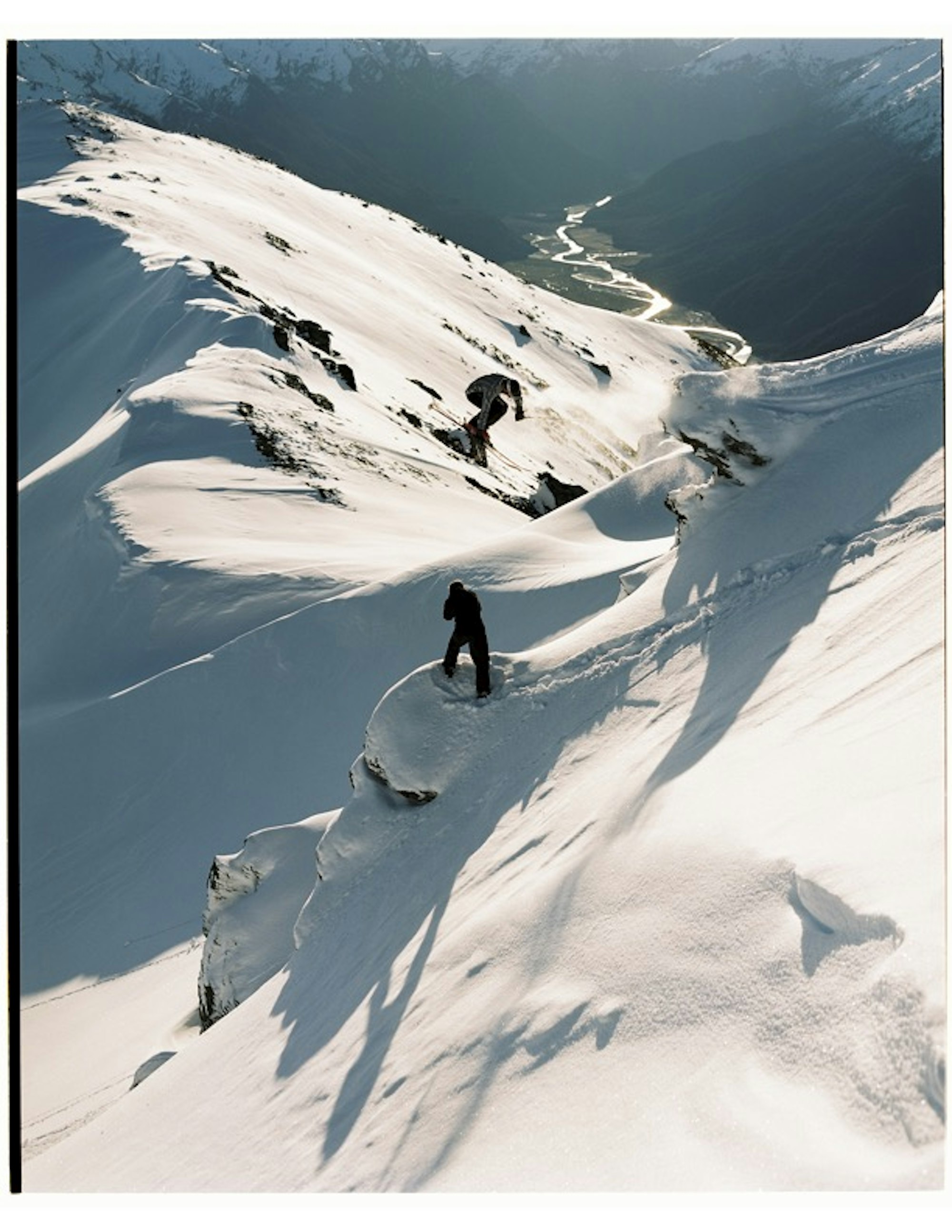 Fortune smiled upon us as a southerly wind swept through, blanketing the station with a generous 10 cm of fresh snow. Seizing the opportunity, we gave the green light to our audacious plan. Finlay, who was flying in from Canada, encountered a small hiccup when his three bags went missing. Luckily, his camera was carry-on, so Fi scooped him and they drove through the night to meet us. Meanwhile, Matt, the photographer, concluded his glacier shoot on the West Coast and eagerly joined the team at the high country rendezvous. The momentum had snowballed and there was no stopping us.