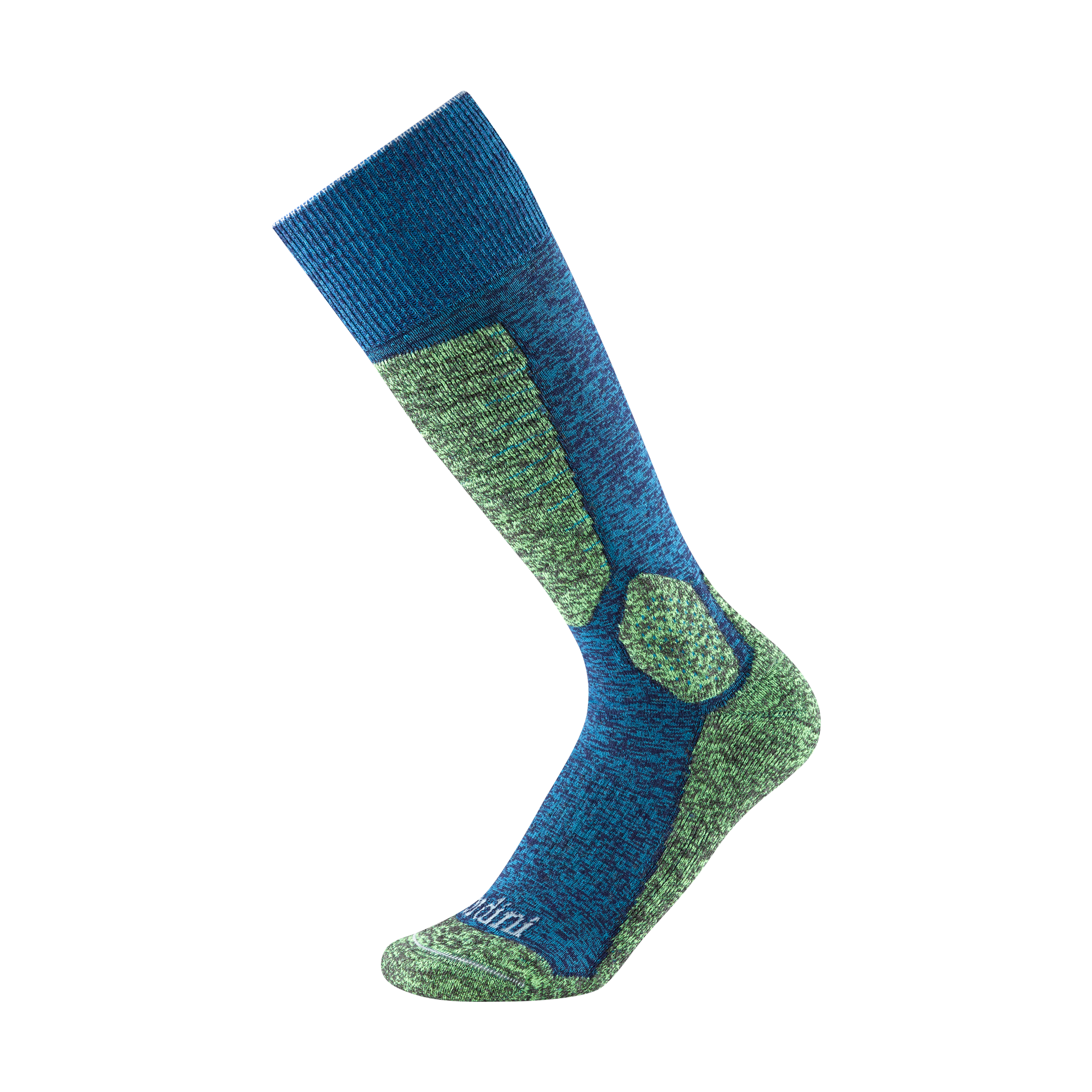 For 2024, the Vermont-based brand introduces four ski socks to the new line, available in both men’s and women’s sizes—heavyweight, midweight, lightweight and ultralight. SoleKnit is utilized in the heavy and midweight socks, but all Gordini socks feature OrbitKnit ribbing technology around the cuff. Traditional ski cuffs rely solely on elastic to stretch and secure the sock around the calf. The problem with elastic is that it is often constricting, leaving uncomfortable marks, and when it fails, the sock essentially becomes useless. With OrbitKnit, Gordini has eliminated the cuff compression issue entirely.