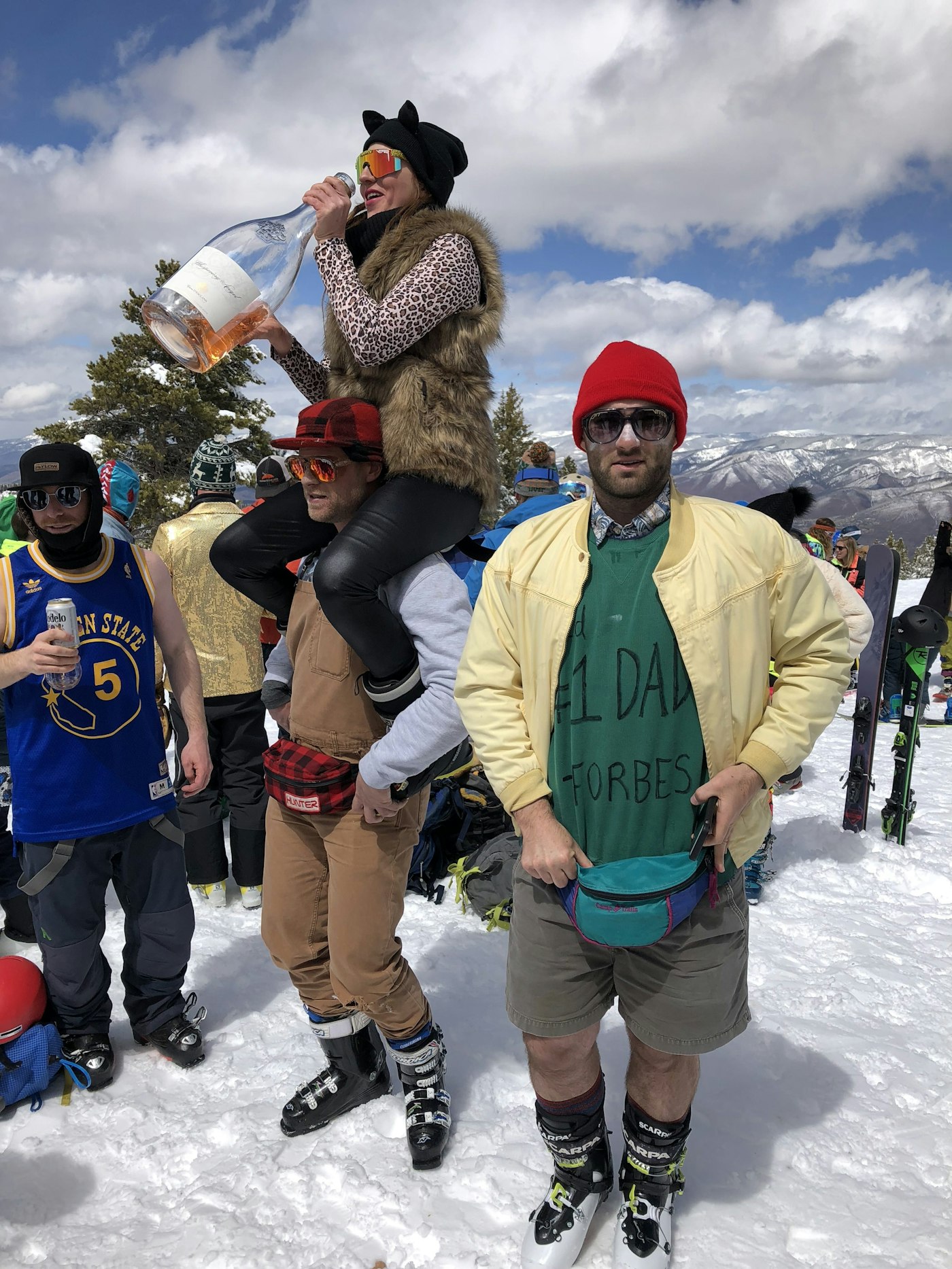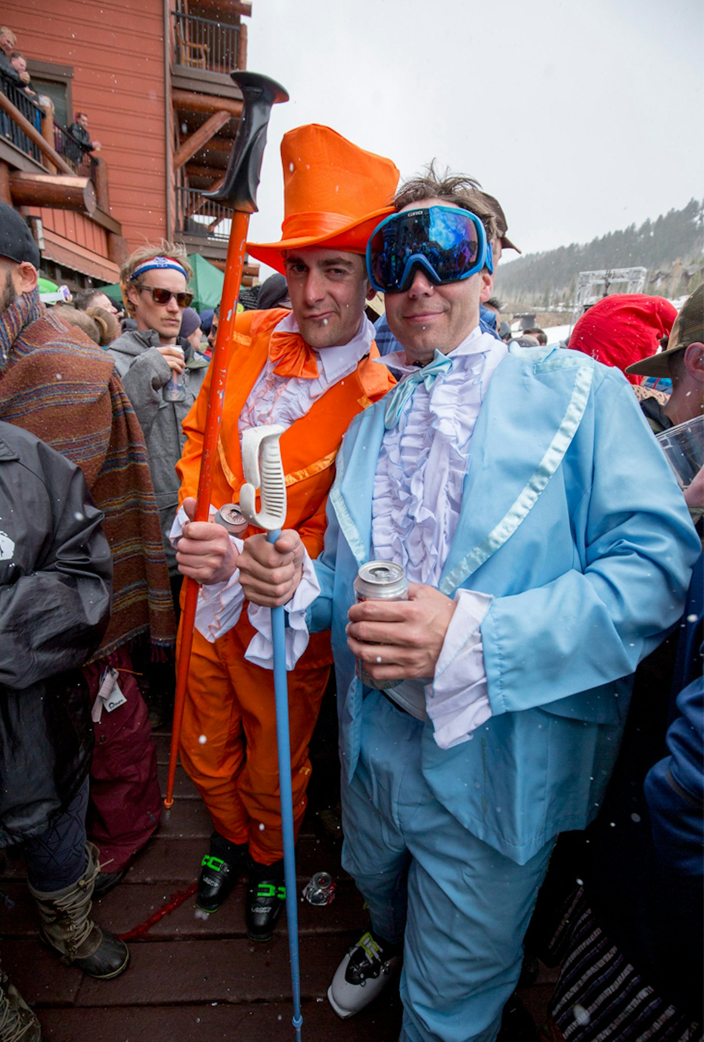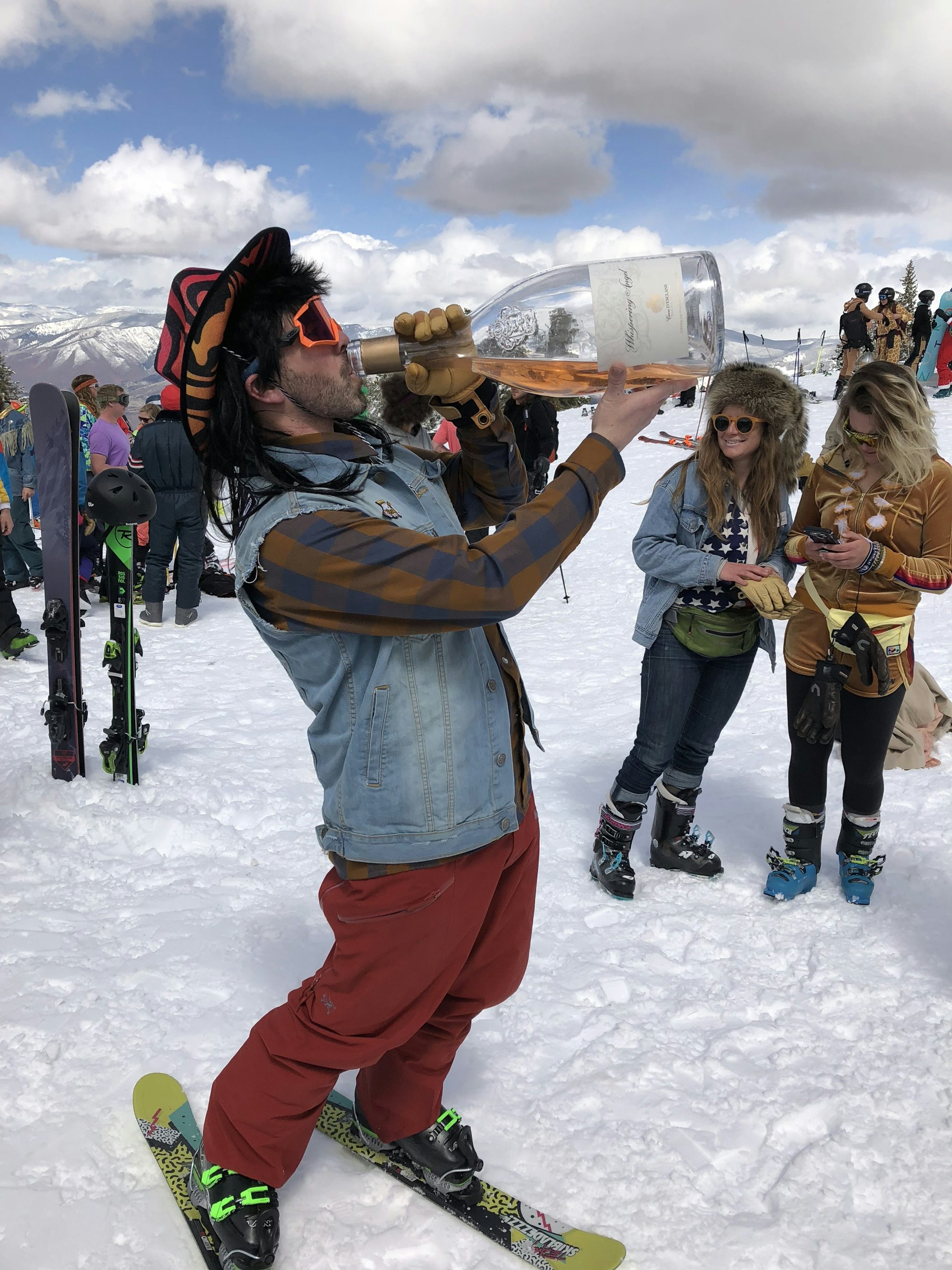 Bears, bunnies, kittens, dinosaurs, flamingos and myriad amalgamations of retro neon could be seen riding each lift, shredding every trail and imbibing on all the patios that Highlands has to offer. Though the bowl didn’t open due to dangerous snow conditions, the annual top-of-the-bowl party was moved to Picnic Point, where revelers gathered by Aspen’s “RESPECT” sign to celebrate another year in the books. Stories of pow days gone by and plans for the spring ahead were told in between group photo ops and swigs from an absolutely massive bottle of Rose.