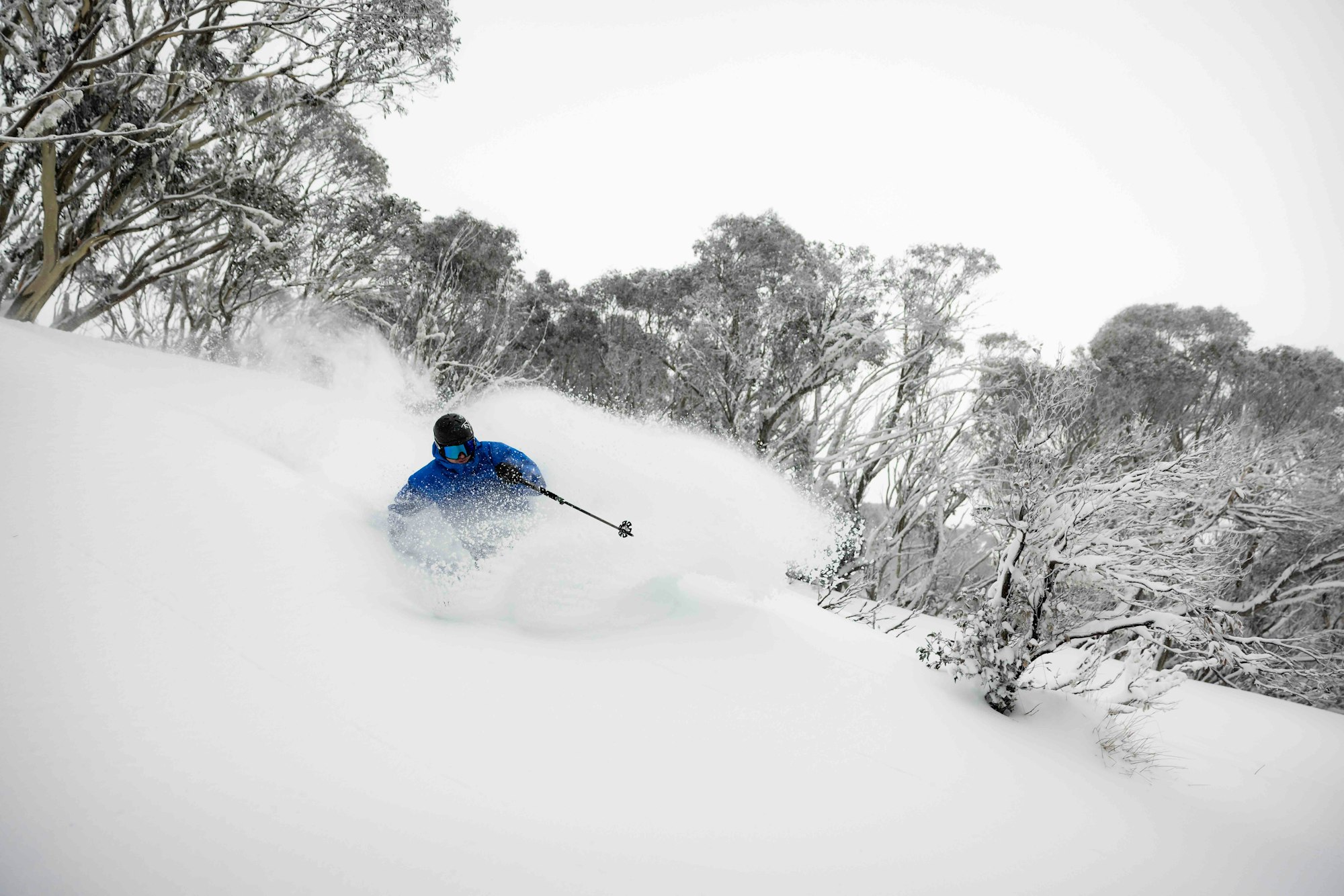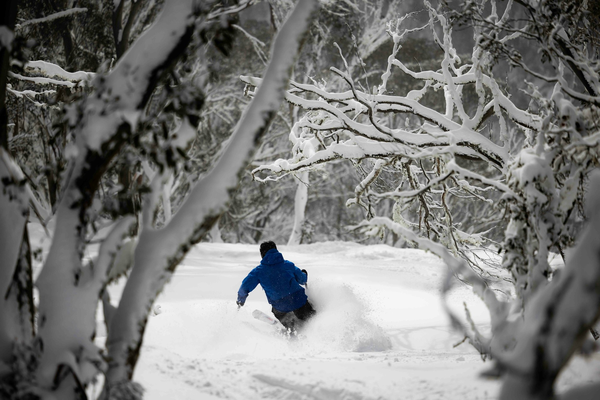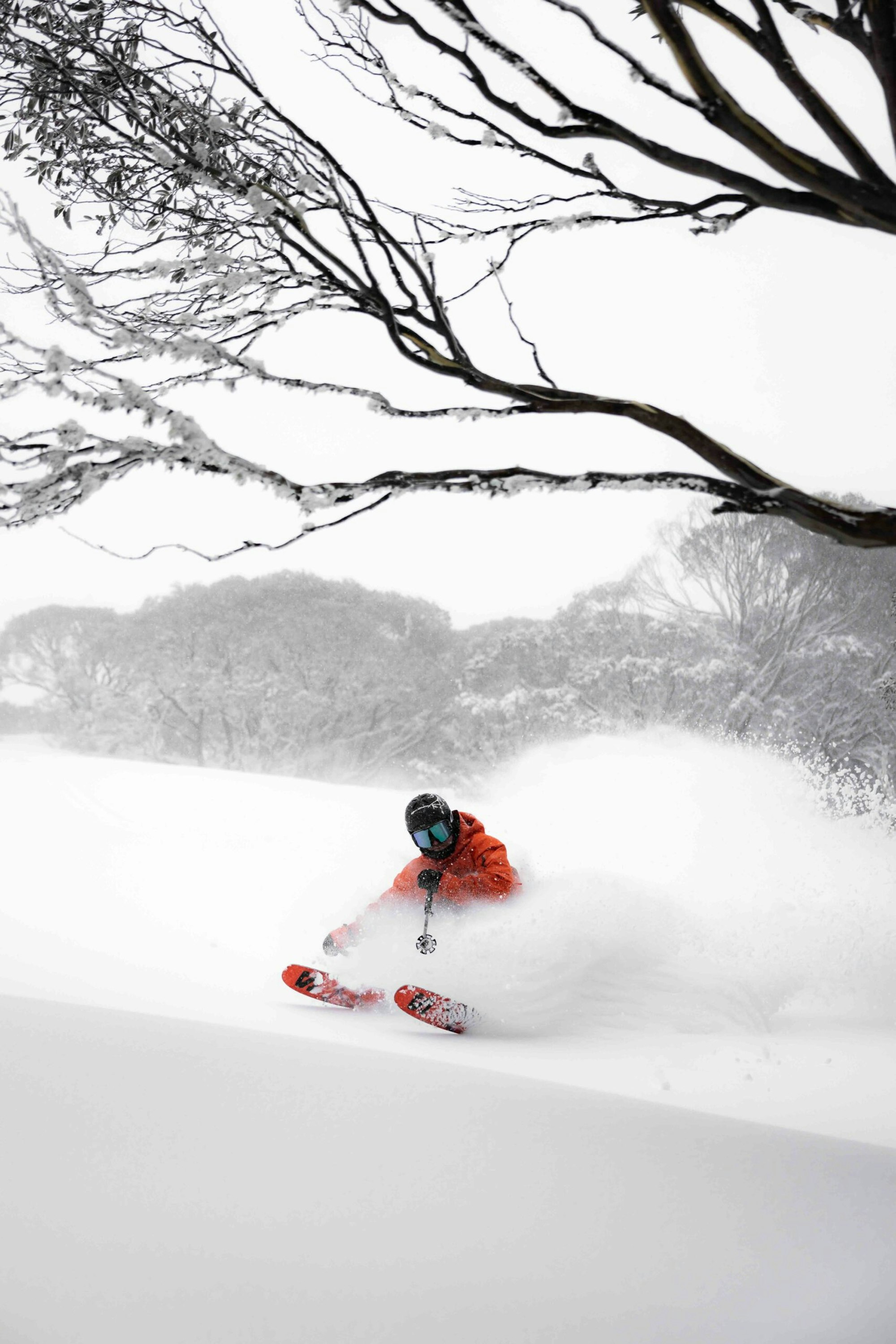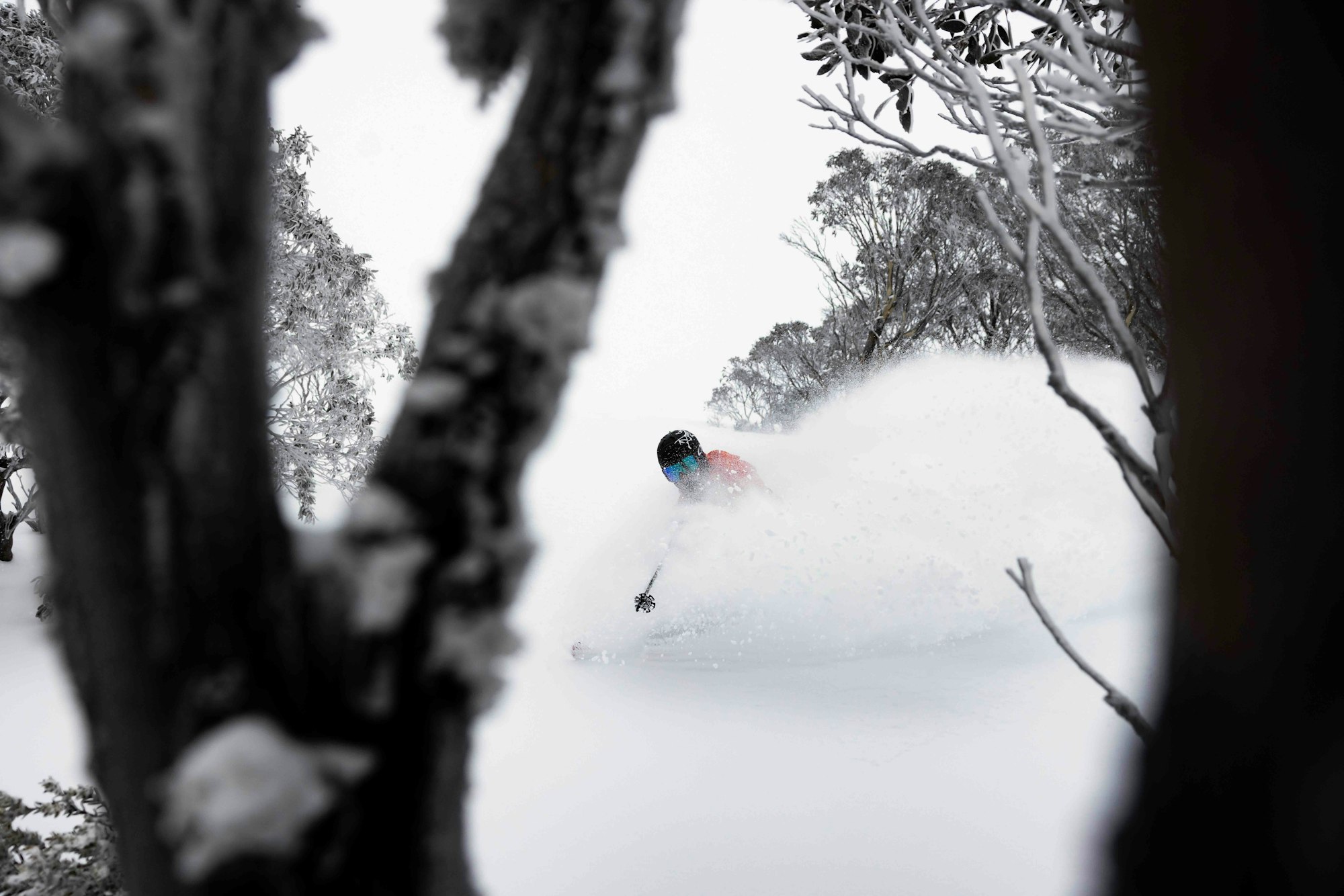 Another storm recently hit the Aussie mountain oasis, this time dropping nearly 20 cm and leaving the mountain in prime condition. While winds have since scoured certain areas, the majority of the snow gum-filled terrain was skiing well. At least that’s what we heard from our boots on the ground—photographer Dylan Robinson and skier Drew Jolowicz.
