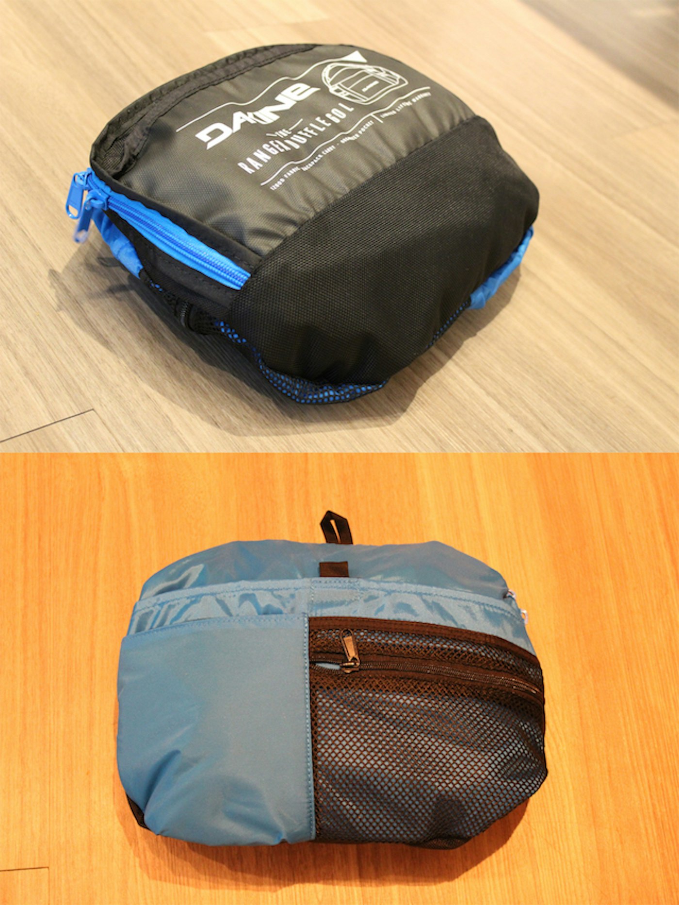 The bag, packed into itself. Note how a couple of pockets are kept accessible—ideal for toiletries and other small items while traveling.