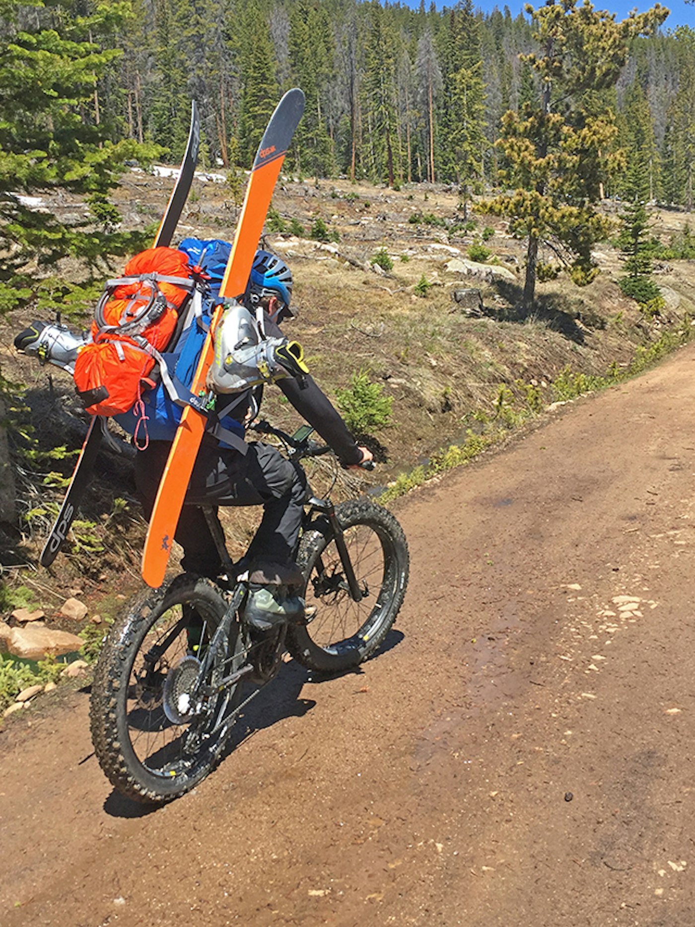 FREESKIER staffer Nat Houston biking along the Tigwon Road, the Deuter Rise Tour 45+ comfortably strapped to his back, June 4, 2017.