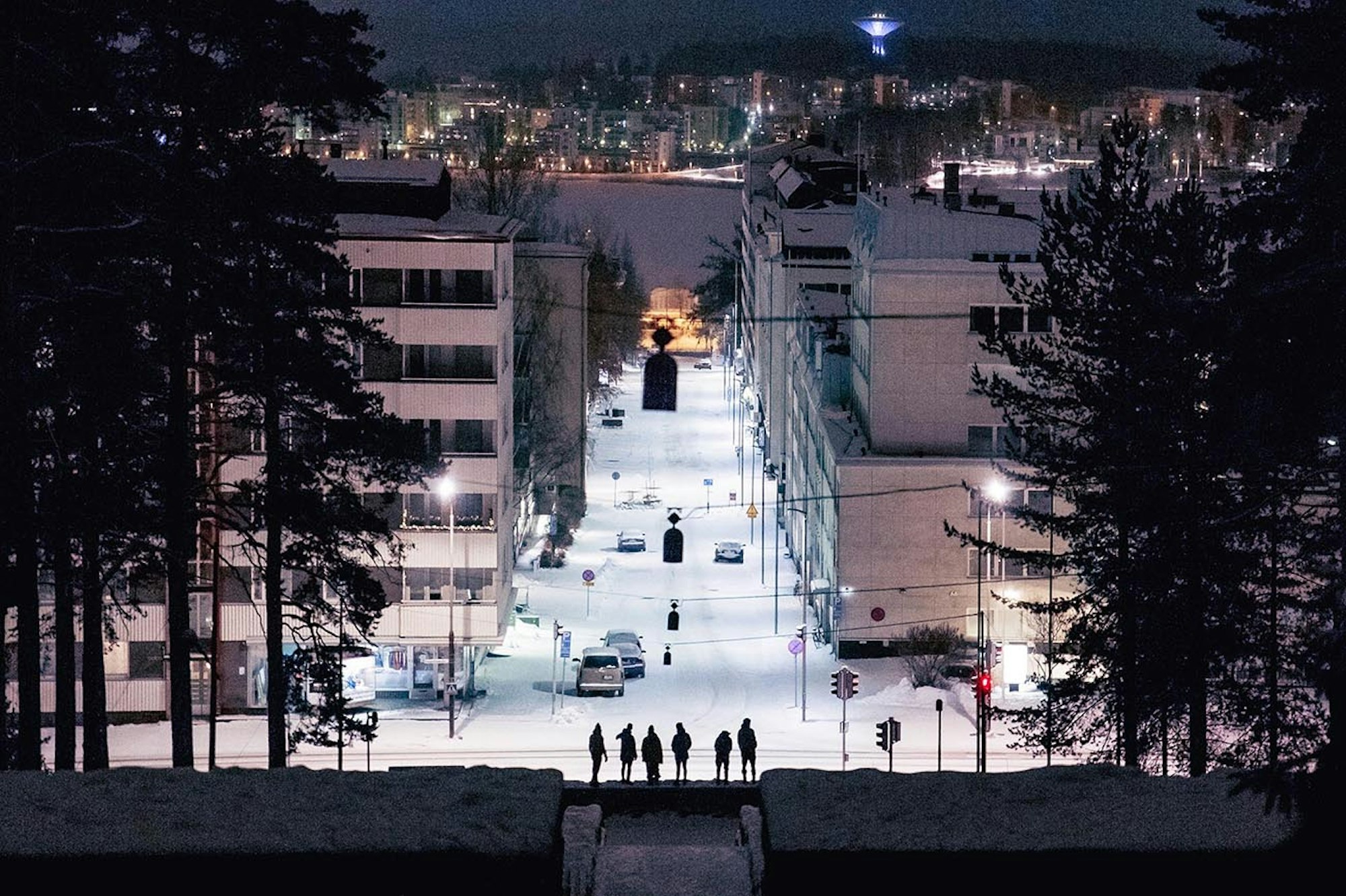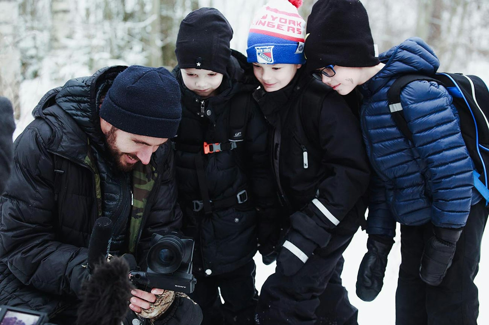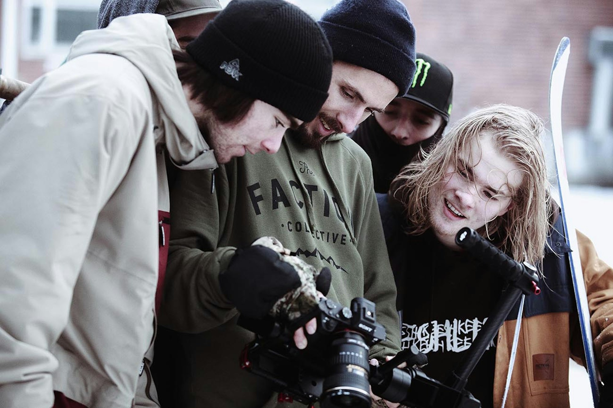Film director and cinematographer Etienne Merel reviews footage with Faction athletes including Antti Ollila, Alex Hall and Daniel Hanka, in Finland. Photo: Alric Ljunghager