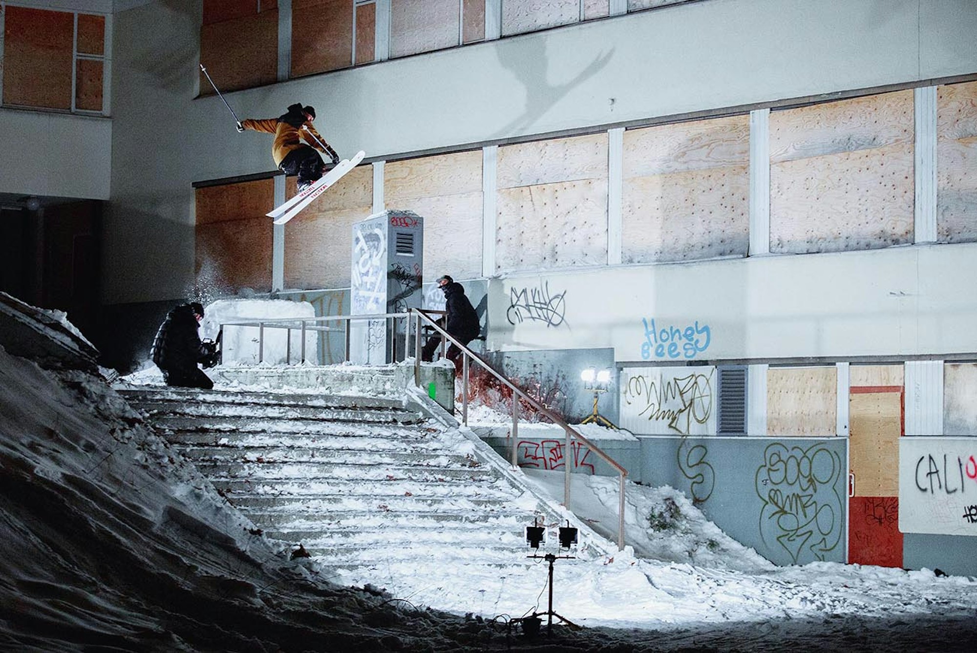 Next, we head to Jyväskylä, Finland, where Antti Ollila—the Olympian and celebrated Finnish skier who makes inverted and corked-out ski stunts look like a cakewalk—leads a street-skiing posse that includes Daniel Hanka, Tim McChesney and Alex Hall on a mission to turn every street corner and brick wall into proverbial blank canvases on which to paint their skiing masterpieces. Set to the tune of “Street Dance,” by Break Machine, the pace of this segment is fast and furious and the tone is decidedly fun. Intermixed with the skiing clips are scene-setting shots of local children who view the film-shoots in large groups and dish out high fives for stunts well-executed. We get a taste of life in the far North where the winters are long, dark and cold, and winter sports are an integral part of the culture.