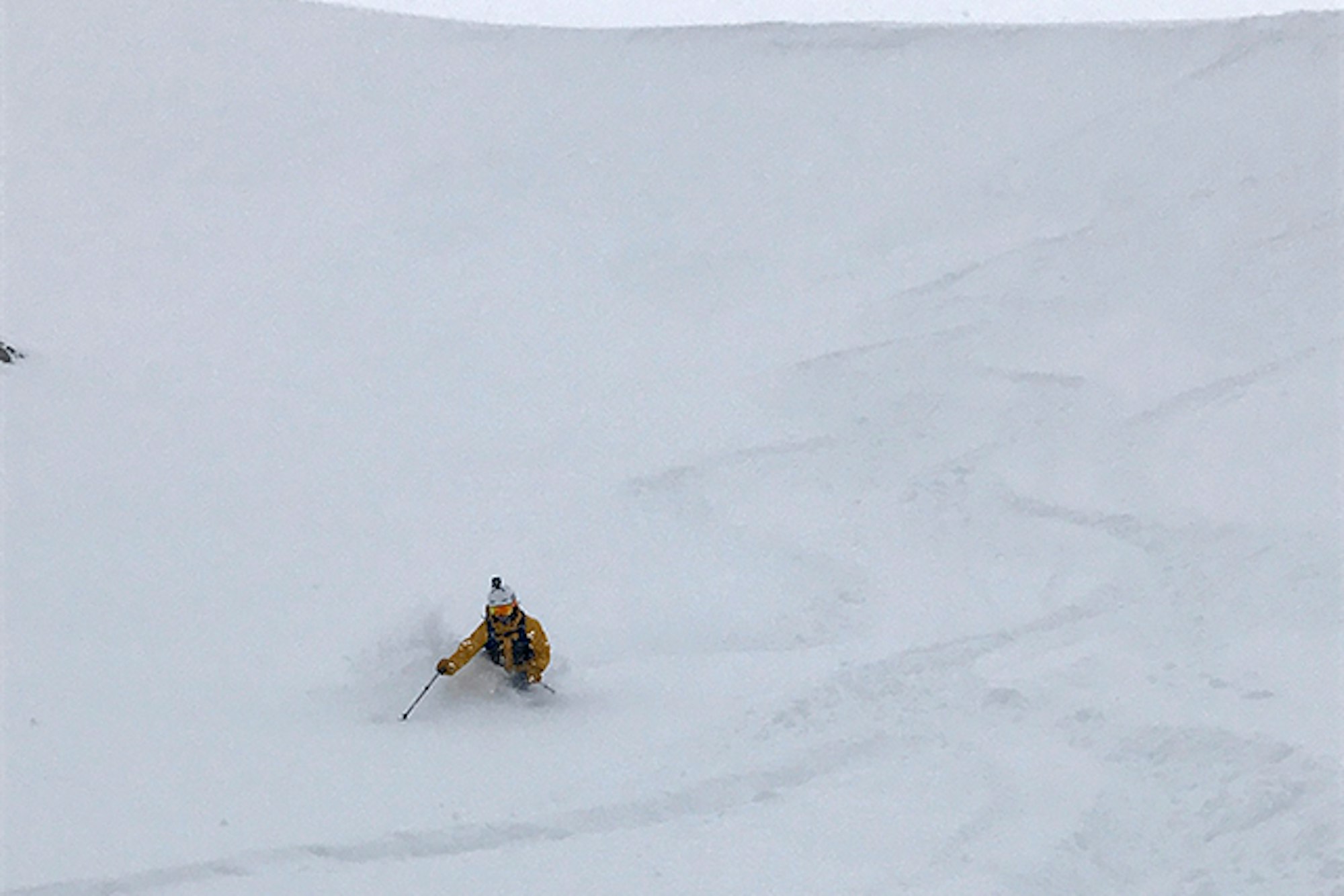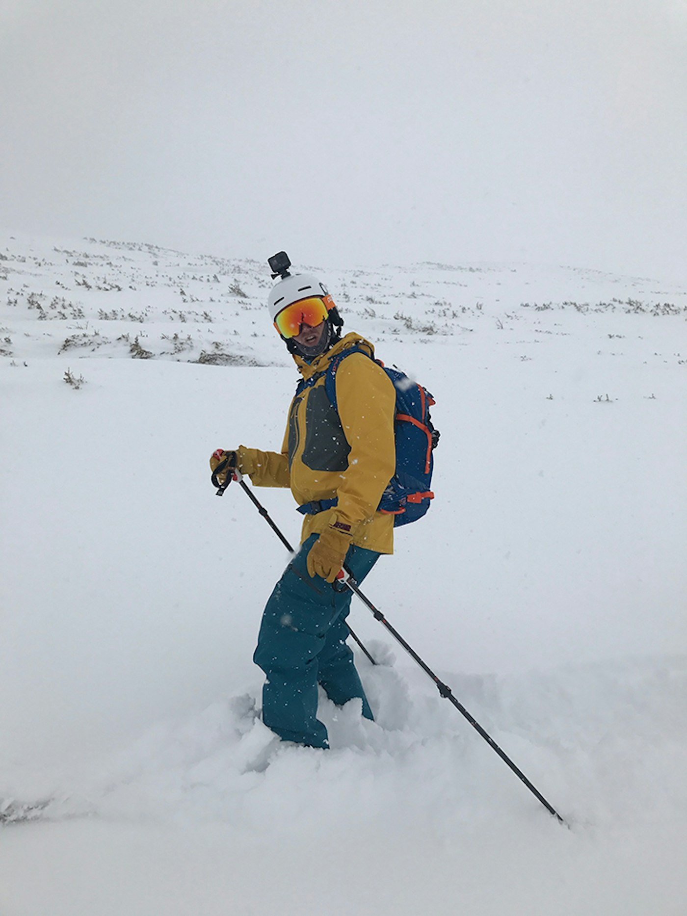 The author sporting the POC Auric Cut Backcountry SPIN helmet and Clarity goggle, visibility is low.