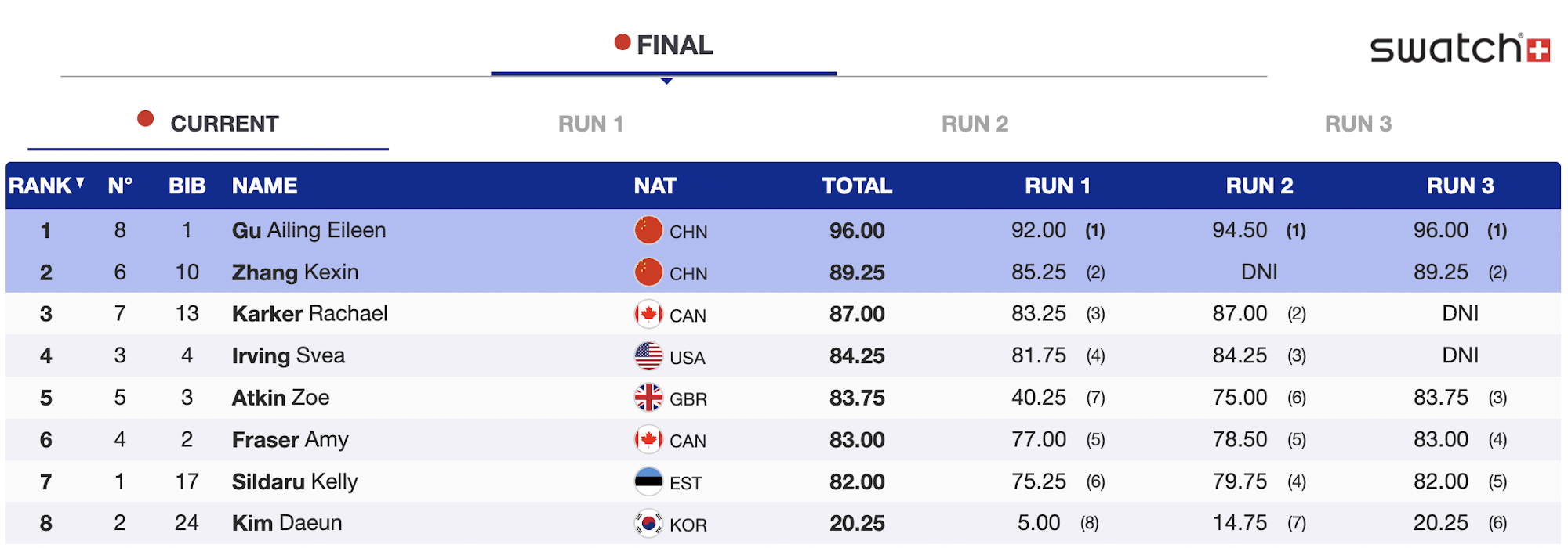 With poise and determination, Gu laid down three incredible first-place runs. Her competition experience was ultimately a deciding factor, as she demonstrated patience and precision regarding her trick selection in such variable weather. Many athletes struggle in these conditions, as some push themselves too hard given issues with visibility and wind, and others play it too conservatively. However, this was not the case for Gu.