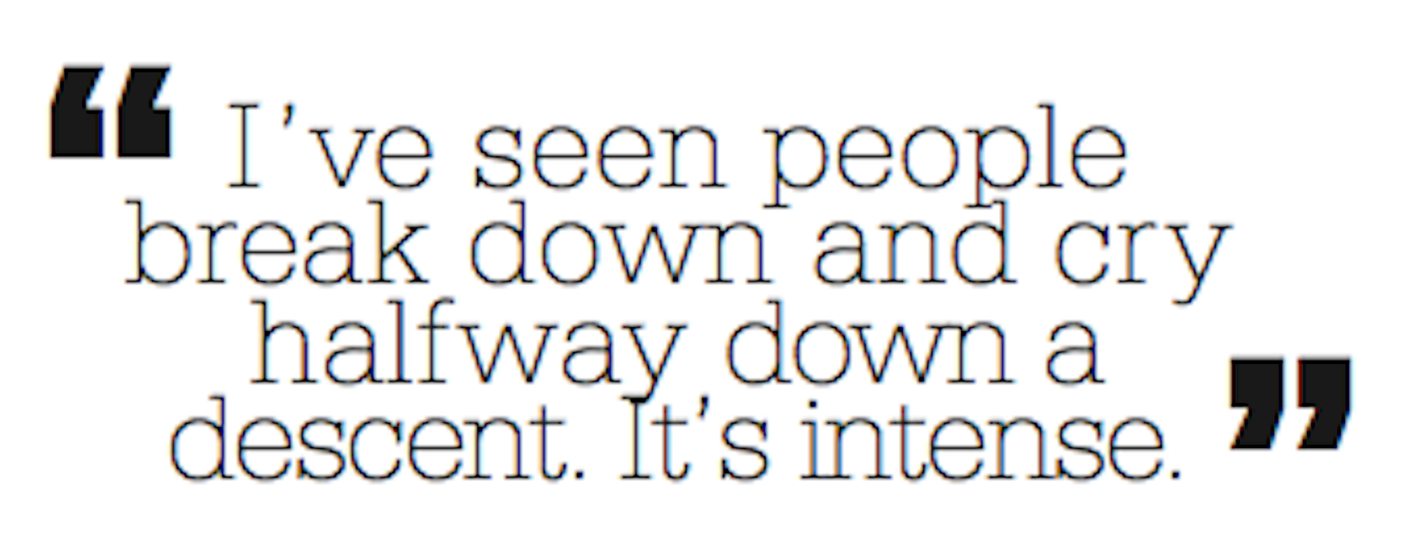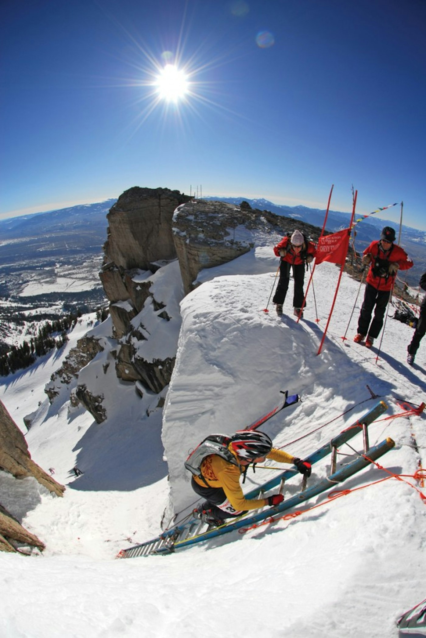 Any mountaineer will tell you that the summit celebration doesn’t last long. Reaching the top marks the halfway point and oftentimes the down is more dangerous than the up. At least at a ski mountaineering event you can just shred down to the next transition station, right? Wrong. Advances in mountaineering equipment have made the up considerably less resource intensive by reducing weight. The downside, so to speak, is you have to use the same carbon-fiber toothpicks that made jogging up bearable to descend Jackson Hole’s unforgiving terrain. “I’ve seen people break down and cry halfway down a descent,” says Z. “It’s intense.”