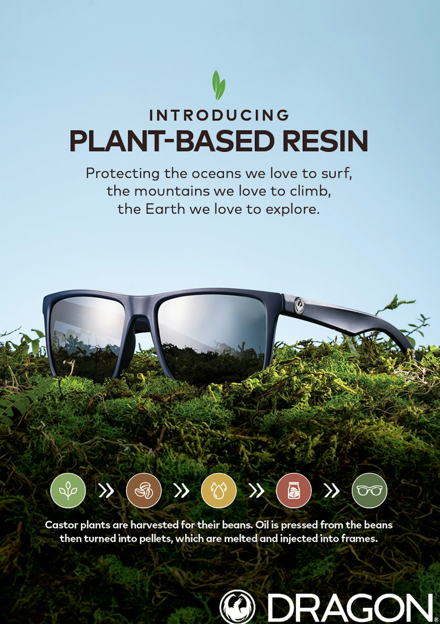 An eco-conscious alternative to petroleum-based plastics, the plant-based resin is made from castor bean oil. Castor plants are harvested for the beans, which are pressed into an oil, transformed into small pellets and then melted down to create the frames of your favorite Dragon sunnies. Castor plants are incredibly drought-resistant, meaning they don’t need a lot of water and can grow in the aridest regions of the world where little else can be sustainably farmed. By using this plant-based resin, Dragon is able to reduce its carbon footprint in the production process without sacrificing the light weight and durability Dragon sunglasses are known for.