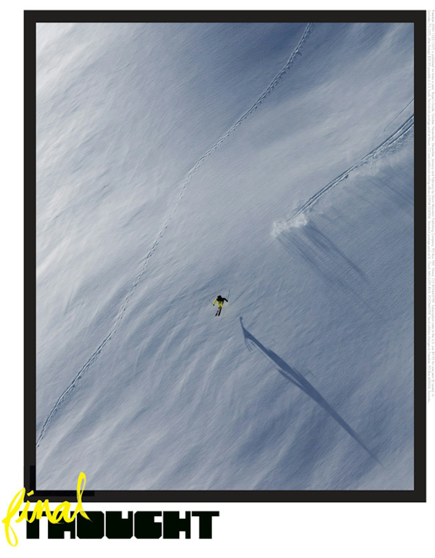 “It was snowing really heavily in the Alps last March when we decided to pack our car and drive to Engelberg, Switzerland. Swedish local Johan Jonsson was not just hosting us but also skiing. The resort got tracked very quickly and the second day we decided to take a heli and find some untracked terrain. We found this face that was perfect. This shot is one of those lucky ones that turned out well. It wasn’t planned. I really like Johan’s style on the terrain. The ollie here really shows that Mr. Jonsson is having fun whenever he skis. The photo is really simple but after a while you will find some interesting details. I think the biggest attraction is how far he flew. To me that is the beauty of the photo when you start to ask questions. Also the animal track brings more story to the frame. Thanks to Johan for showing us around. That moose was epic.” —Tero Repo