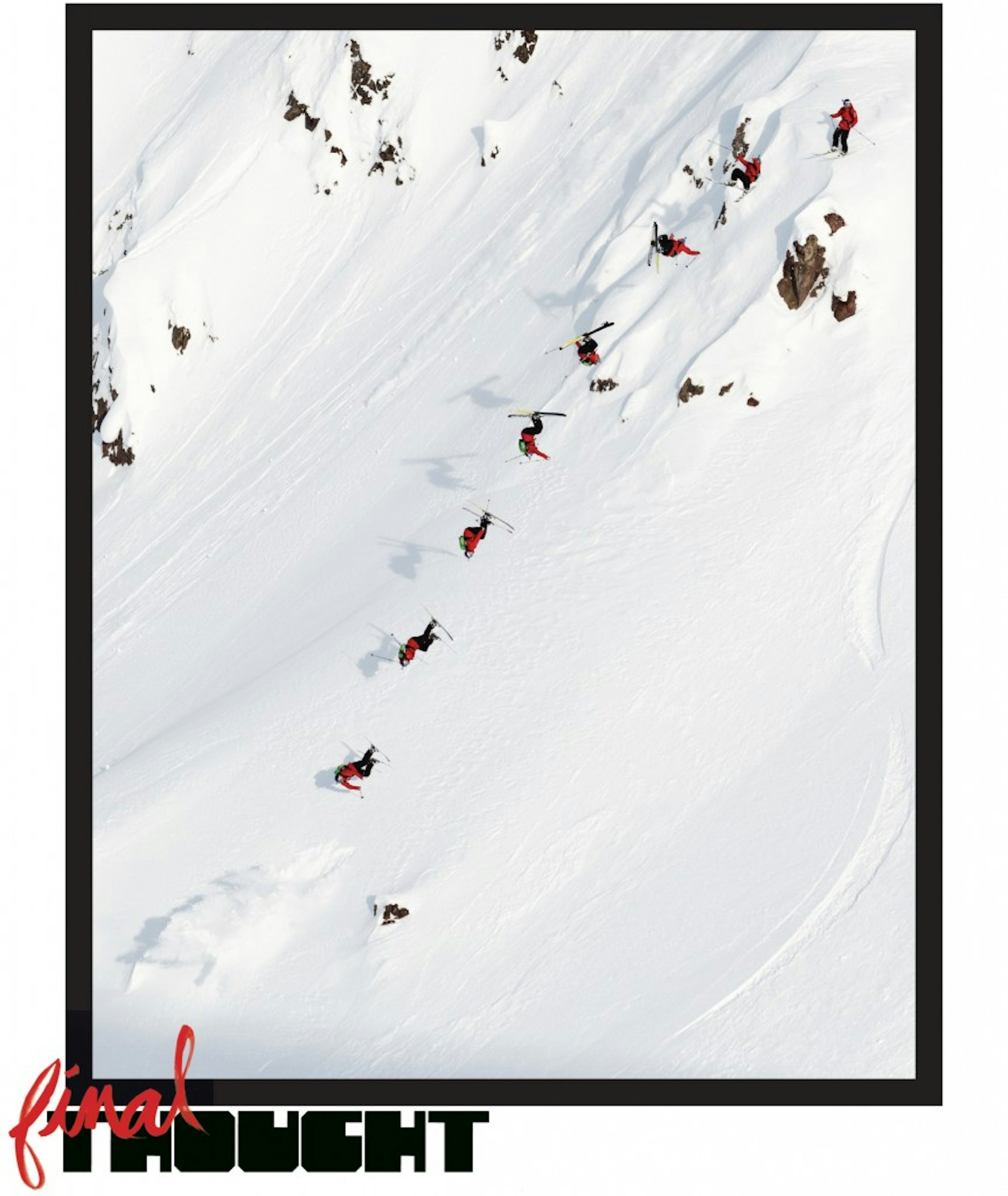 “The thing about tricking off natural terrain is that most of the time you can’t see the takeoff, you usually don’t know how far you’re going to travel and you never know exactly what the snow will be like below. It’s like trying to hit a home run without ever seeing the pitcher, not knowing the distance to the wall and never knowing exactly when to swing. As you can probably gather, what I’m trying to say is that throwing tricks off of natural terrain is a hard proposition with a low probability of success. On the other hand, sometimes you can just be a total gaper, underrotate an easy backflip and land on your head like a total moron.” — Cody Townsend