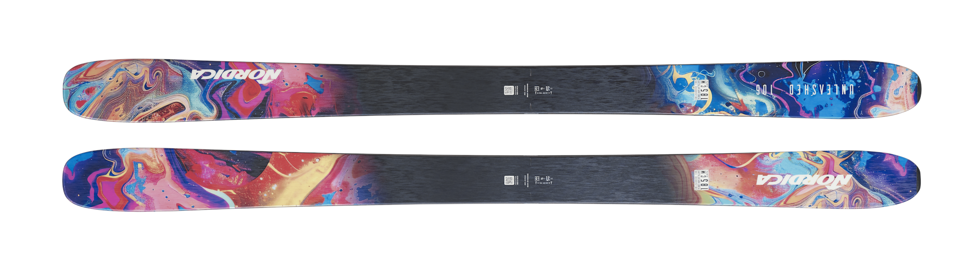 New for 2026, the Unleashed 106 effectively replaces the 108 and ushers in a more approachable width and updated shape with a poppy, playful, and maneuverable personality. A shorter effective edge and increased rocker profile enable the ski to drift, slash, and pivot on a dime—a stark contrast to the demanding nature of the old 108. Nordica updated the construction, implementing a narrow metal strip down the center, called Drift Lock Metal and removing metal from the tip and tail. This retains stability while inviting riders to get creative on their way down the mountain. With a CA (non-metal) version available and lengths starting in the 150s, the new Unleashed 106 is the most approachable Unleashed model to date.