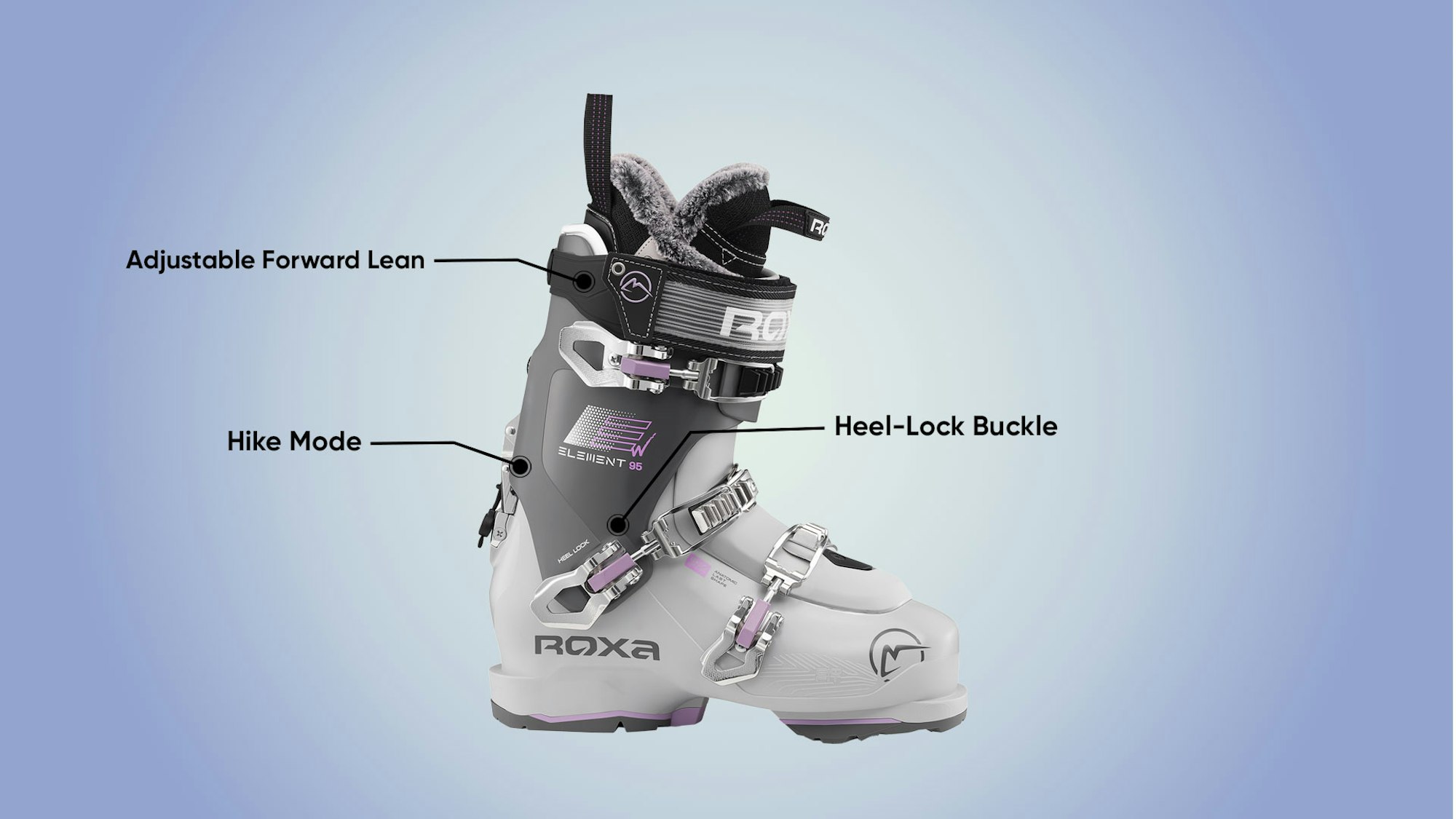 The Element W 95 is a Cabrio boot designed to thrive in the resort. On the back of the boot is a hike mode to help you walk to and from the parking lot, and around the lodge. The middle of the three buckles is placed at a 45-degree angle to pull your heel into the heel pocket from your ankle. This design reduces pain over the top of the foot while creating excellent heel hold.