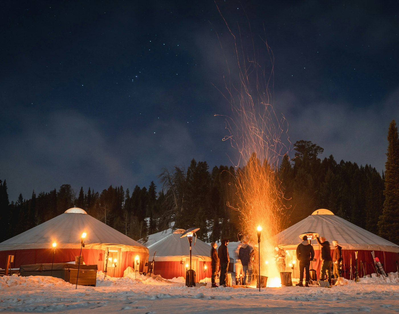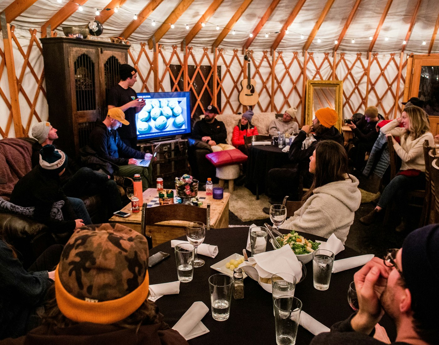 Outside the yurt, a bonfire burned tall. 15-foot flames melted a hole in the snowpack, giving a fiery glow that flickered against each of the five yurts at Whisper Ridge, a heli- and cat-skiing operation based out of Eden, Utah. The full moon cast enough light just beyond the glowing pit to produce long, deep blue shadows of trees against the silvery, glowing snow. It was a clear night—the forecast for skiing the next day told of sunshine and spring conditions—and faint stars hung overhead while Cory, one of the guides, donning braided pigtails, a well-worn tucker hat and a gritty smile, strummed a song on the guitar about his hometown in Tennesse.