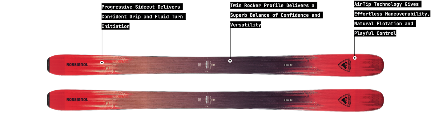 The Soul 102 is the ultimate do-it-all freeride ski. Pairing a more directional underfoot construction with more progressive tip and tail rocker, Rossignol took the best of the powerful Sender 110 and worked to create a more all-around version with easy turn initiation and versatility. As a result, this ski is lighter, carves better thanks to its shorter radius, while still maintaining a consistent pivot.