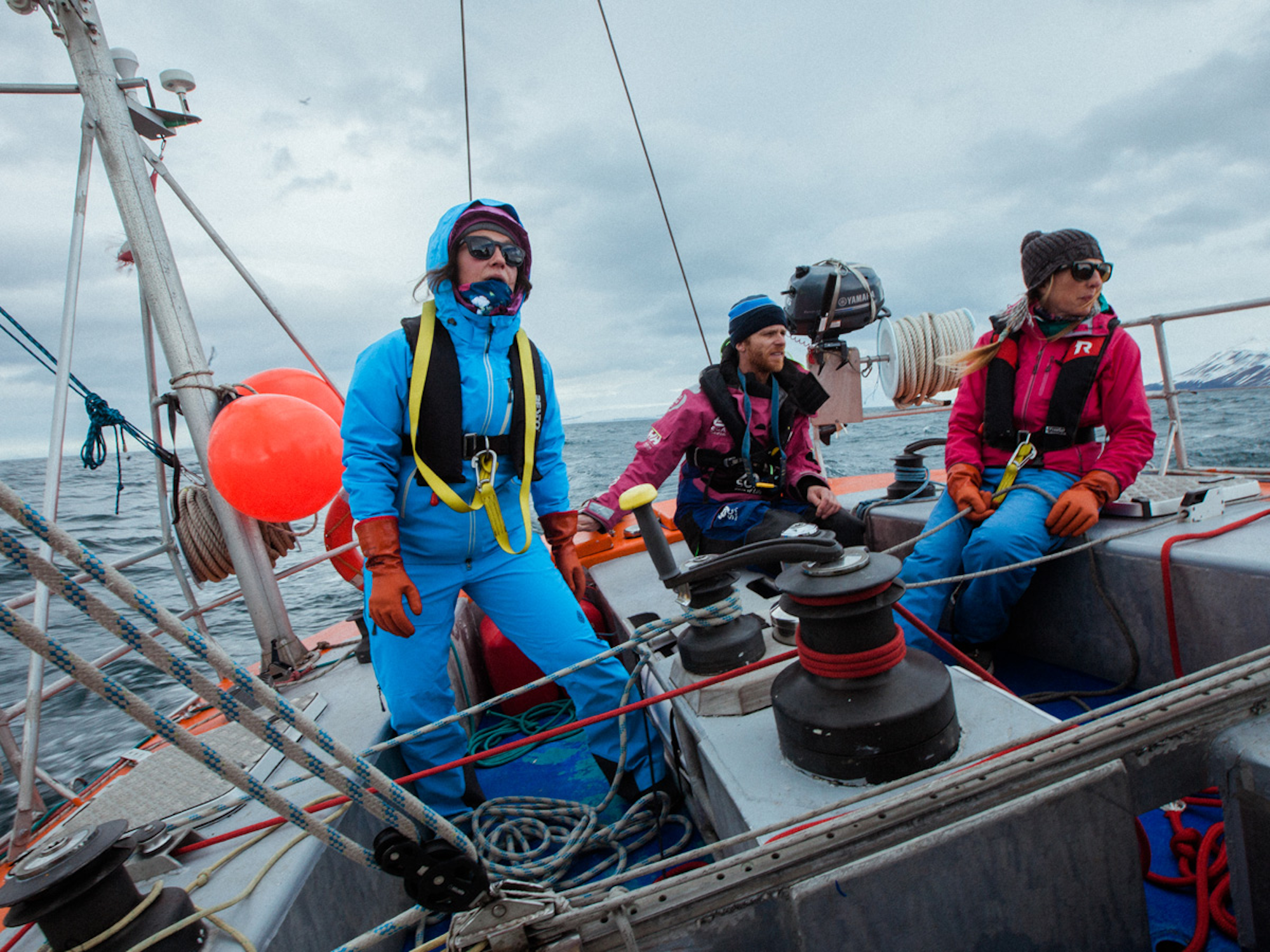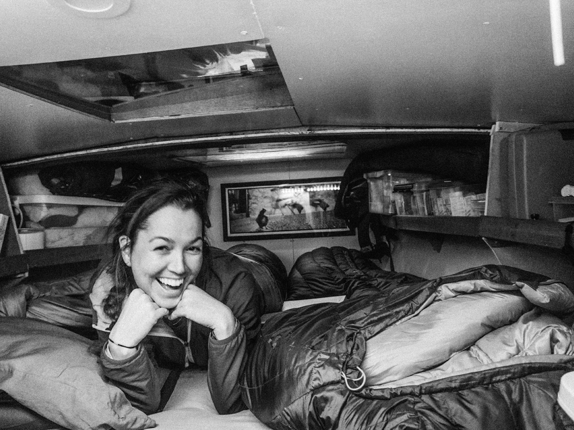 After three days of travel, layovers in Amsterdam and Oslo, and a flight on a small plane across the Barents Sea, I dragged my XL duffel down arctic dirt roads, across a floating dock and onto a 50-foot sailboat. Shelby, Anna, Jessica Baker, Wesley Walker, Captain Ben and I had all just met and I discovered my bedroom was three feet of “standing space” under the bow of the boat. By standing space, I mean I was on my feet but bent over at almost a 90-degree angle. I was reluctant to admit to myself that I was already battling queasiness and claustrophobia on the docked boat as I unpacked and navigated the tight space below deck for the first time.