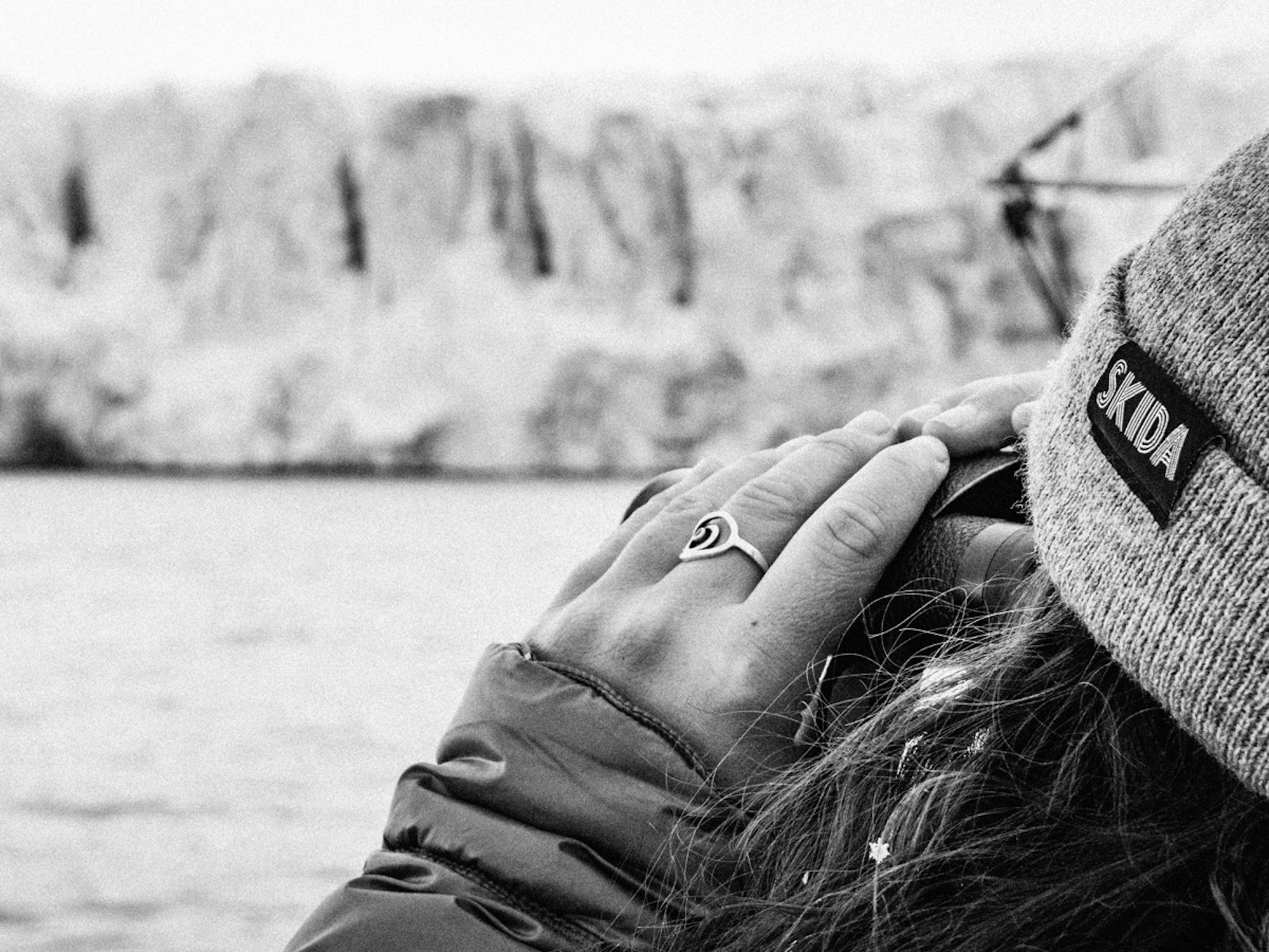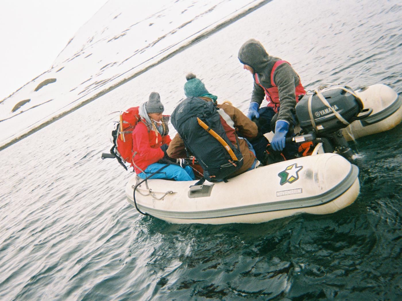 By the time we’d anchored, the crew was excited to ski. Finally, we would do something familiar and on firm ground. But our checklist now included a gun and pocket flares, and we rode an inflatable dingy to shore. If we accidentally punctured the dingy with skis, poles, ice axes, or crampons, the water below us was 38 degrees. I wish I could say our ski legs transitioned to sea legs, and that we learned how to gracefully maneuver from boat to land, but we usually grunted and rolled our way aboard the dingy and onto shore. We’d slip over rounded rocks in our ski boots and chuck our skis toward the snow.