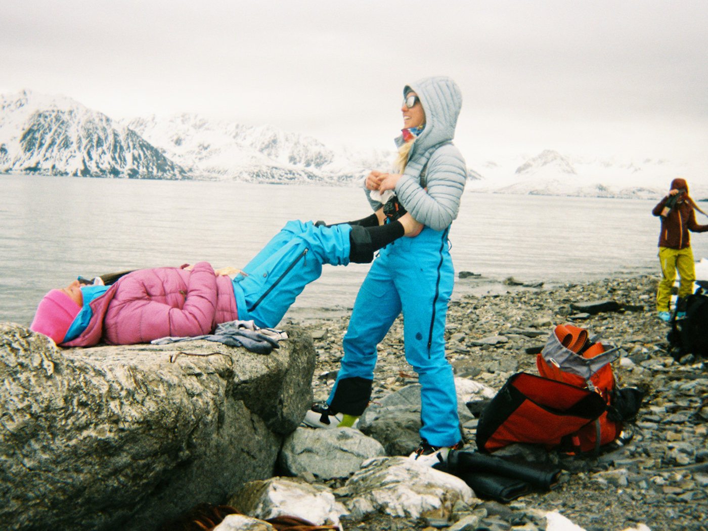 Within a few days, our group began to settle into the rhythm of life at the 79th parallel. We learned the fastest way to leap towards melting puffies near the wood stove, kickturns included a new verse to our ongoing rap song, and with practice we could tie crevasse rescue knots behind our backs. We summited unnamed, ice capped peaks we’d stared at from the boat and sometimes turned around, calling it off. But we celebrated every descent with high fives and Norwegian pilsners. We laughed at ourselves as we grunted and squawked, deliriously figuring it all out together and probing our way along as a team.