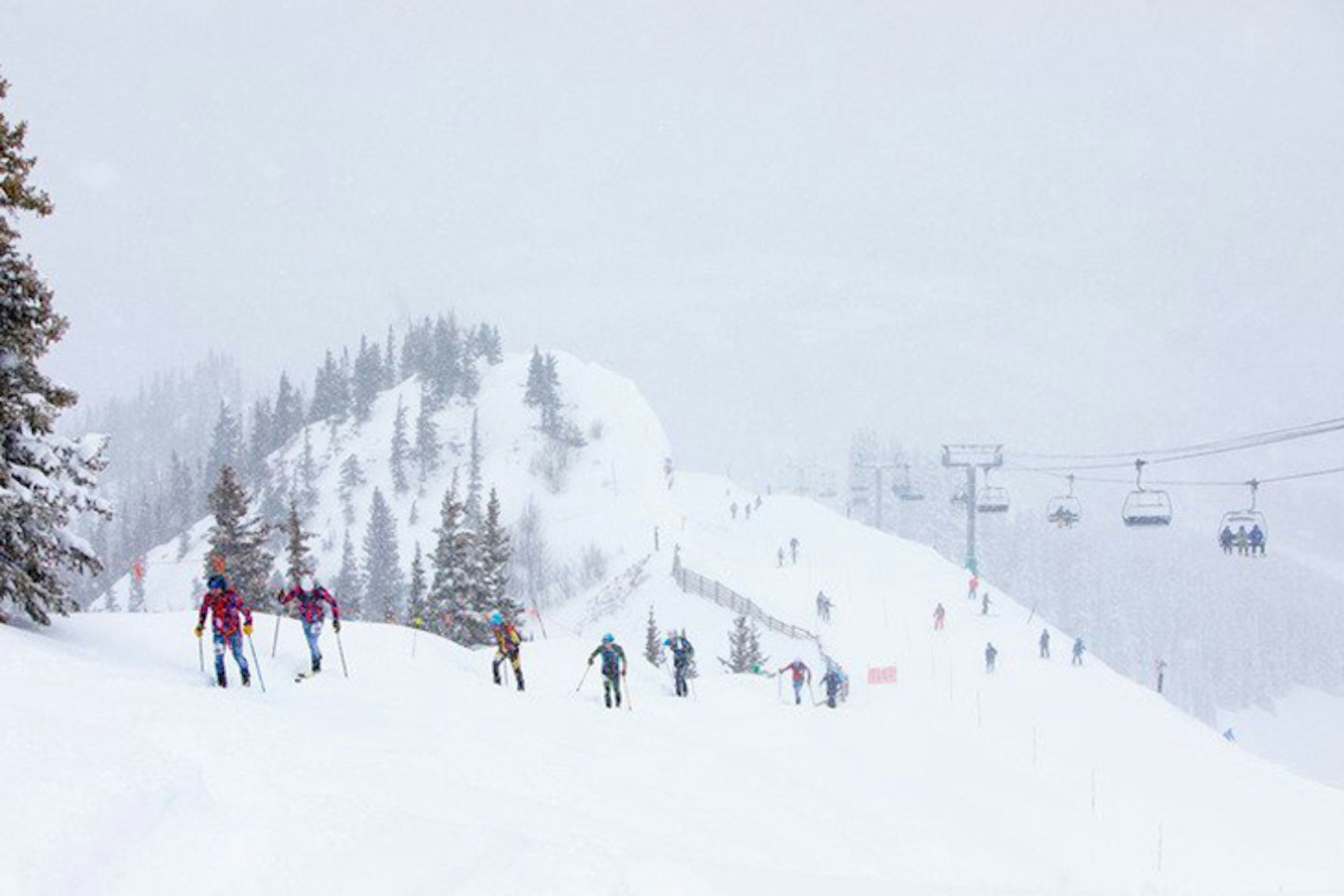 The hope was for bright blue skies and temperatures in the low 30s on race day—not too hot, not too cold, with pleasant weather all-around. However, Mother Nature had other plans for competitors in the Power of Four. She dropped upwards of a foot of new snow on the Aspen area the night prior to the race, and the racing conditions ranged from moody overcast skies to blowing snow. Luckily, the crappy weather came in short waves and by the time we reached the most brutal part of the race at the bottom of Aspen Highlands, it was calm and relatively pleasant.