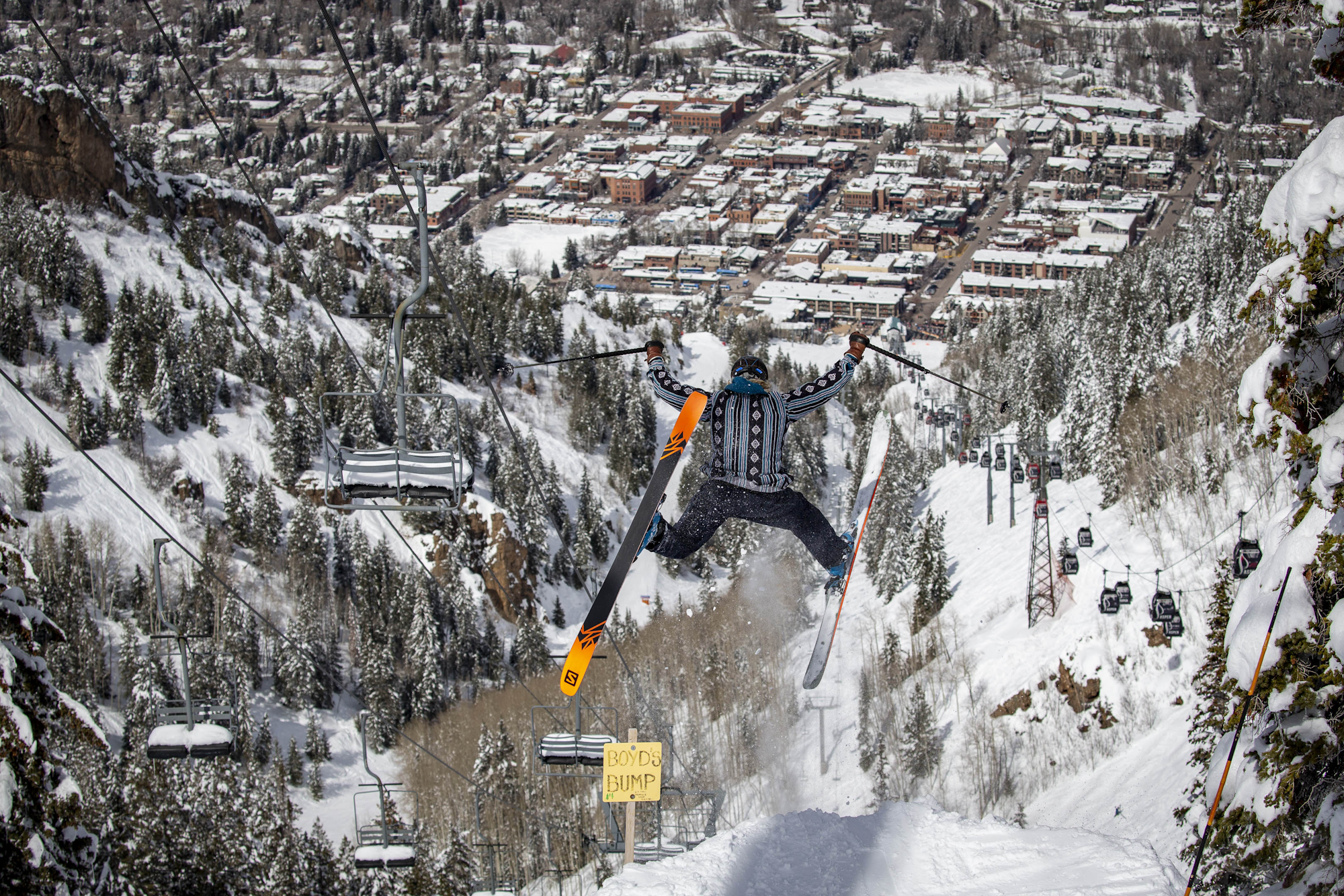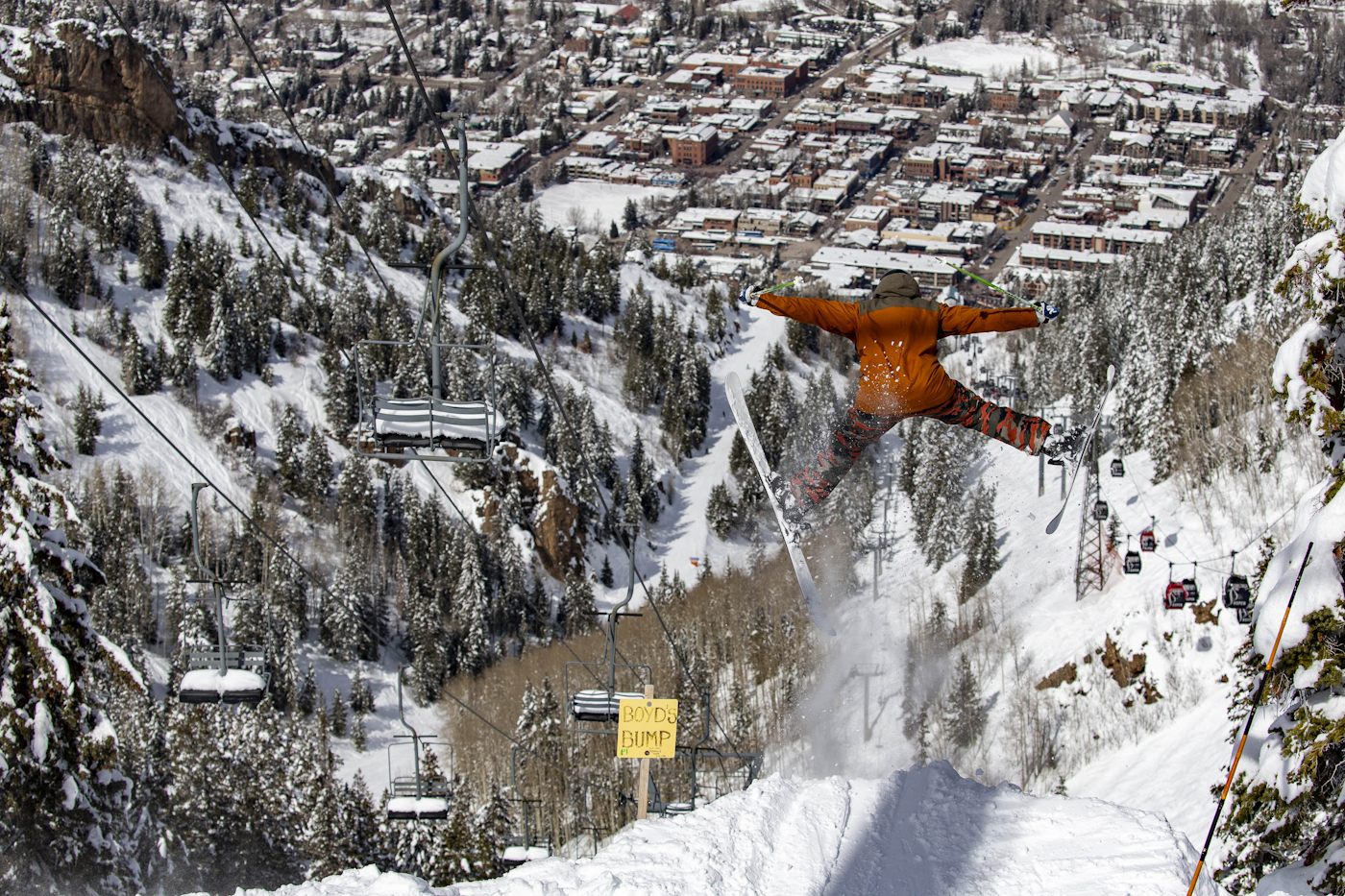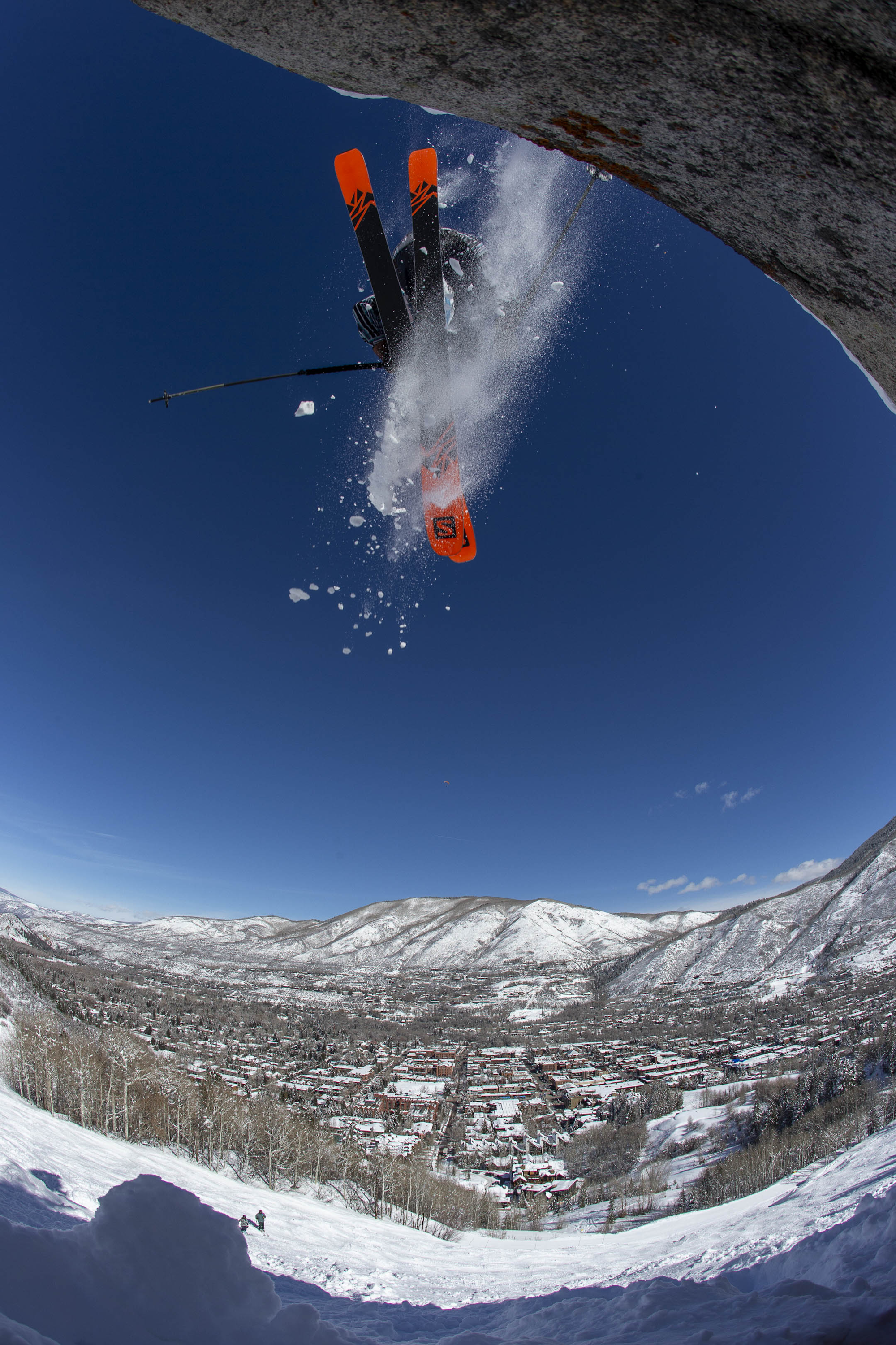 Salomon’s Drew Petersen airs one out with Aspen town center in the background.