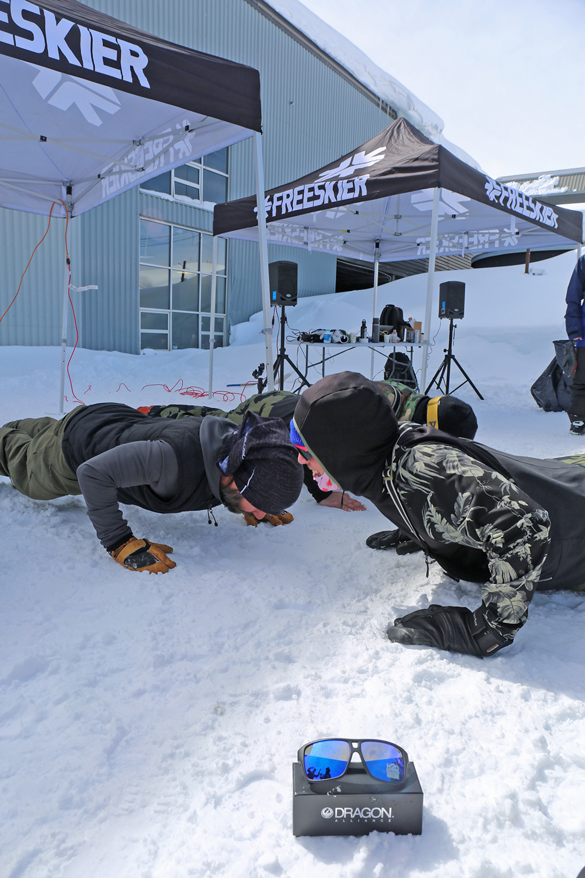A pair of Dragon Alliance sunglasses for whoever can do the most pushups… PHOTO: Donny O’Neill