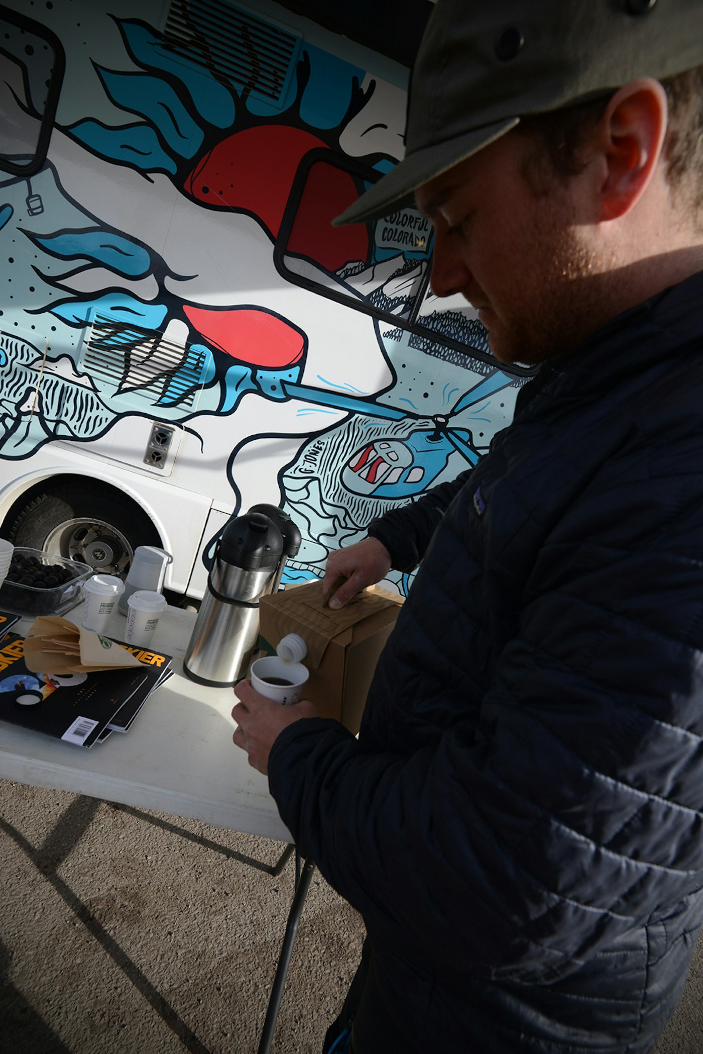 With the sweet, sweet tunes of the Grateful Dead playing through the speakers, locals and vacationers alike flocked outside the FREESKIER RV parked at 8,150 feet above sea level to learn about the 20-year-old brand while enjoying a free breakfast with staff members of the Magazine. Amongst the hoards of visitors that stopped by were police officers from across the globe in town for the annual “Police League World Cup” ski races; and, semi-pro and amateur ski racers participating in the World Pro Ski Tour.