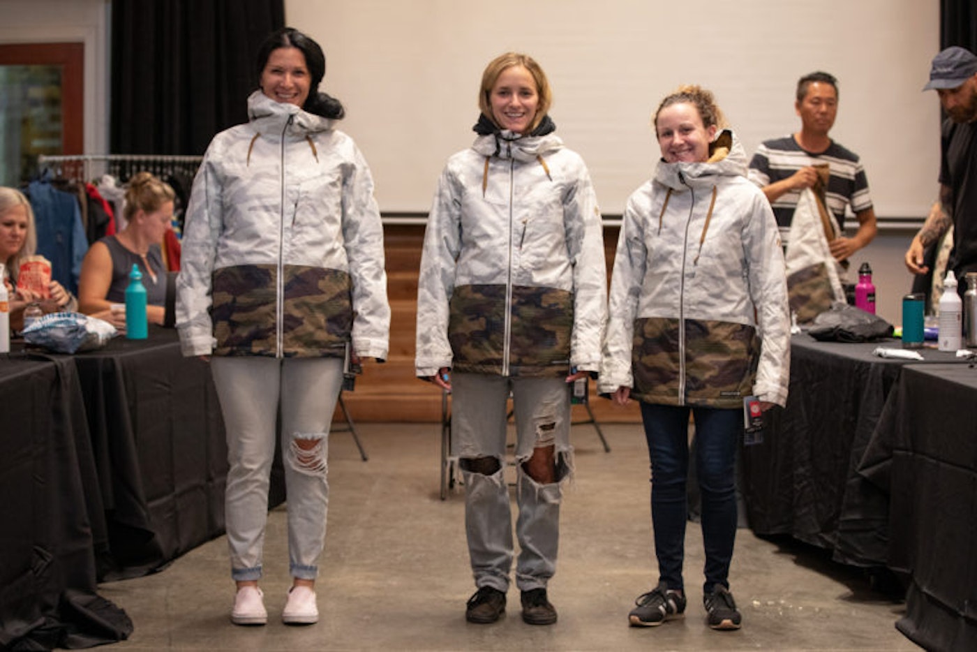 Three ladies try on three different sizes of the same 686 jacket to compare fit.