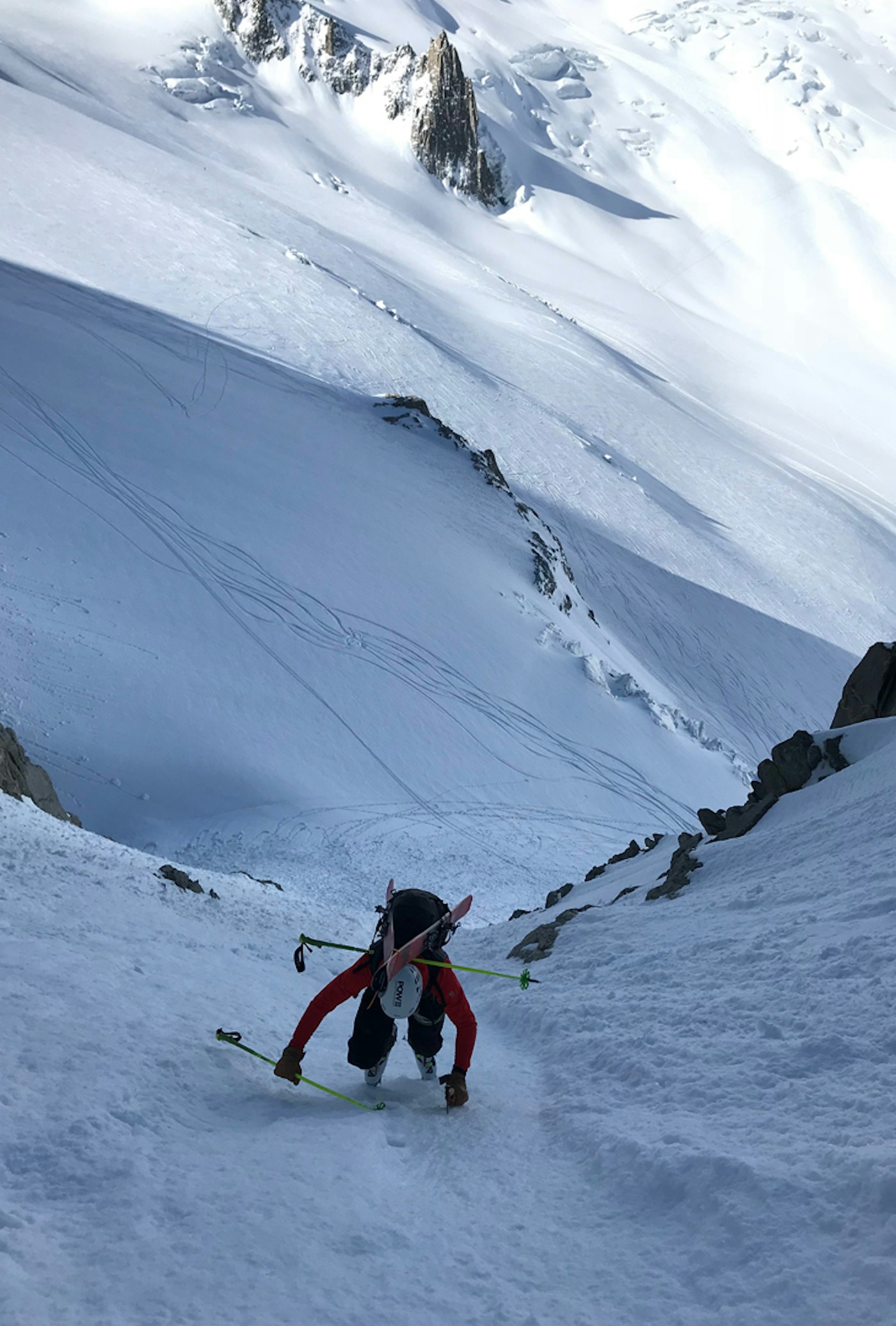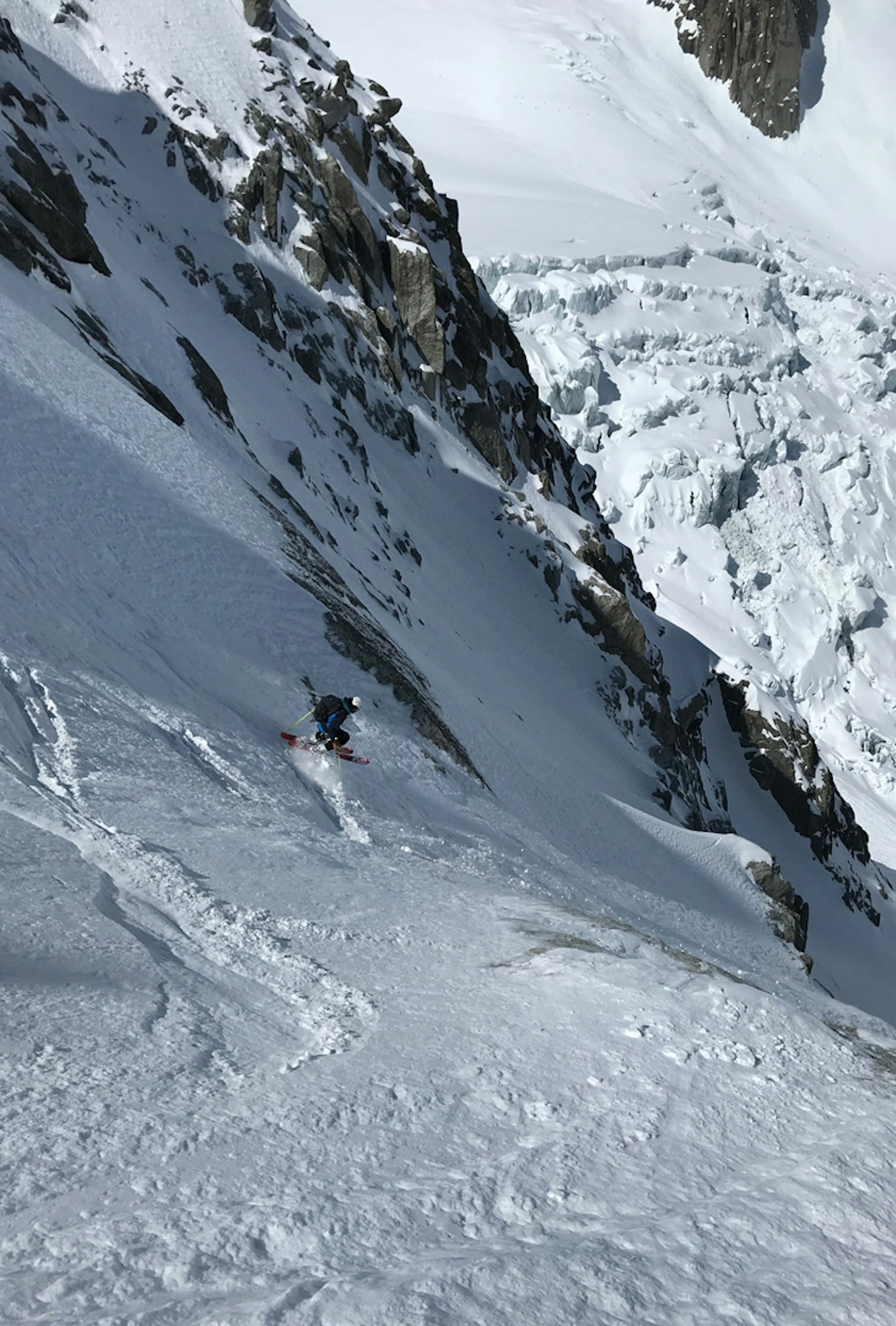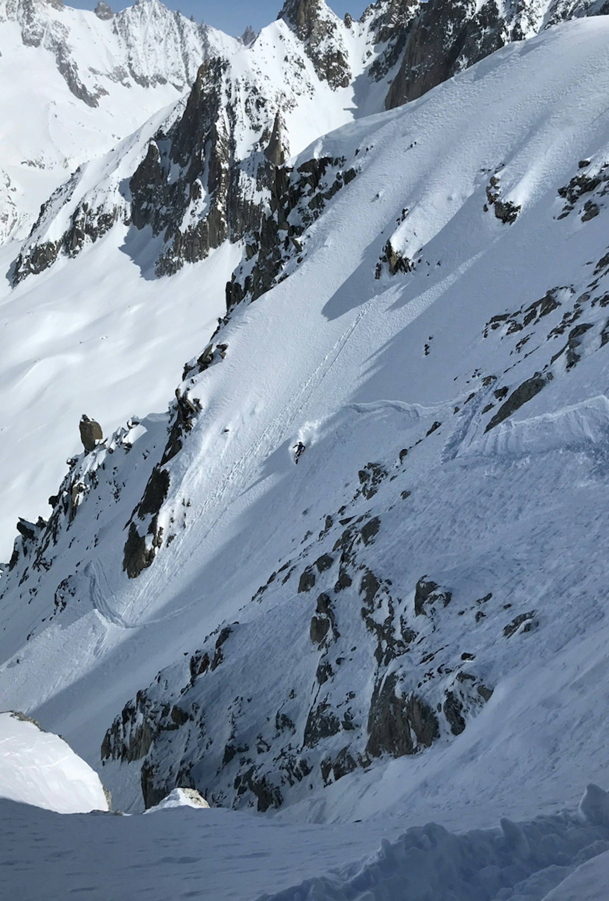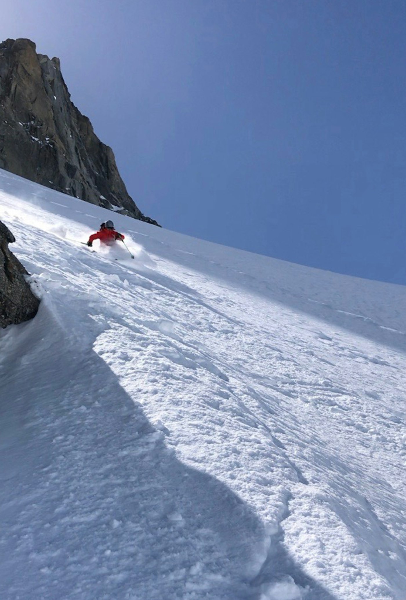 Due to the nature of the face, we hopped our way through technical cruxes that consumed much of the line, only opening the throttle on rare occasions where the terrain permitted. The whole route was steep, committing and no-fall in nature; yet the lack of direct sunlight since the last snowfall made for some dreamy turns through boot-top pow. In all, the euphoric combination of perfect weather, great company and idyllic springtime pow made for an unforgettable day on the Mount Blanc Massif.