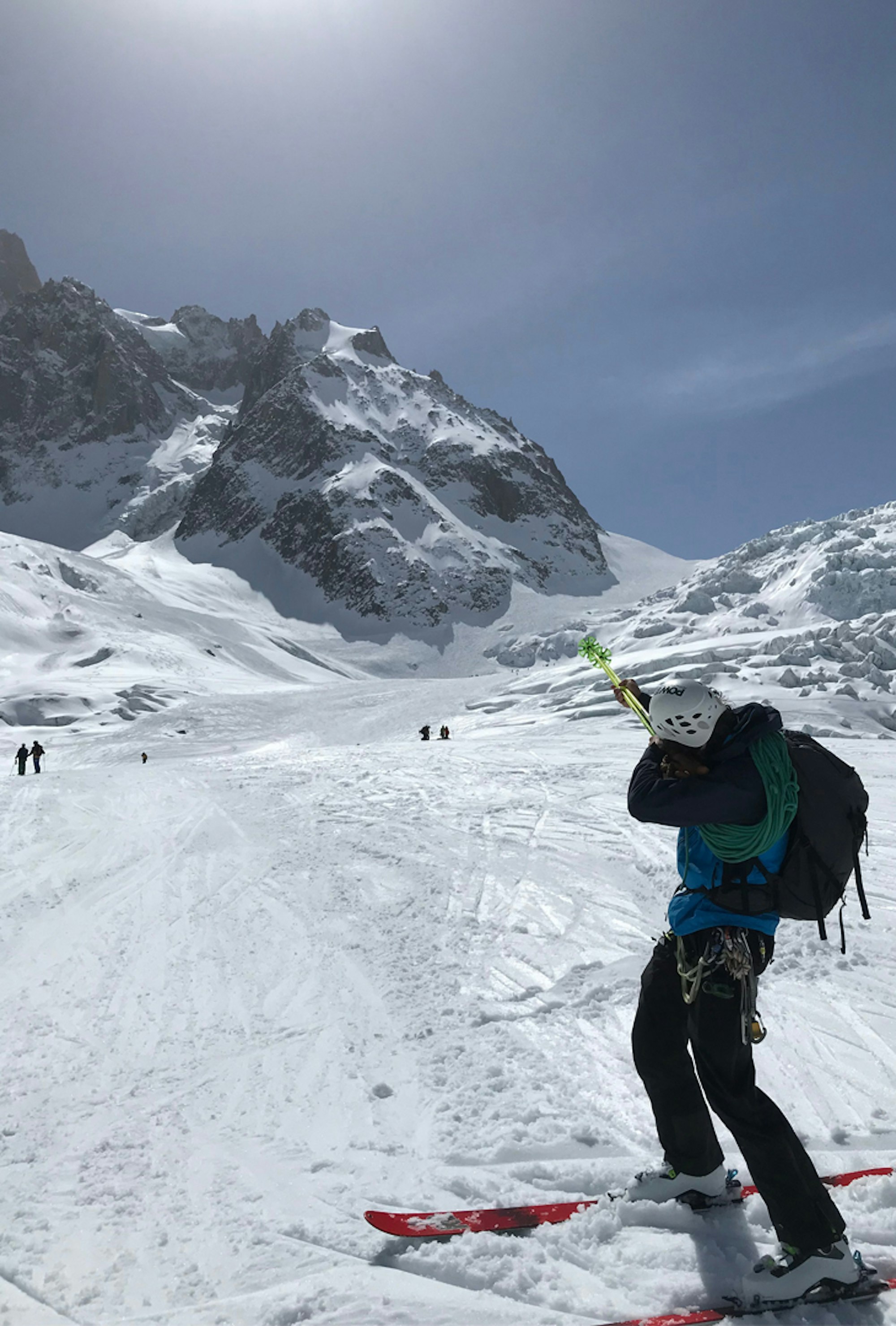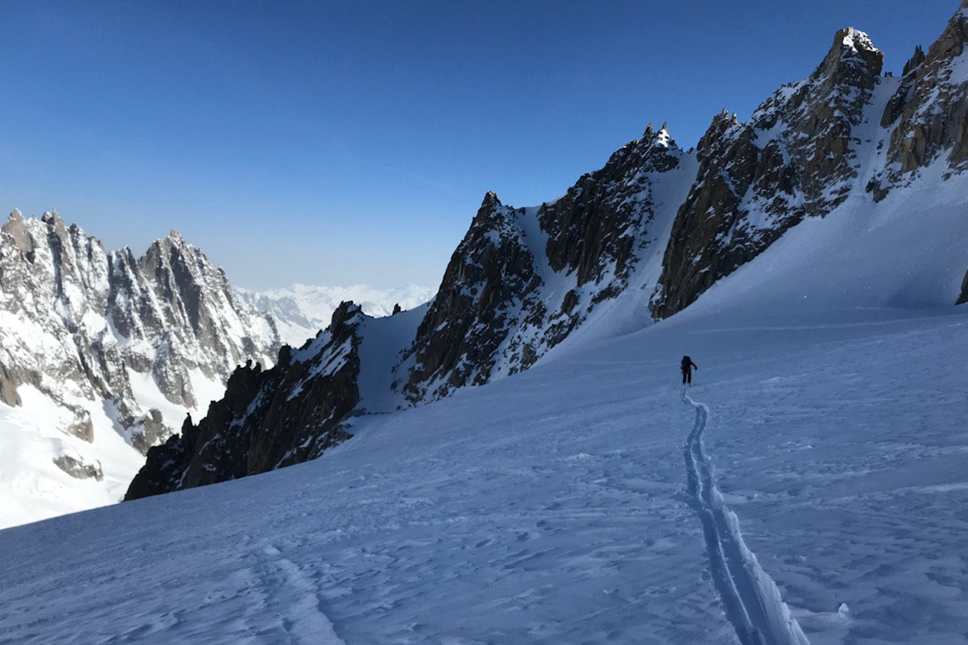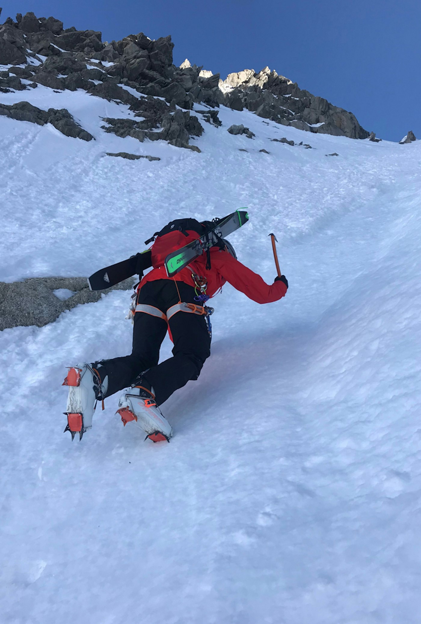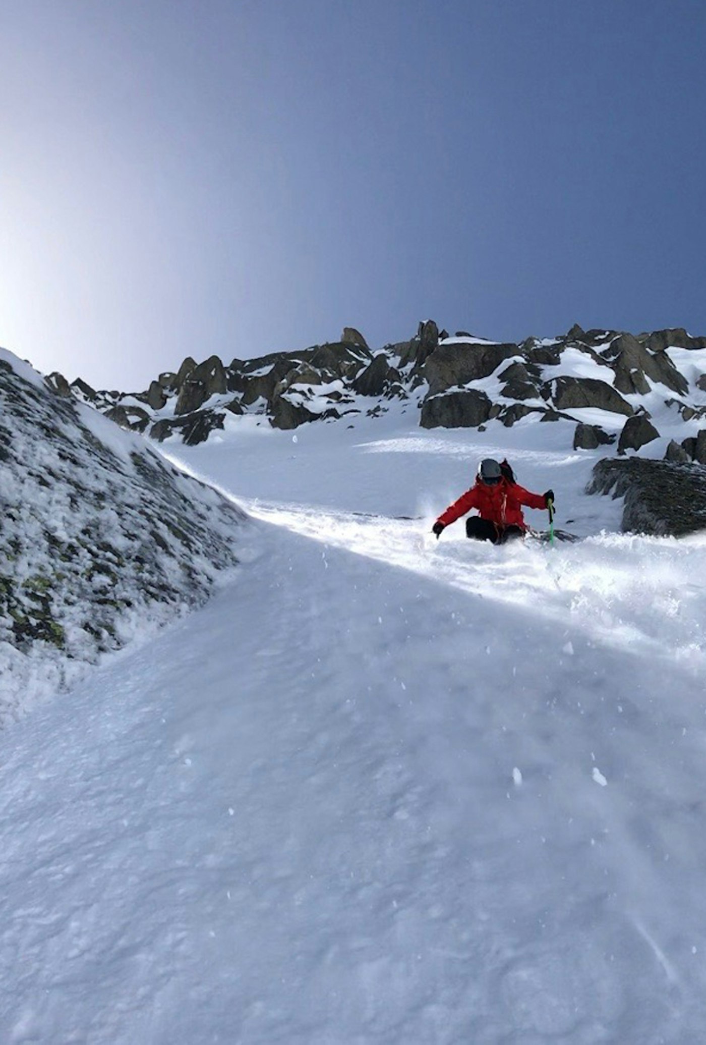 Due to the nature of the face, we hopped our way through technical cruxes that consumed much of the line, only opening the throttle on rare occasions where the terrain permitted. The whole route was steep, committing and no-fall in nature; yet the lack of direct sunlight since the last snowfall made for some dreamy turns through boot-top pow. In all, the euphoric combination of perfect weather, great company and idyllic springtime pow made for an unforgettable day on the Mount Blanc Massif.
