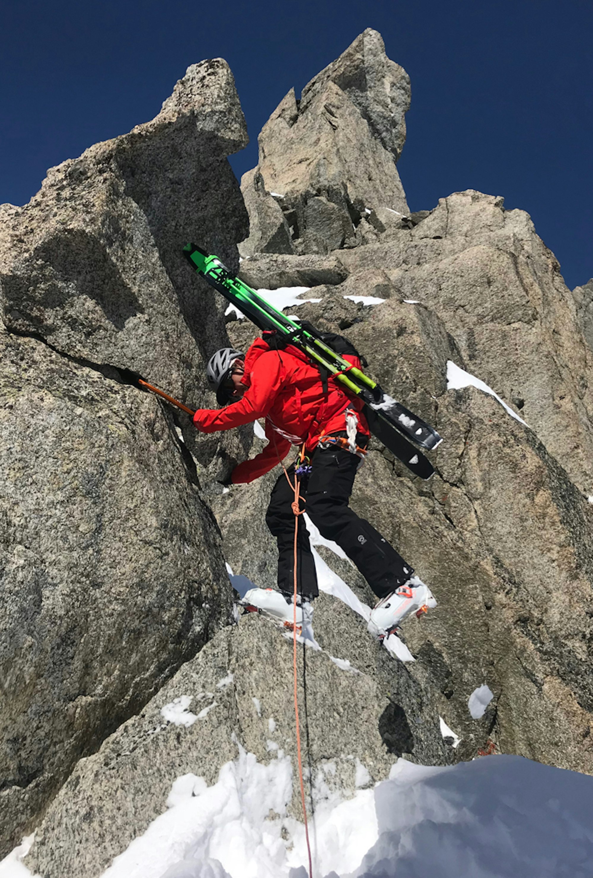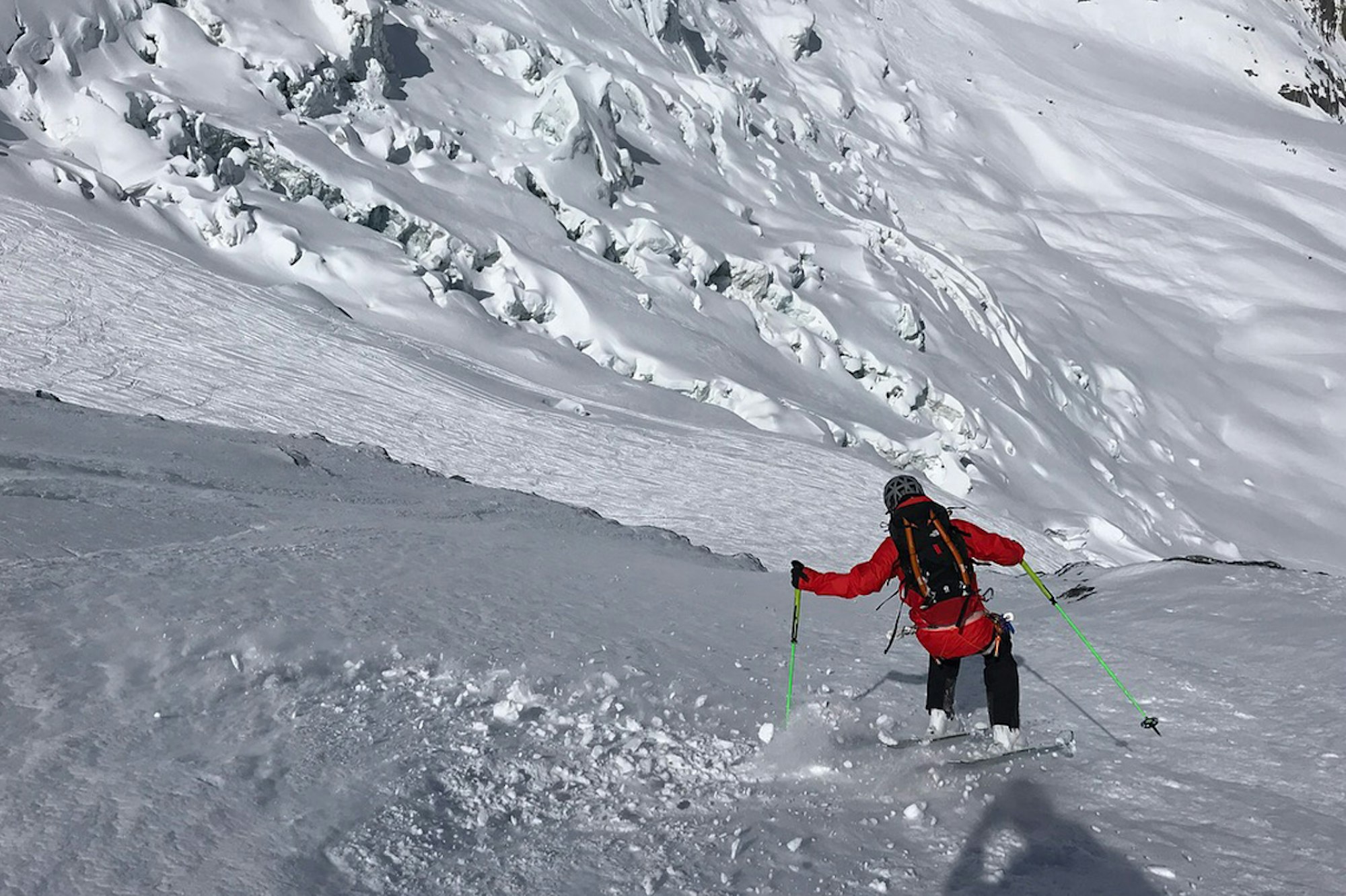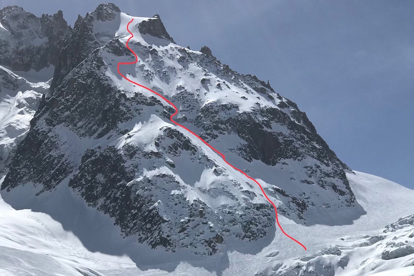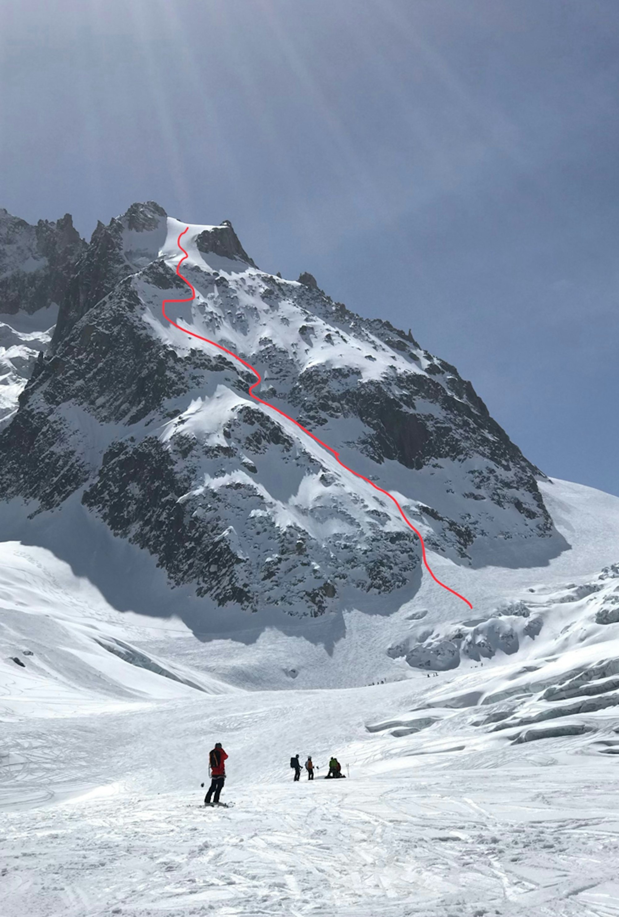 Due to the nature of the face, we hopped our way through technical cruxes that consumed much of the line, only opening the throttle on rare occasions where the terrain permitted. The whole route was steep, committing and no-fall in nature; yet the lack of direct sunlight since the last snowfall made for some dreamy turns through boot-top pow. In all, the euphoric combination of perfect weather, great company and idyllic springtime pow made for an unforgettable day on the Mount Blanc Massif.