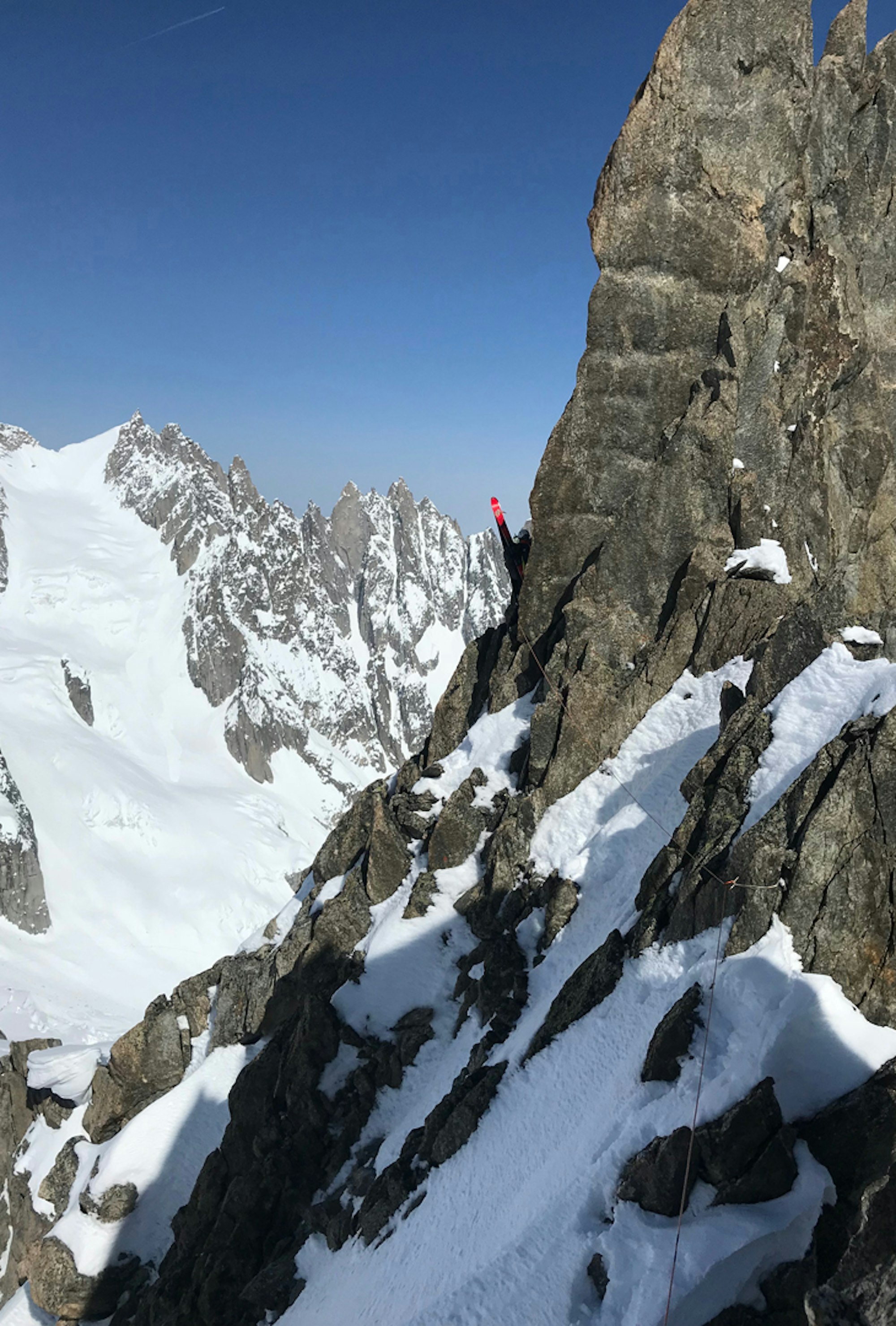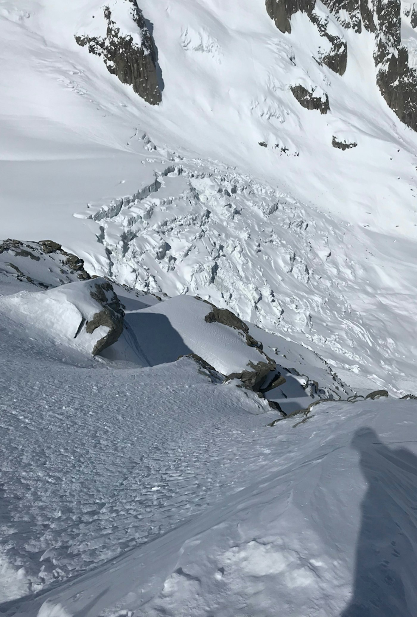 It’s quite the aesthetic line, too. The descent takes you almost 3,300-feet down, starting from a hanging glacier as you weave your way around cliff bands and through constrictions. The line empties you out at the base of the ultra-classic Vallée Blanche glacier just as it connects to the largest glacier in France, the Mer de Glace. We planned to make our descent on a beautiful Saturday in one of the most popular valleys in the world and we knew our every move would be on display to the thousands recreating on the glaciers below. If we took a tumble, we could not only die, but worse, end up embarassed on Jerry of the Day.