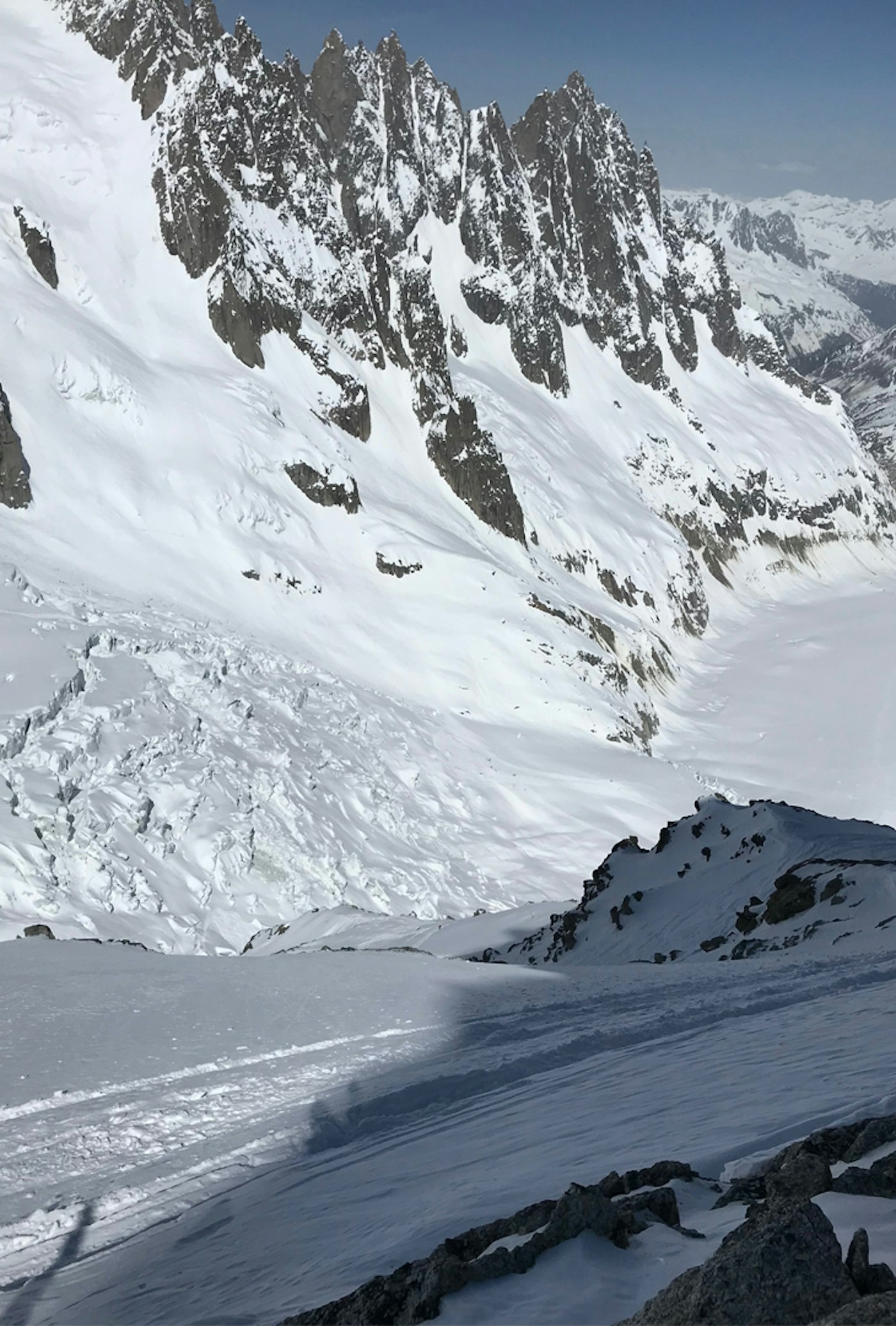 We followed the fixed ropes out of the summit station, boot skiing most of the way until we were in the clear to clip in and start the descent. It was truly a perfect morning. There was almost no wind, not a cloud in the sky and temps warm enough to melt away our giddish levels of stoke. Our traverse across the mouth of the Vallée Blanche took us around the Gros Rognon and under Mont Blanc du Tacul to the base of the Vallée Noire.