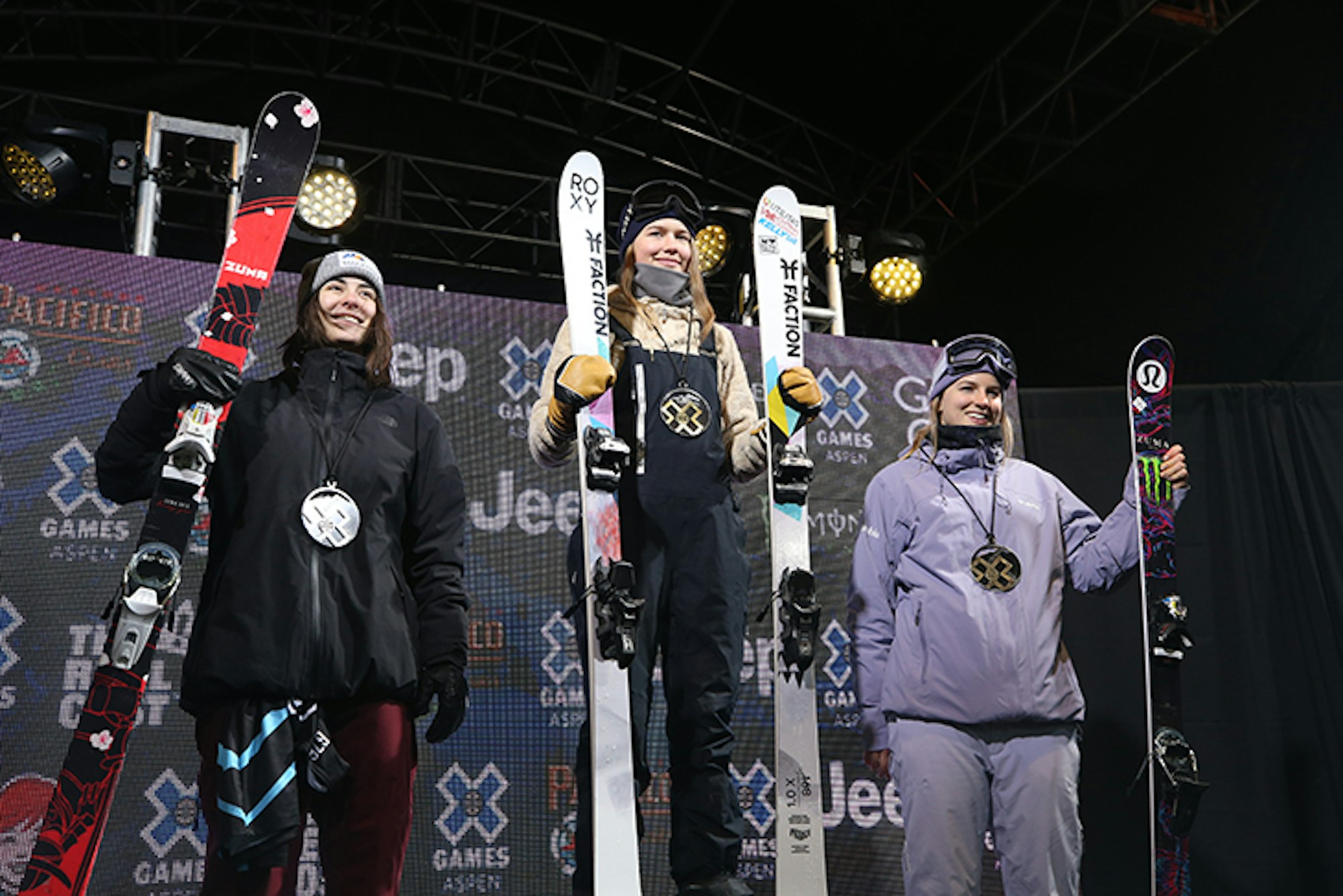The Women’s Superpipe Podium. L to R: Rachael Karker, Kelly Sildaru, Cassie Sharpe. Photo: Gabriel Christus / ESPN Images