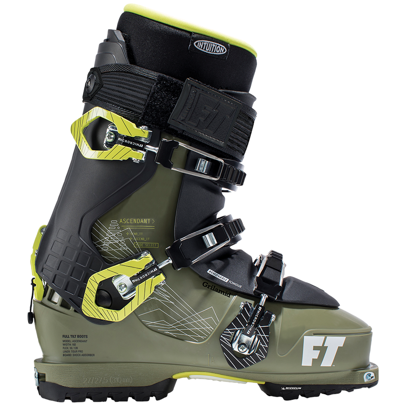 The call has been answered for all of you Full Tilt loyalists out there—and we know there are a certified army of you—who have been pleading with the company to produce a touring boot. The new Ascendant’s shell and tongue are made of Grilamid, which bestows it with a lightweight yet strong character, while a polyurethane cuff provides the dampness needed to hold on during burly backcountry descents. The boot features a hike mode with a 60-degree range of motion sans tongue (40 degrees with the tongue attached), as well as the brand-new Intuition Tour Pro liner (complete with a flexible notch in the heel), two elements that, combined, translate to über-efficient uphill striding. The boot comes standard with alpine ISO 5355 soles but is shipped with rockered Michelin ones, too.