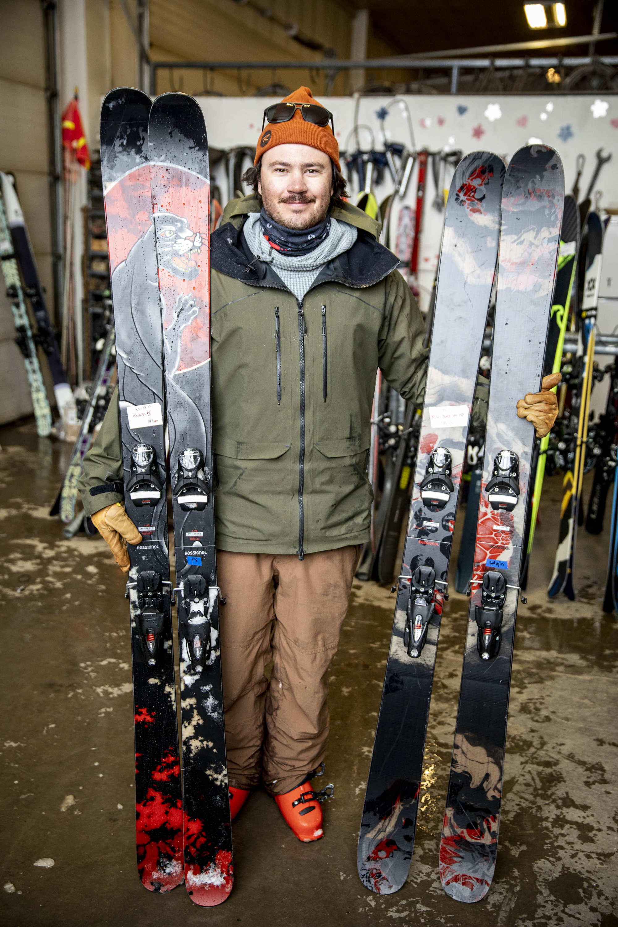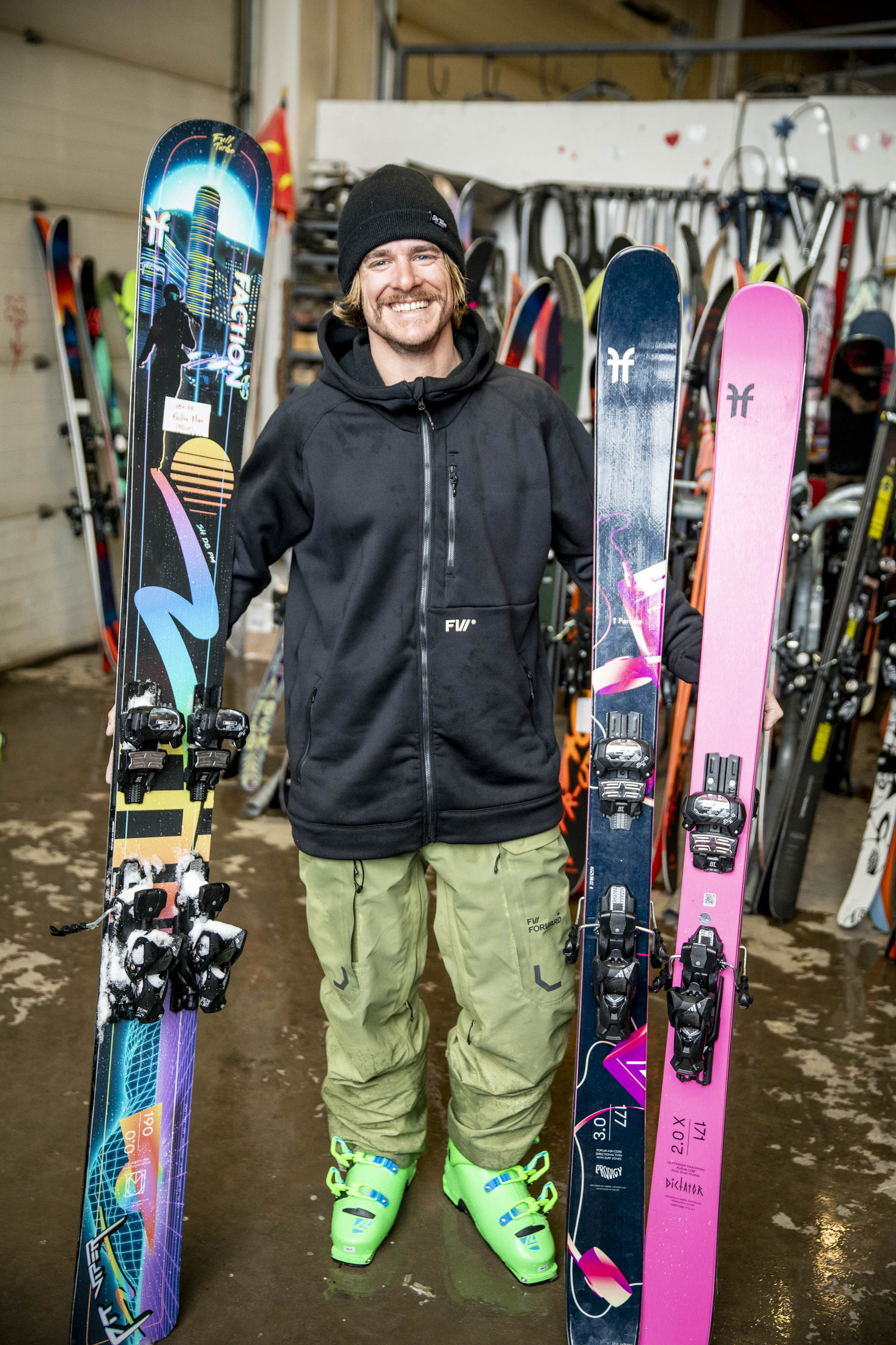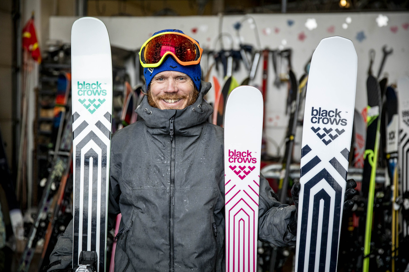 Black Crows’ Mikey Hovey with the flock’s updated 19/20 skis, the Atris (left) Camox Birdie (middle) and Nocta.