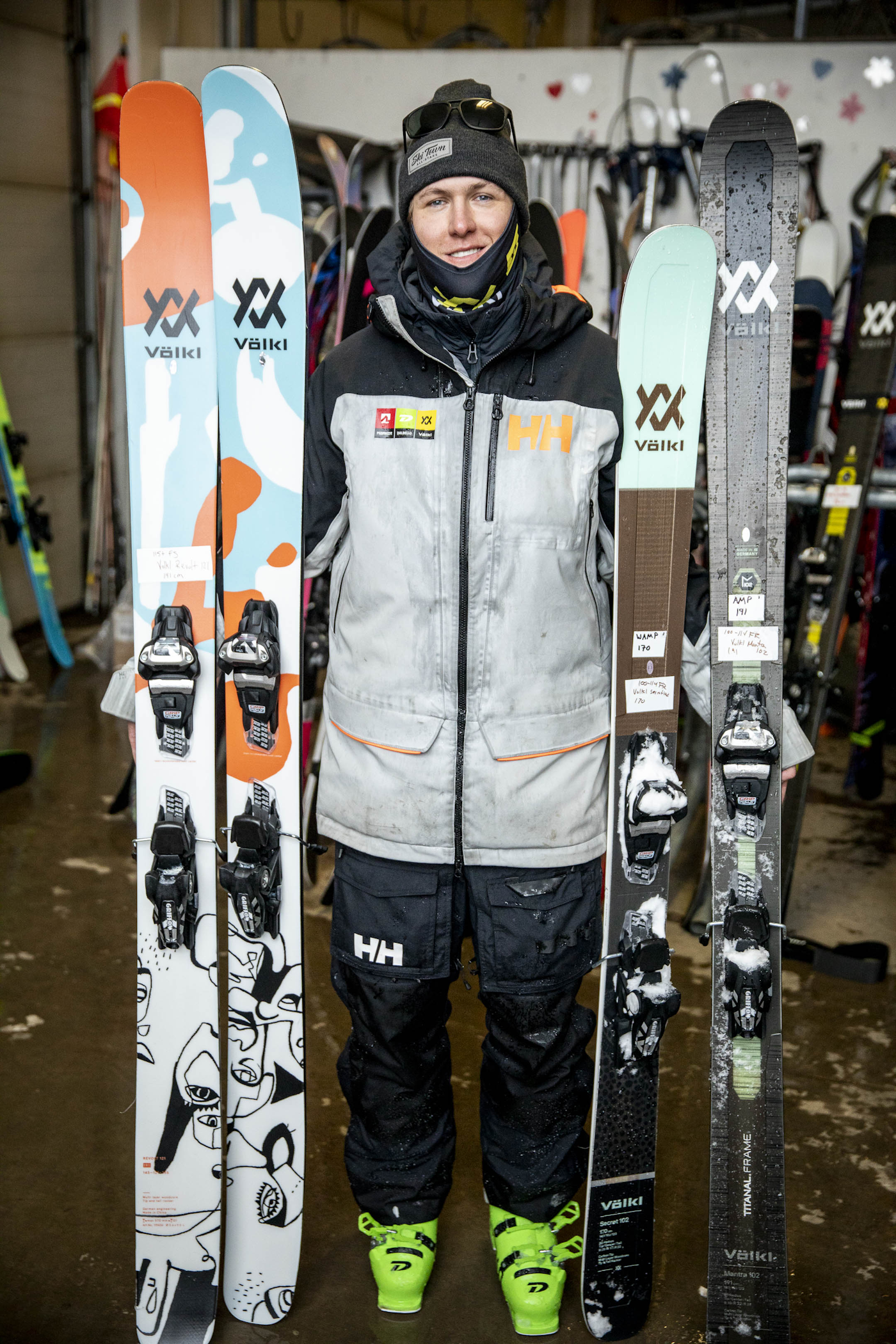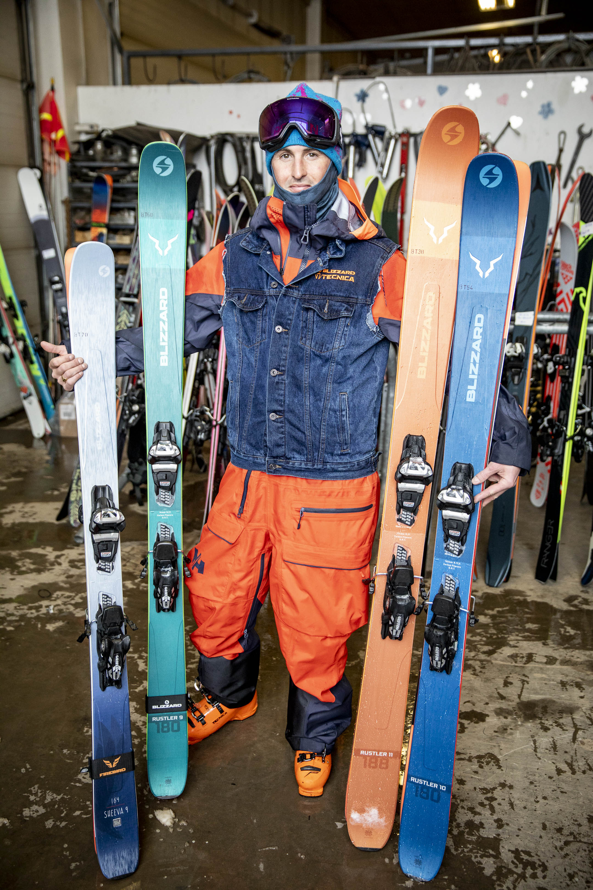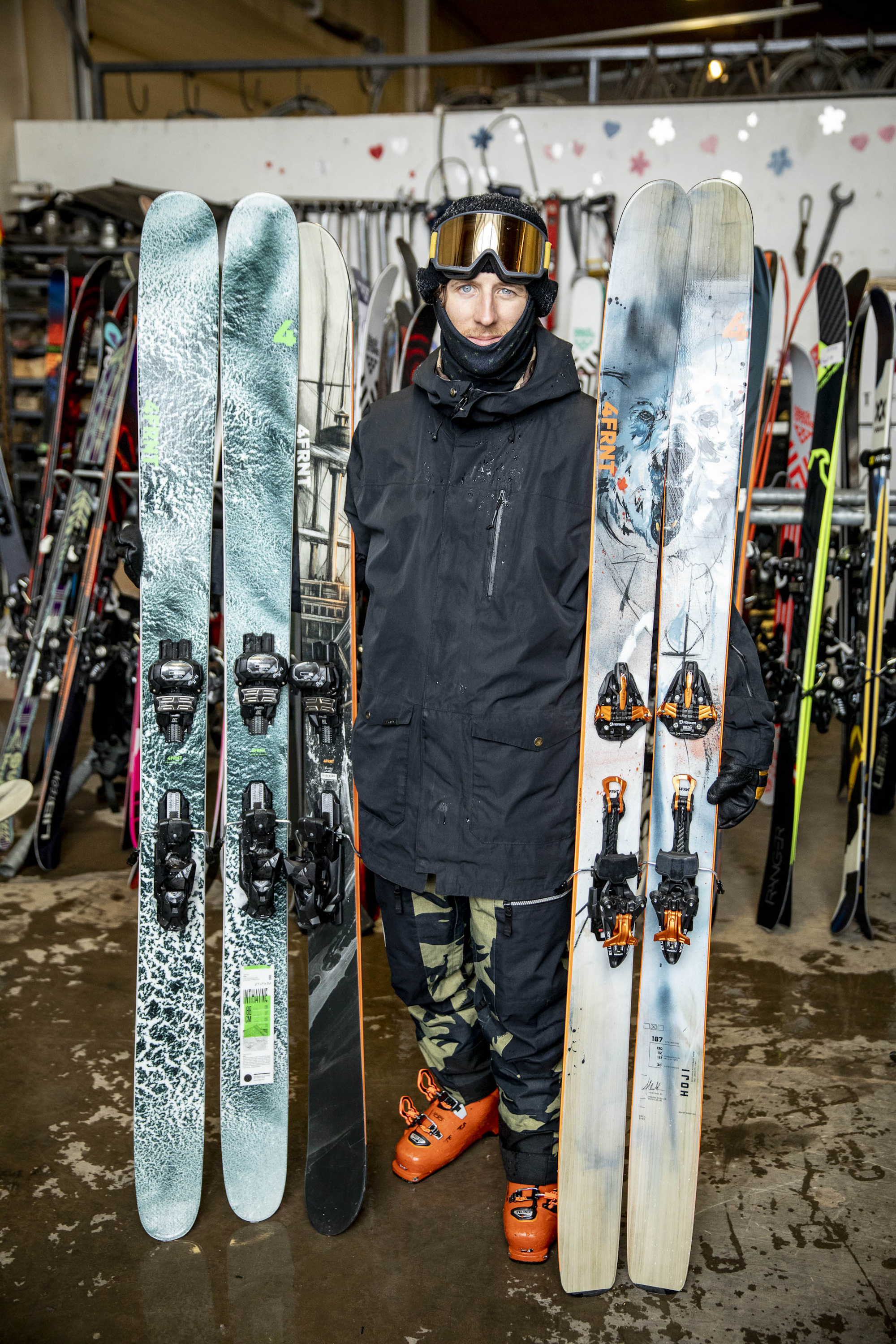 Black Crows’ Mikey Hovey with the flock’s updated 19/20 skis, the Atris (left) Camox Birdie (middle) and Nocta.