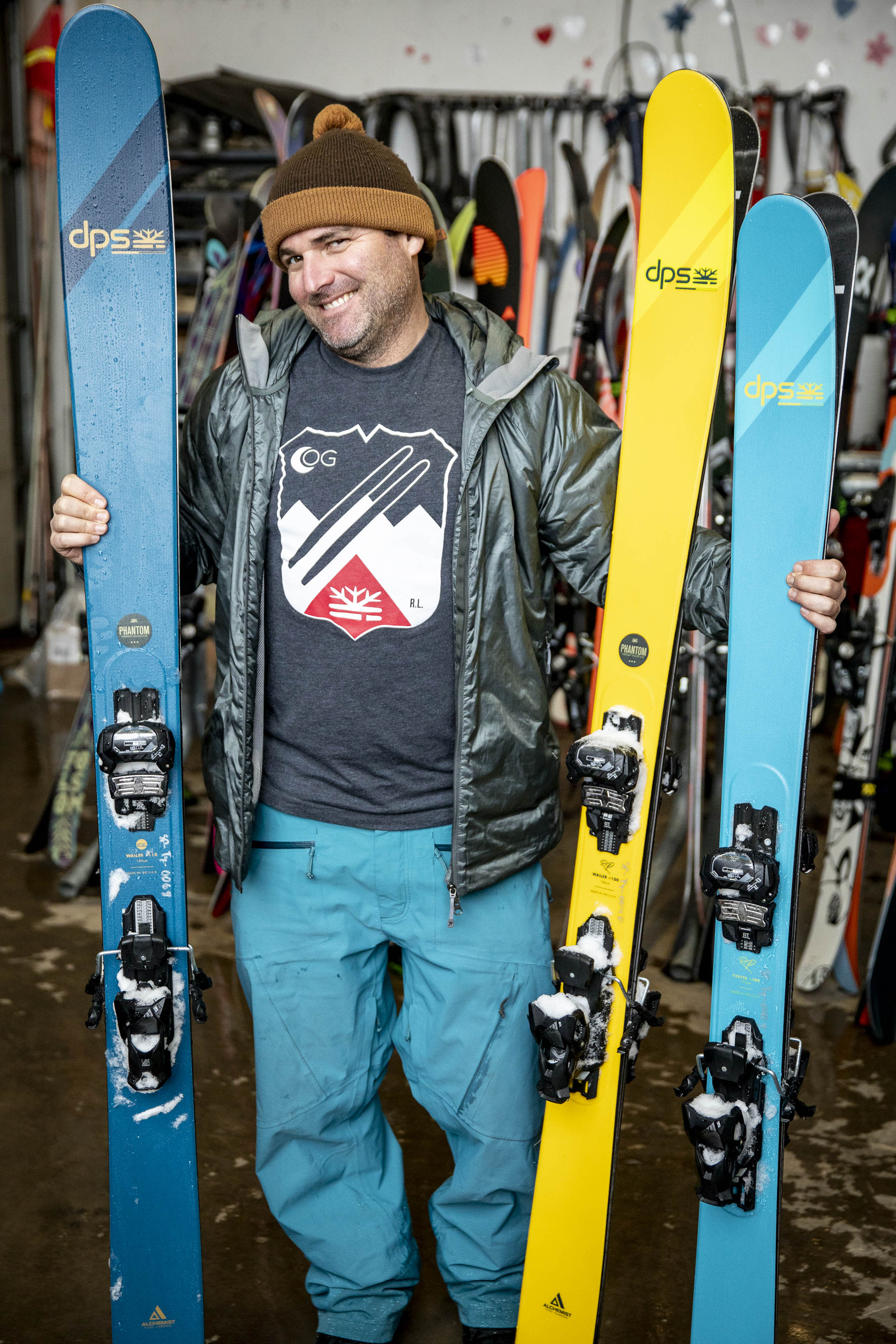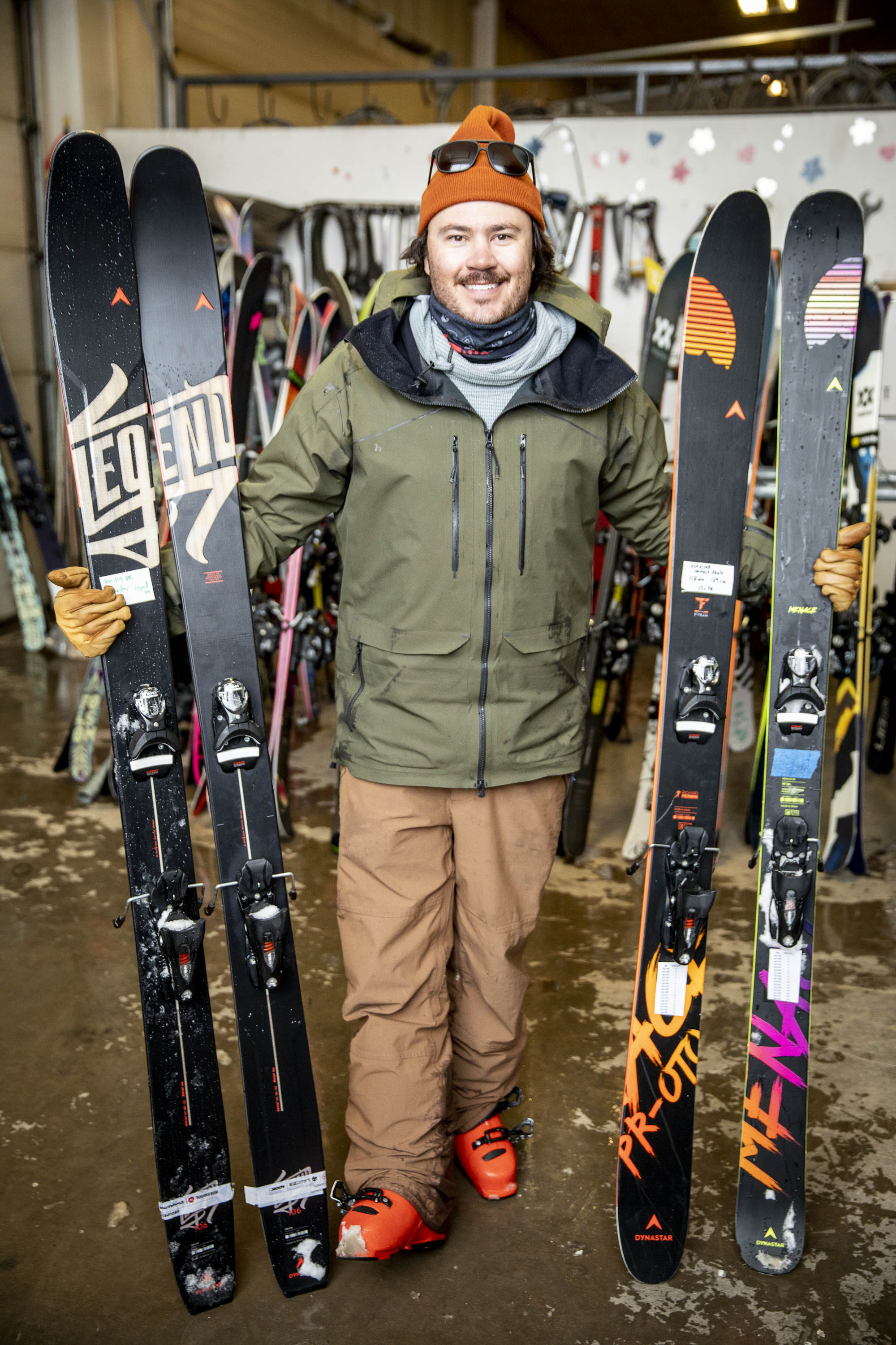 DPS Skis’ Alex Hunt gives a smirk alongside the Wailer A110 (left), Wailer A100 (center) and Yvette A100, all treated with Phantom.