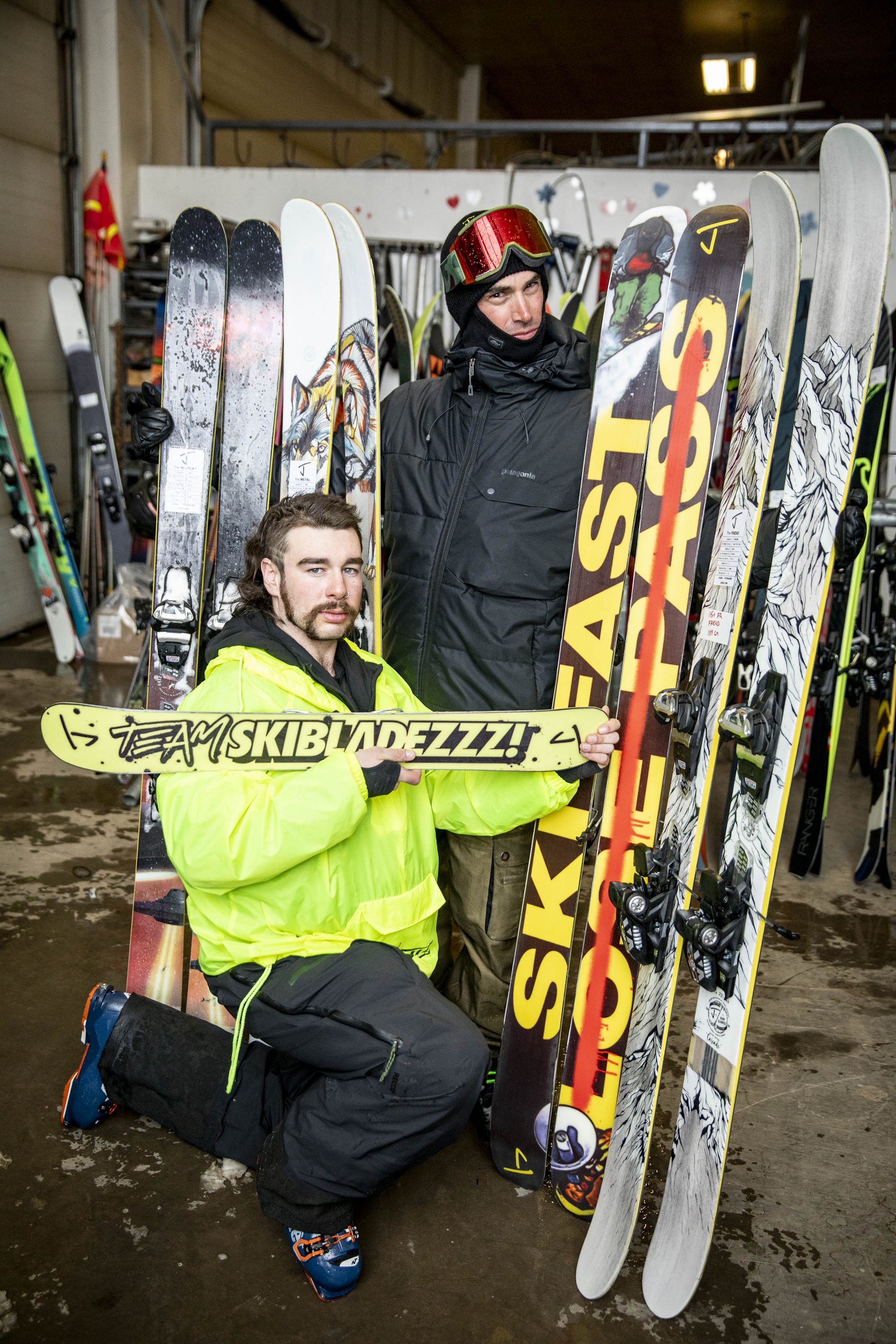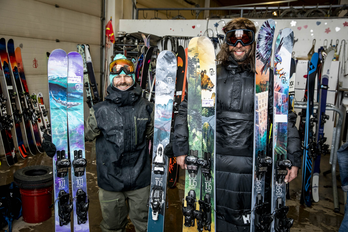 Jason Levinthal and Taylor Bibaud of J Skis keep the mood lighthearted as they show off next year’s flagship models.
